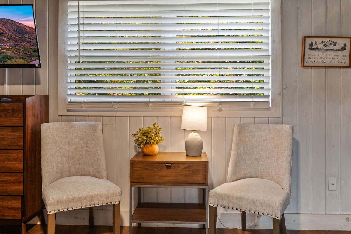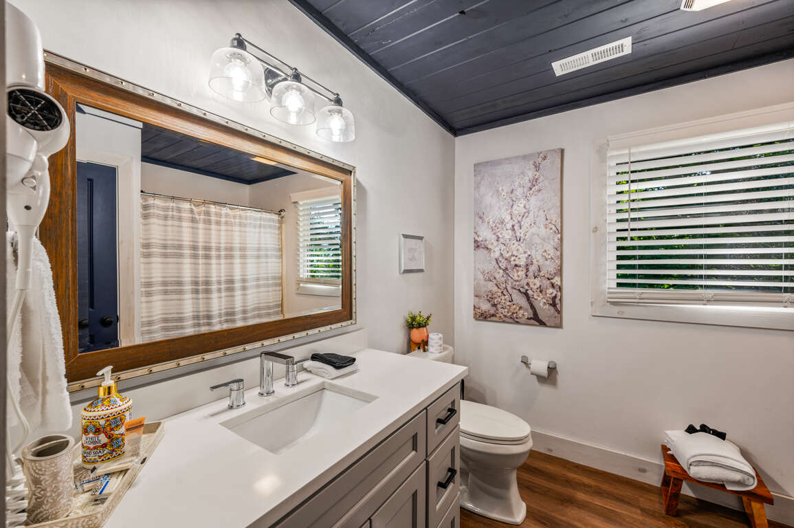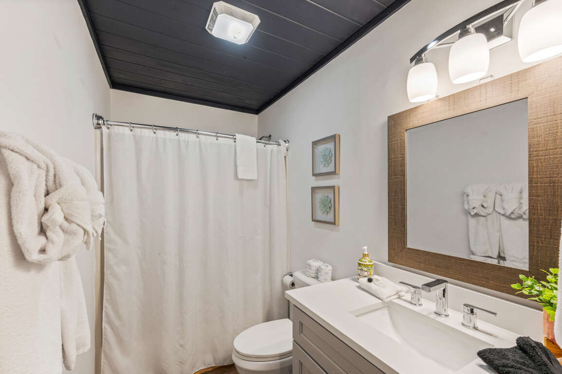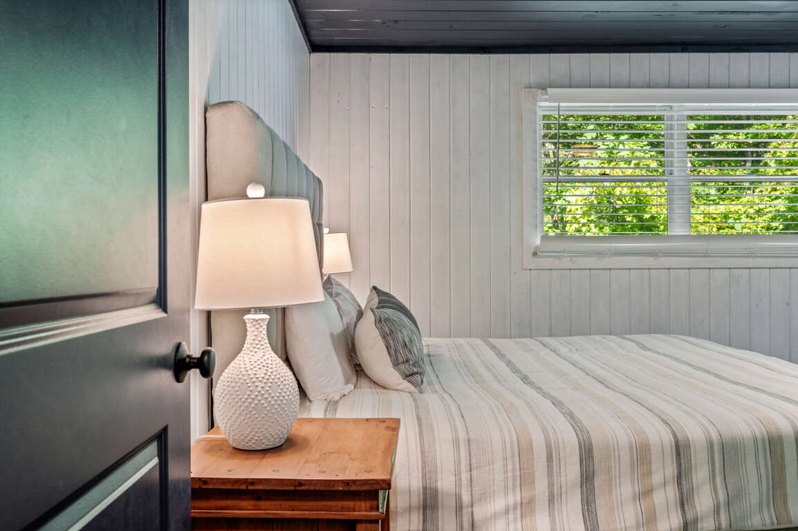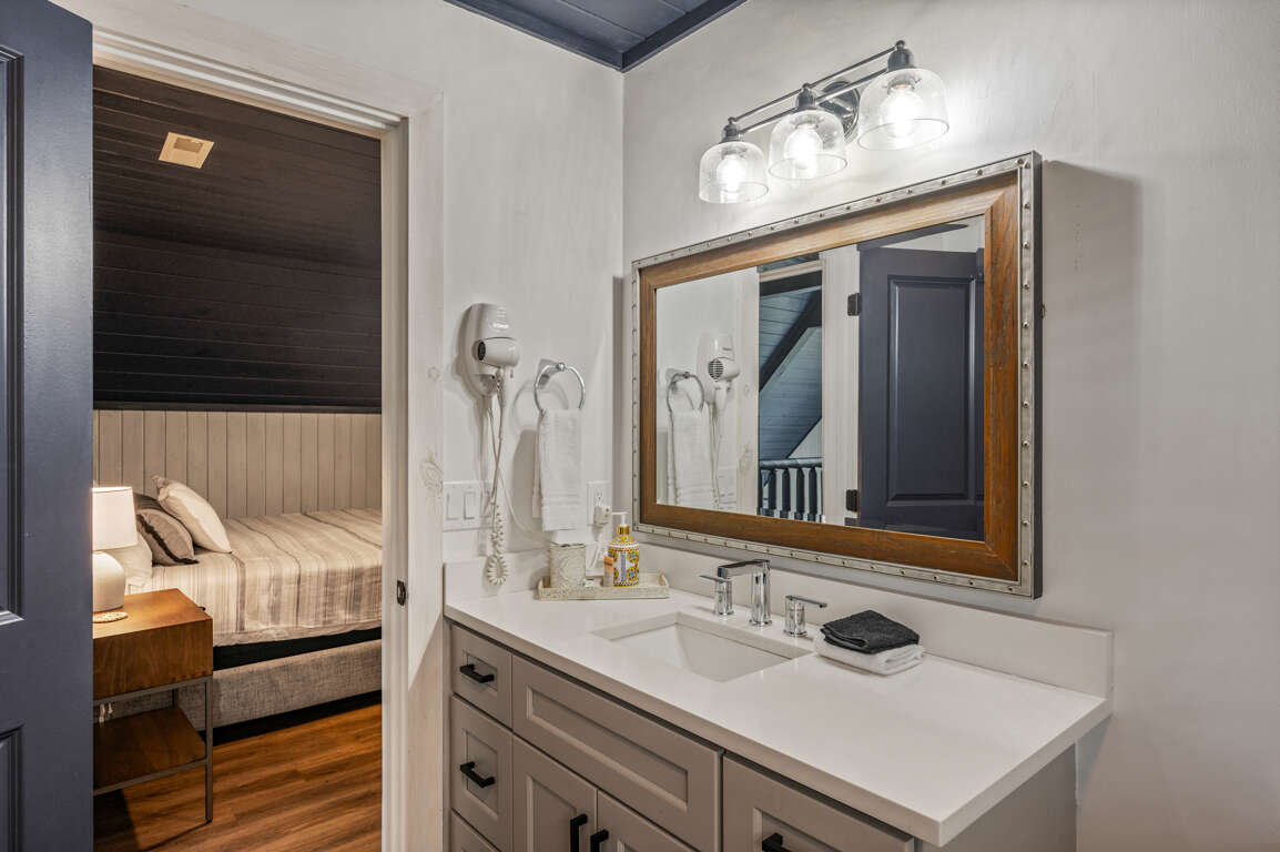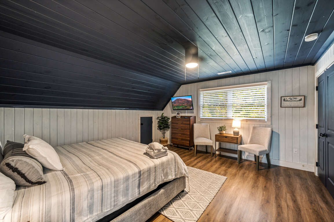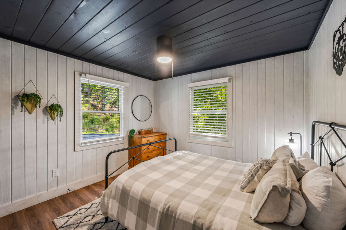On the main floor, you’ll find the other two bedrooms and their shared bathroom. One room with another king bed and a queen in the other.