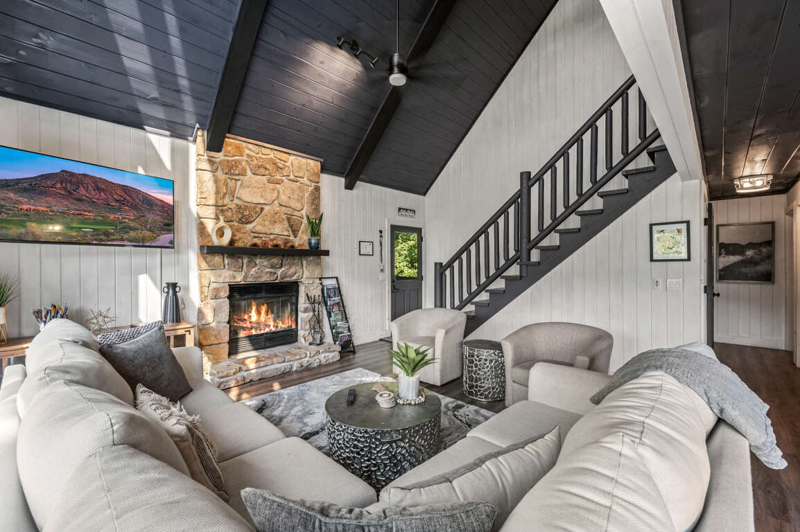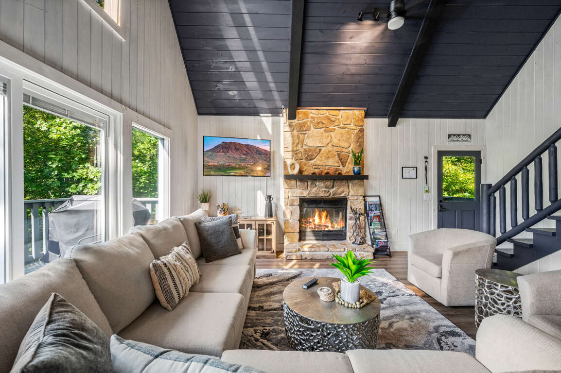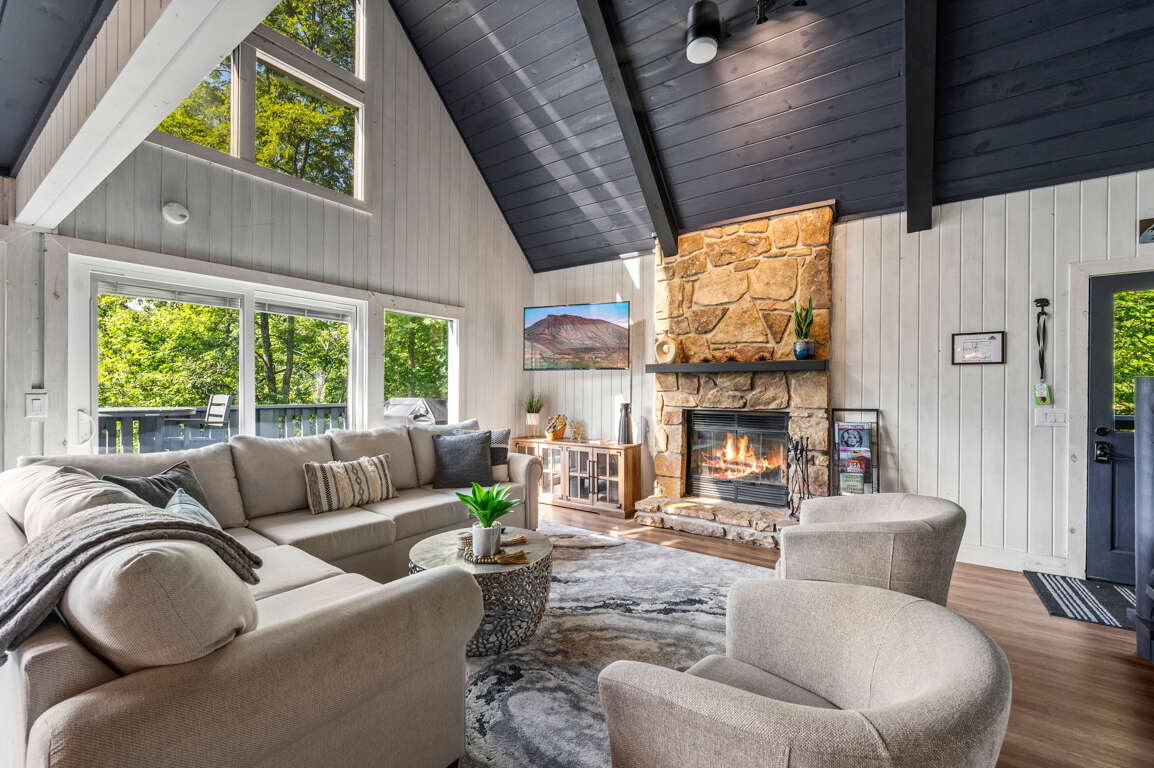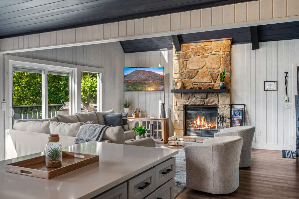 When you walk into the home, you’ll be greeted by the grandiose stone fireplace and modern living room glowing from the wall of windows that let natural light filter in. There’s plenty of space to spread out on the main floor but the open concept allows for seamless connections between the living space, the kitchen, the deck, and the dining areas.