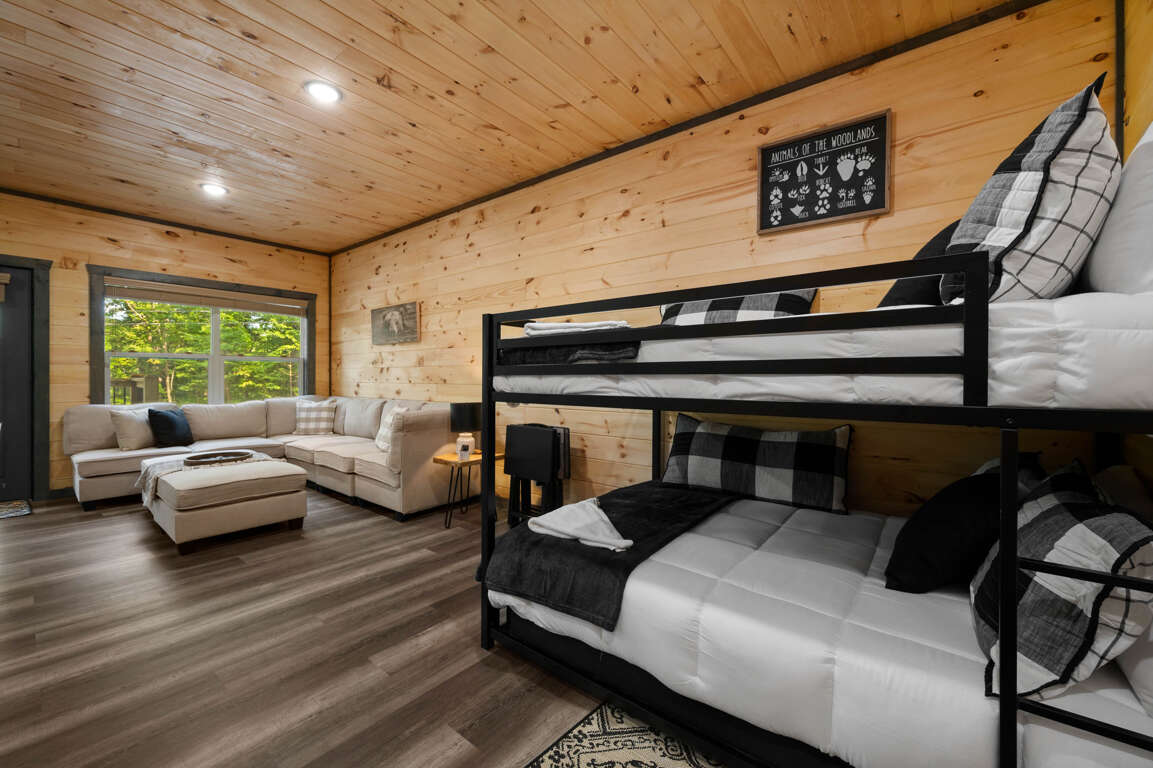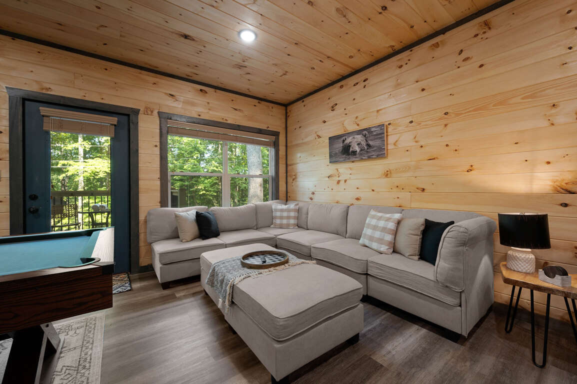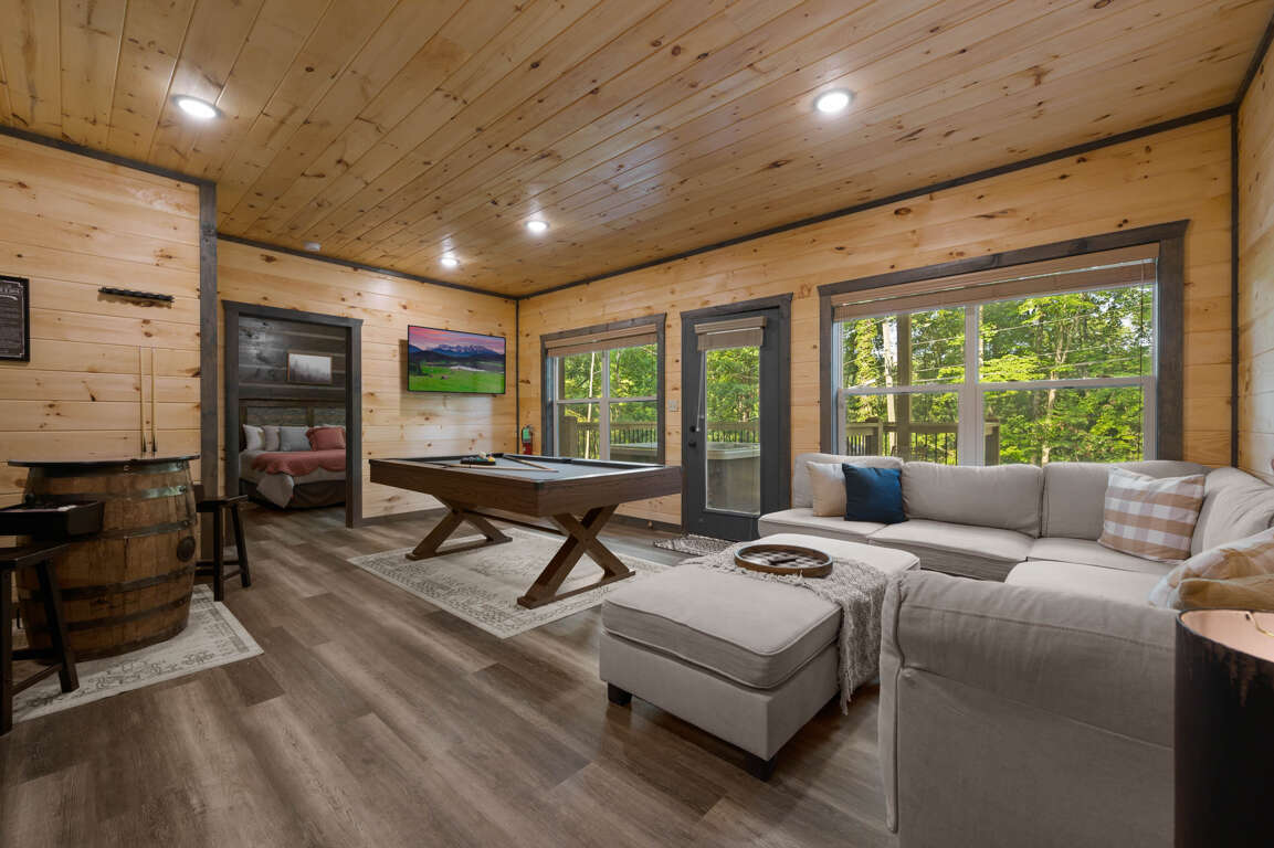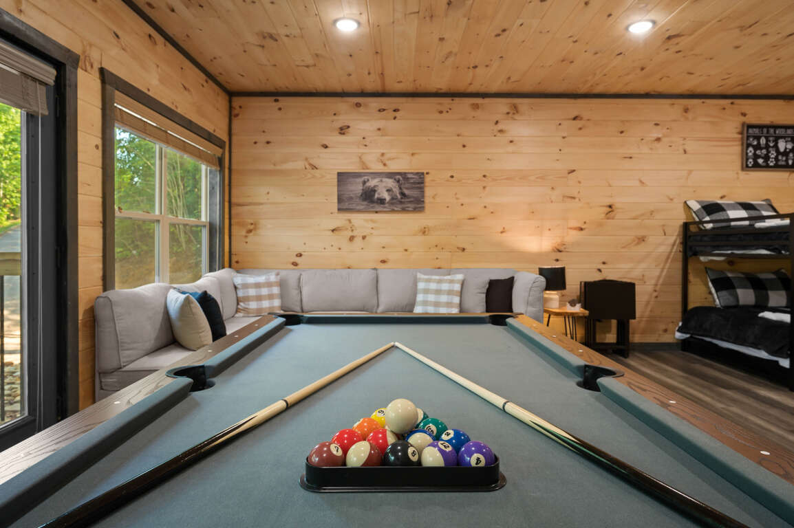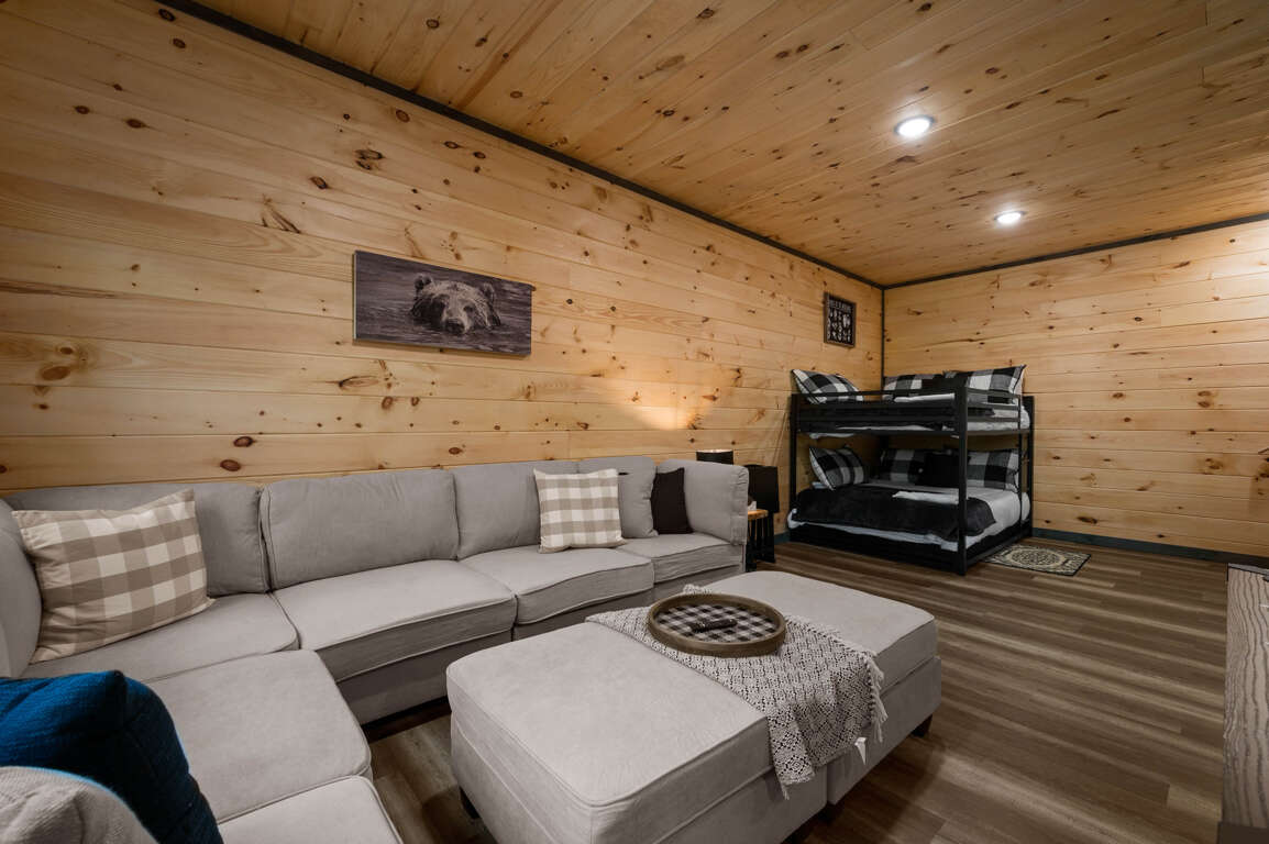 Rec Room: Head downstairs to the rec room for hours of entertainment. Play classic arcade games like PacMan, Donkey Kong, or Galaga on the multi-cade, challenge friends to a game of pool, or relax on the oversized sectional to watch the big game. This room also includes a full-over-full bunk bed for additional sleeping space.