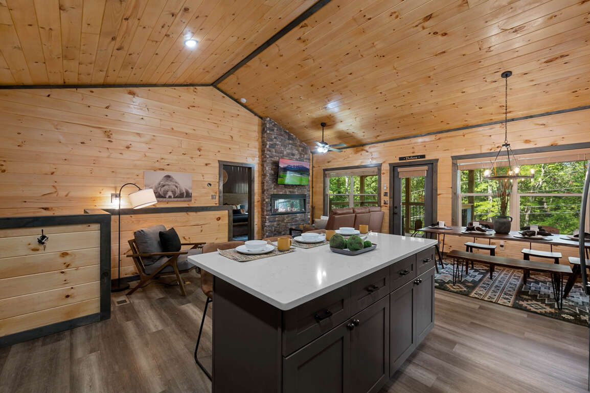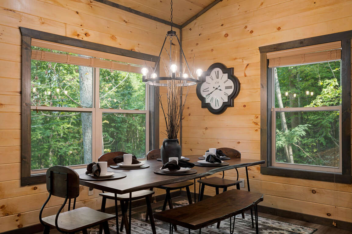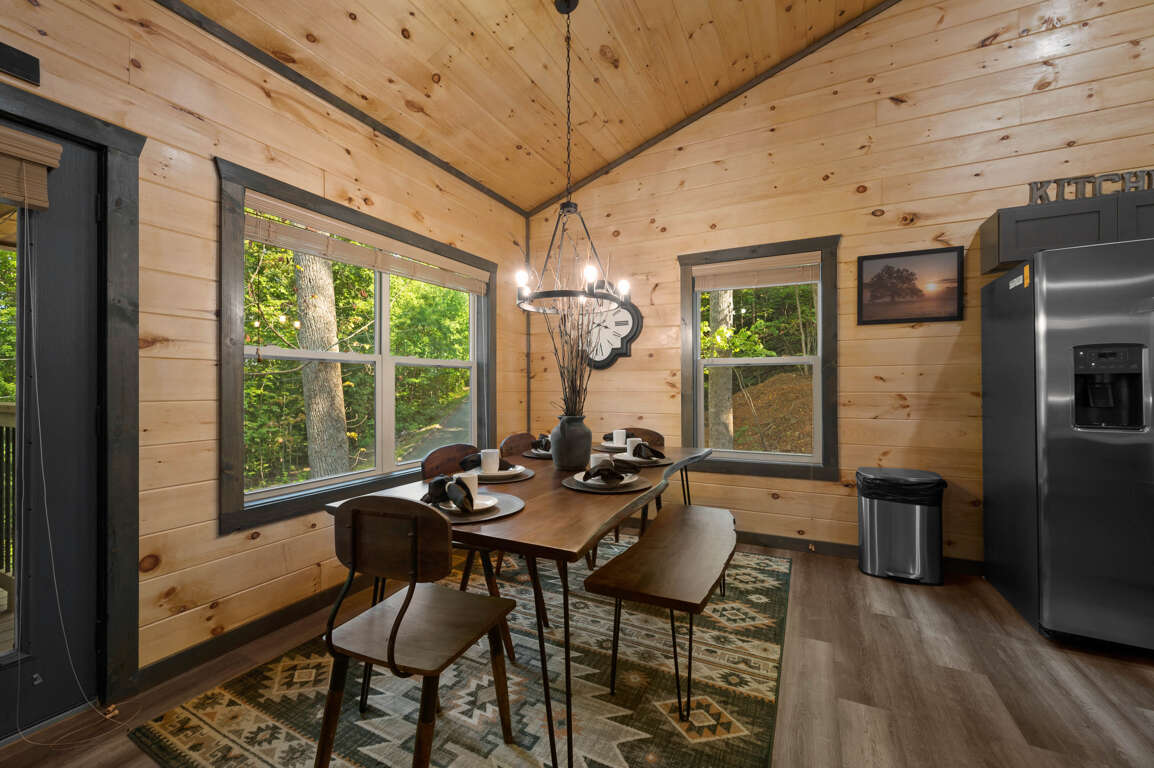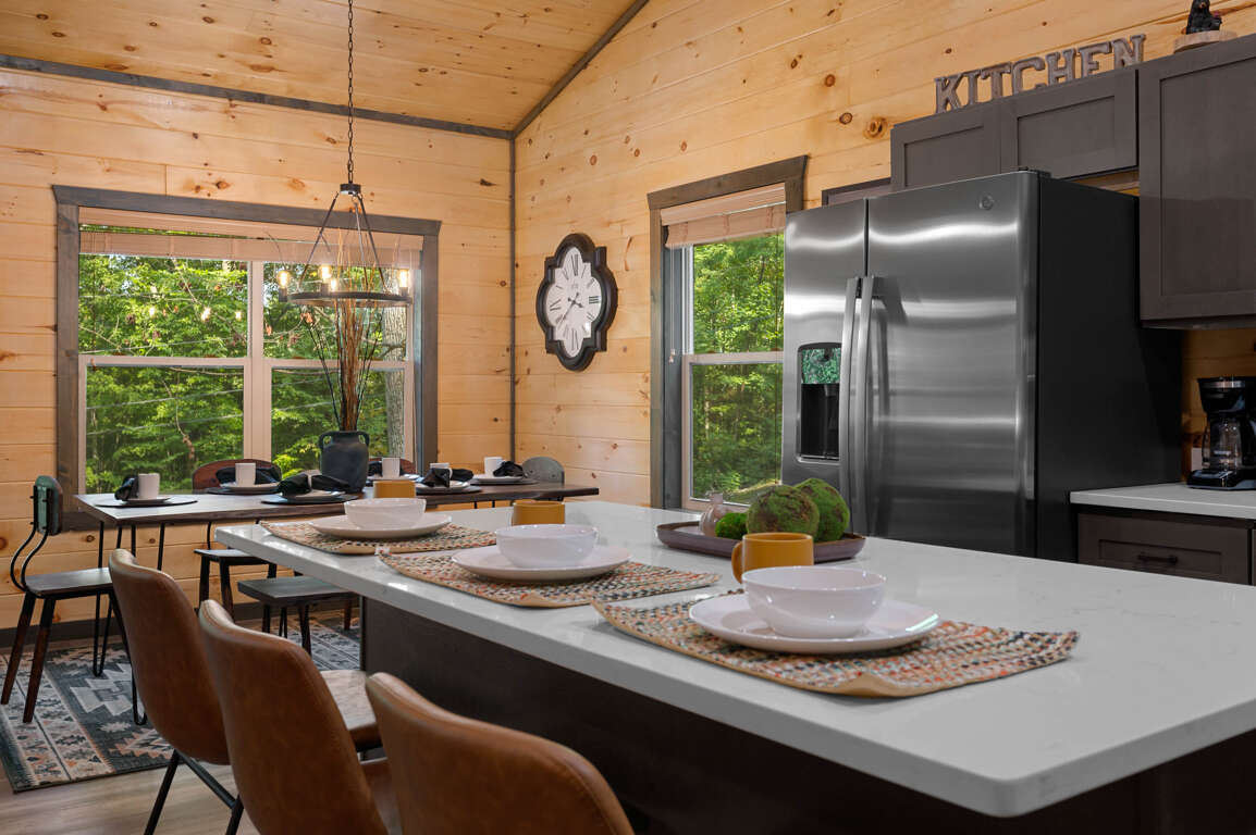Dining Area: The dining area features a live edge table with chairs and benches for 8, plus bar seating for 3, ensuring ample space for everyone. Host a friendly game night or enjoy a family meal together in this inviting space.