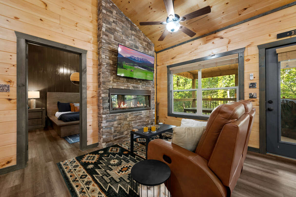 Living Room: Relax in the cozy living room, featuring a stacked stone, electric fireplace, comfortable couch, and a big-screen Amazon Fire Smart TV. Spend your evenings catching up with loved ones, planning your next adventure, or enjoying a movie night by the warm fireplace.