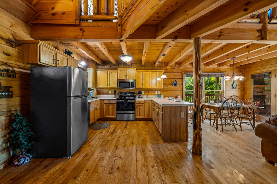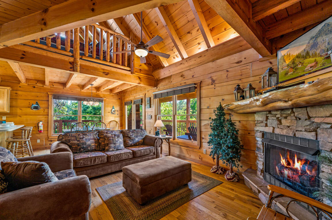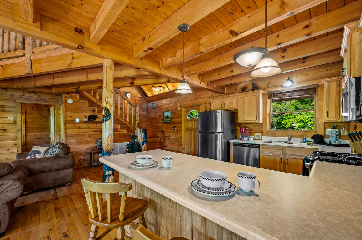Relax in the cozy living room with views of the Smokies out of the windows. Featuring a stone, gas fireplace, a couch (sleeper sofa), and a big-screen TV! Catch up with one another or make plans for the day. And in the evenings, flip on the TV for a bit of entertainment or gather around the fireplace for bedtime stories. Indoor fireplace is available from October 1 - March 31.