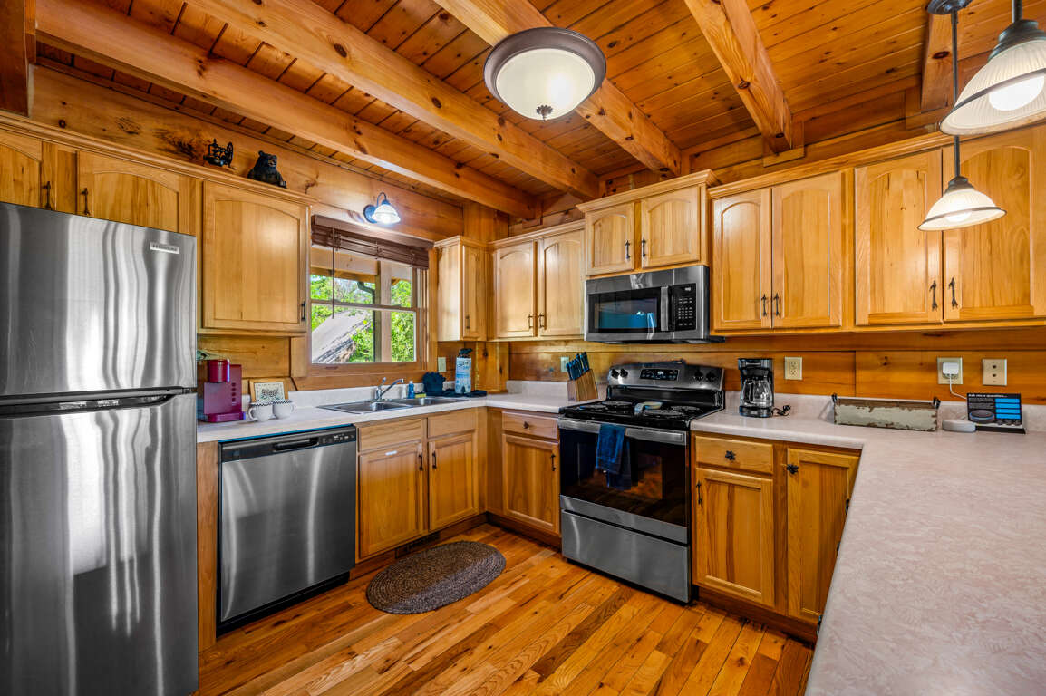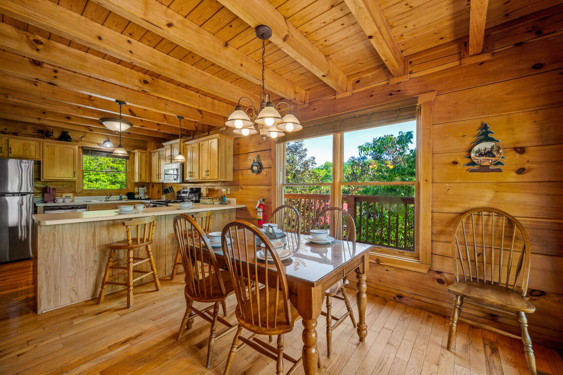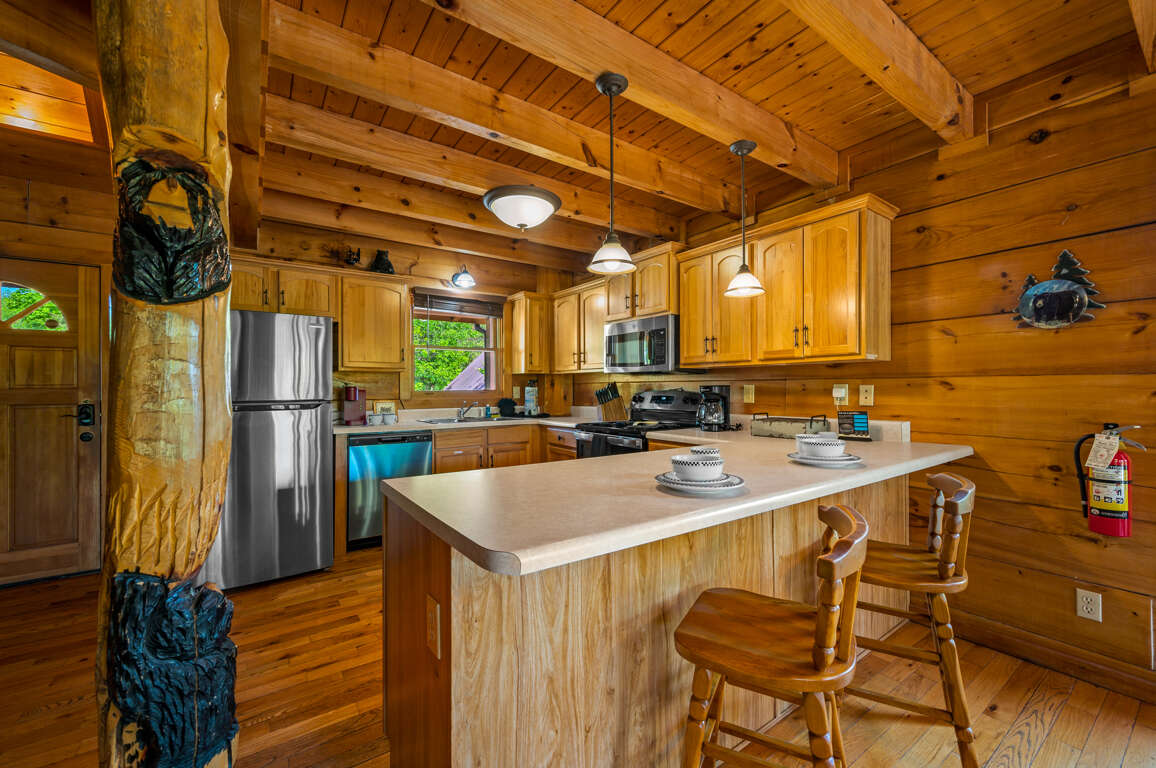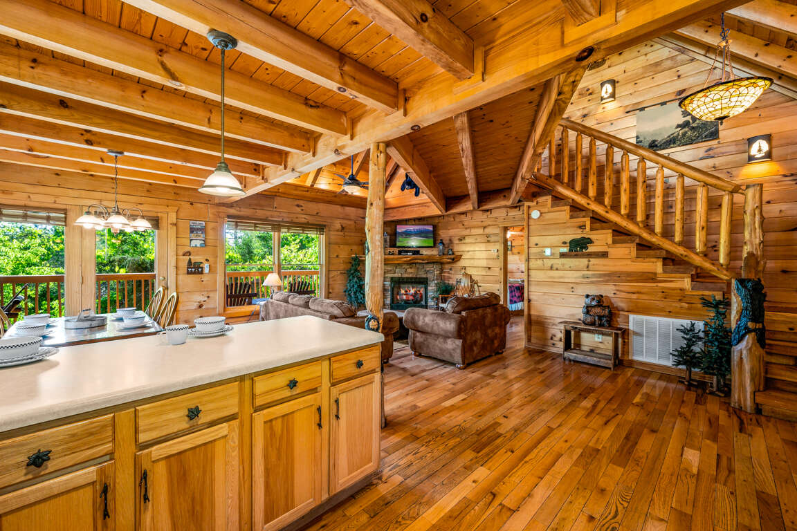 Relax in the cozy living room with views of the Smokies out of the windows. Featuring a stone, gas fireplace, a couch (sleeper sofa), and a big-screen TV! Catch up with one another or make plans for the day. And in the evenings, flip on the TV for a bit of entertainment or gather around the fireplace for bedtime stories. Indoor fireplace is available from October 1 - March 31.