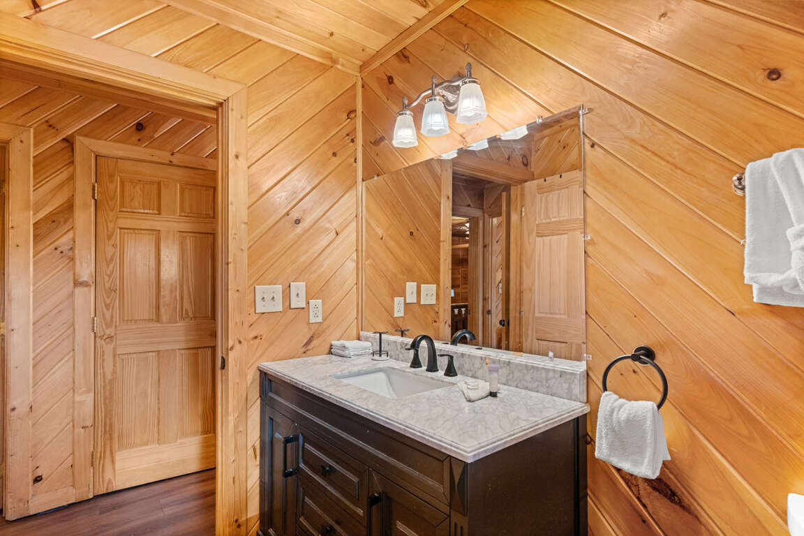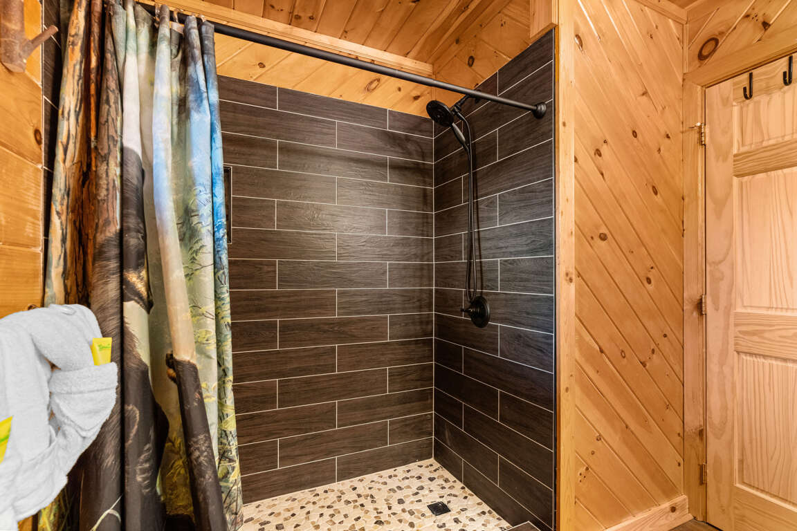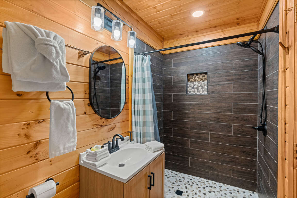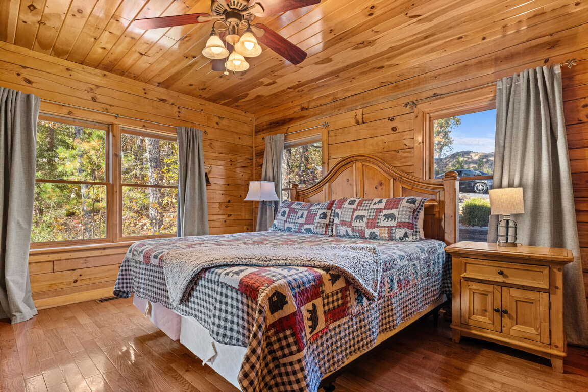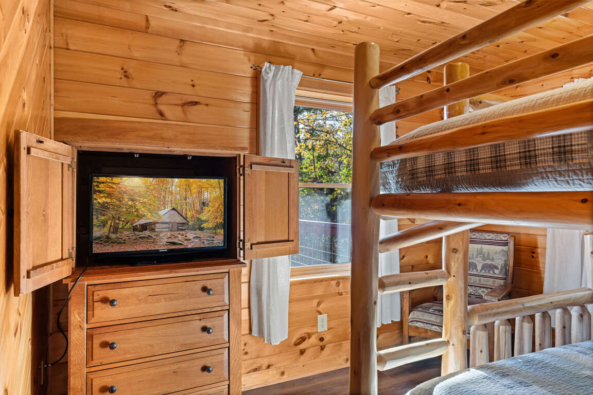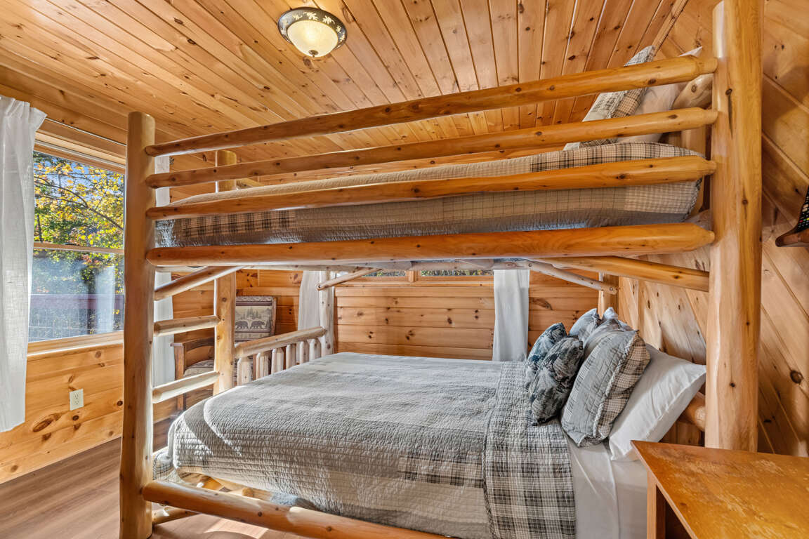 The five bedrooms are equally charming with soft quilts, rustic accents, and cozy wood finishes. The main-level king bedroom features an ensuite with a walk-in shower. Of the two upper-level king bedrooms, one offers an ensuite with a jetted jacuzzi tub and walk-in shower, and the other offers an ensuite with a standing shower. The lower level features a king bedroom with a shared full bath, as well as a queen-over-queen bunk room.