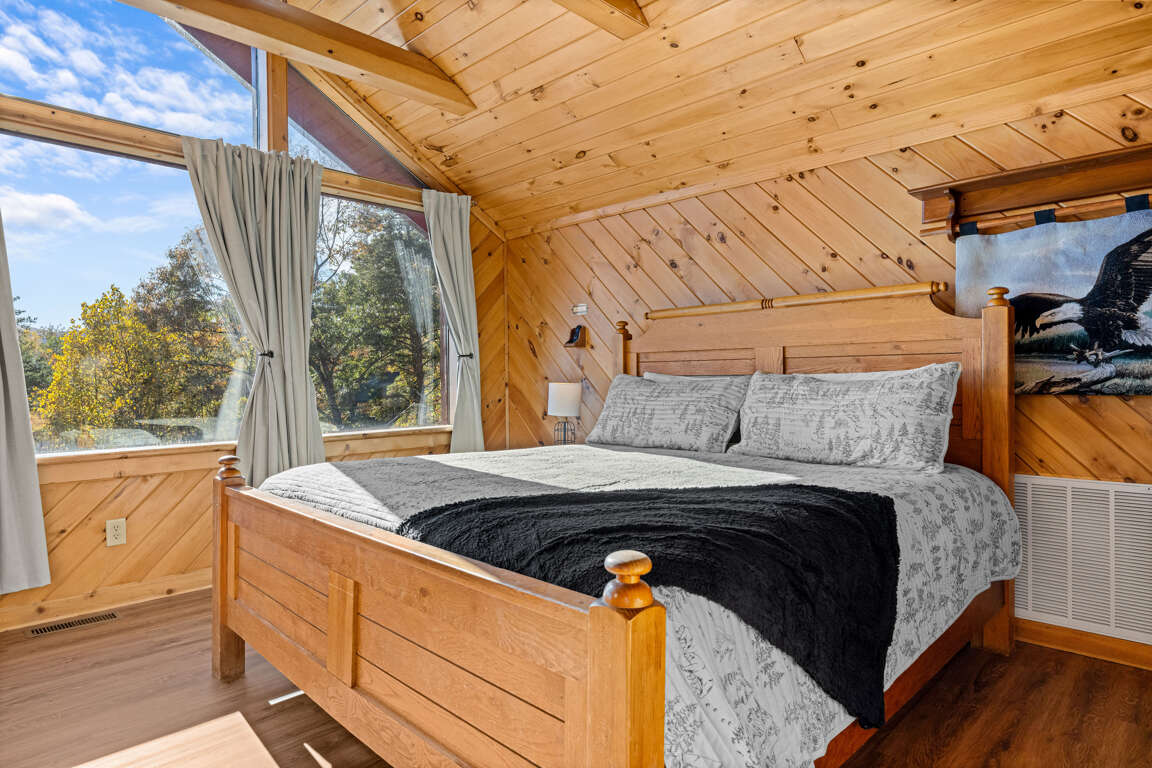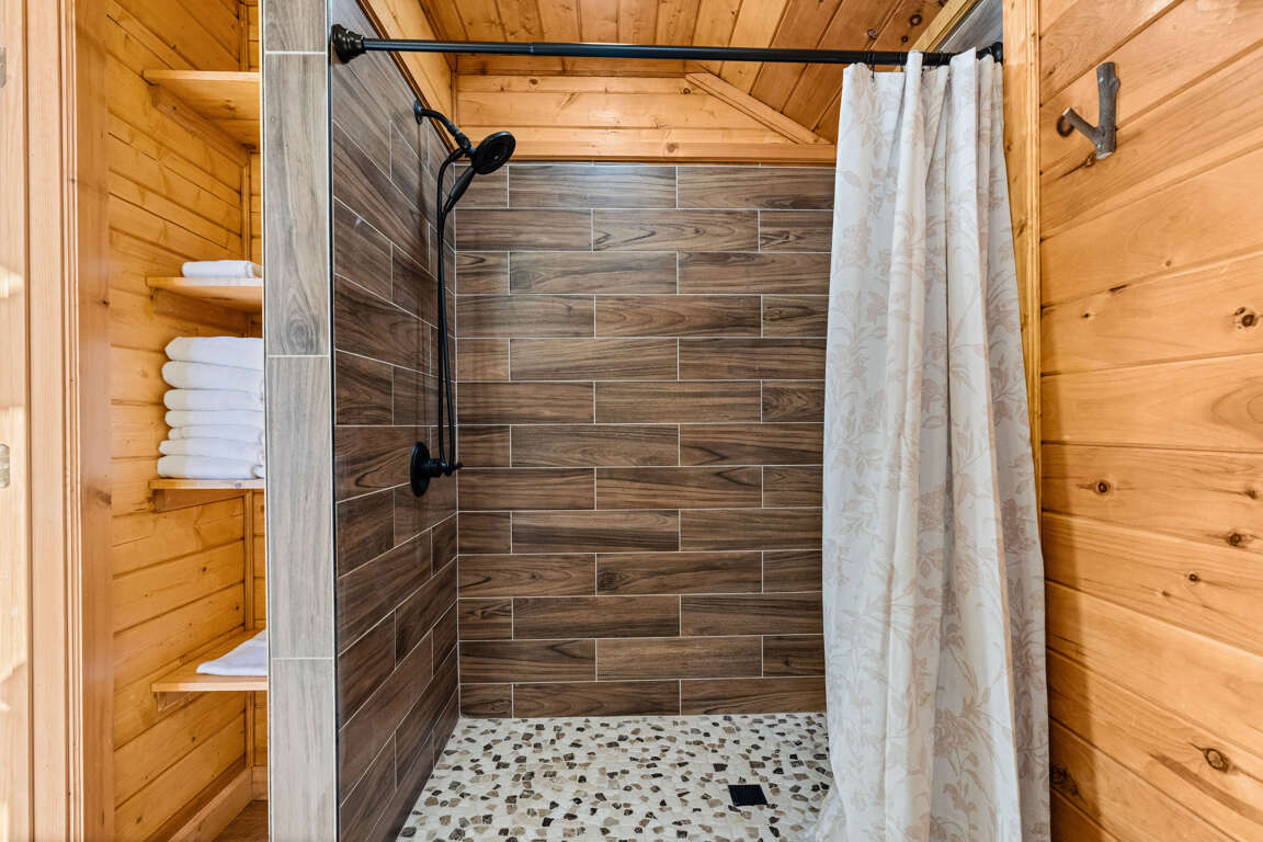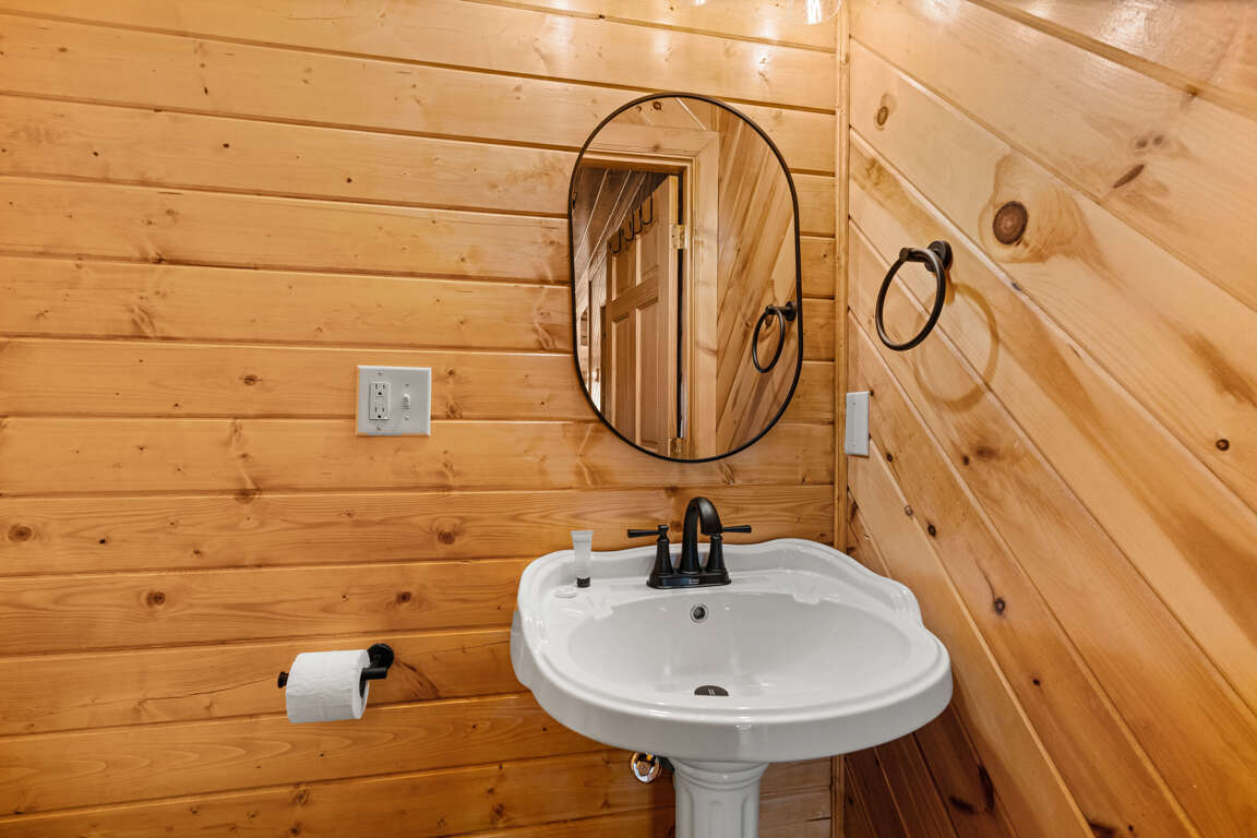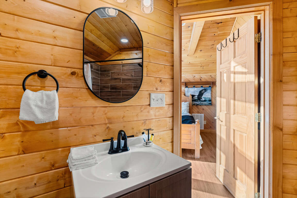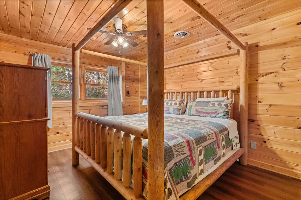 The five bedrooms are equally charming with soft quilts, rustic accents, and cozy wood finishes. The main-level king bedroom features an ensuite with a walk-in shower. Of the two upper-level king bedrooms, one offers an ensuite with a jetted jacuzzi tub and walk-in shower, and the other offers an ensuite with a standing shower. The lower level features a king bedroom with a shared full bath, as well as a queen-over-queen bunk room.