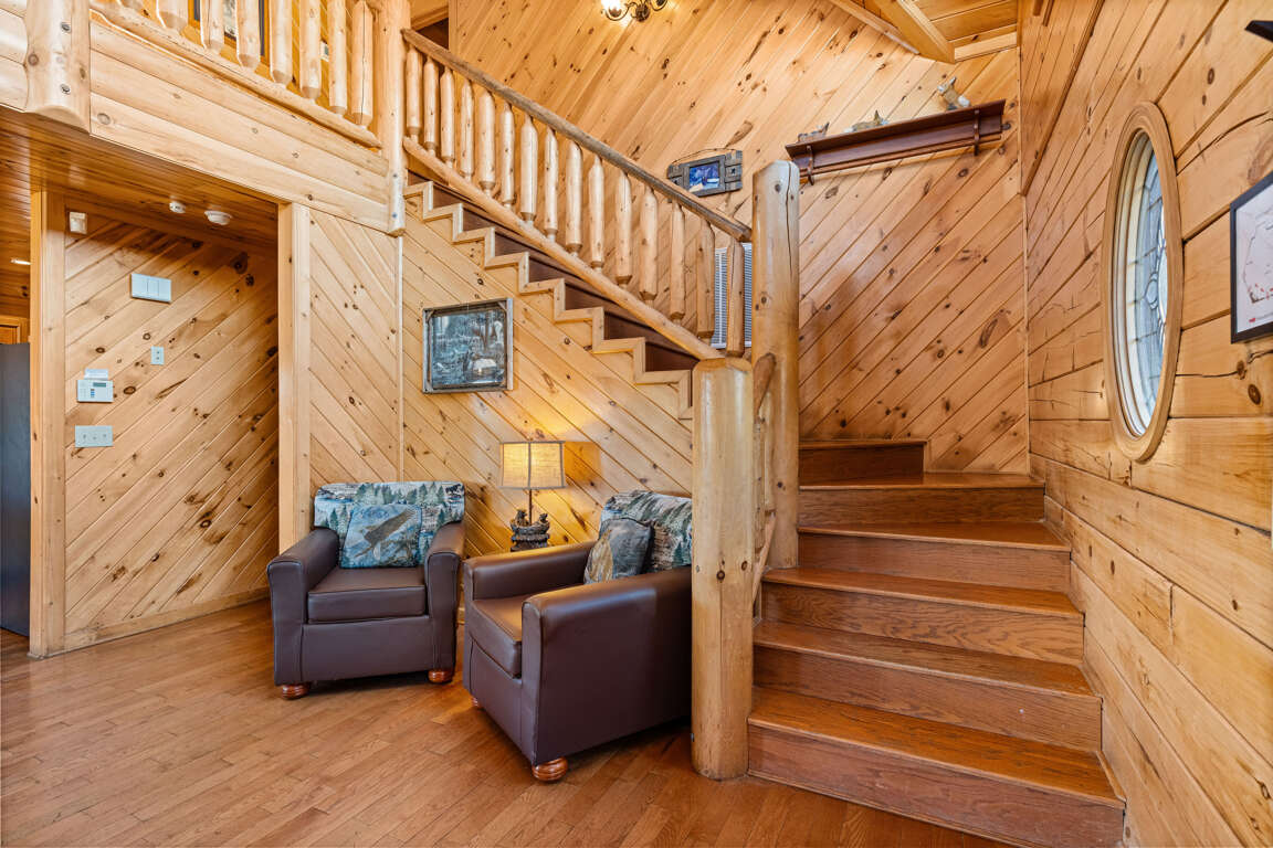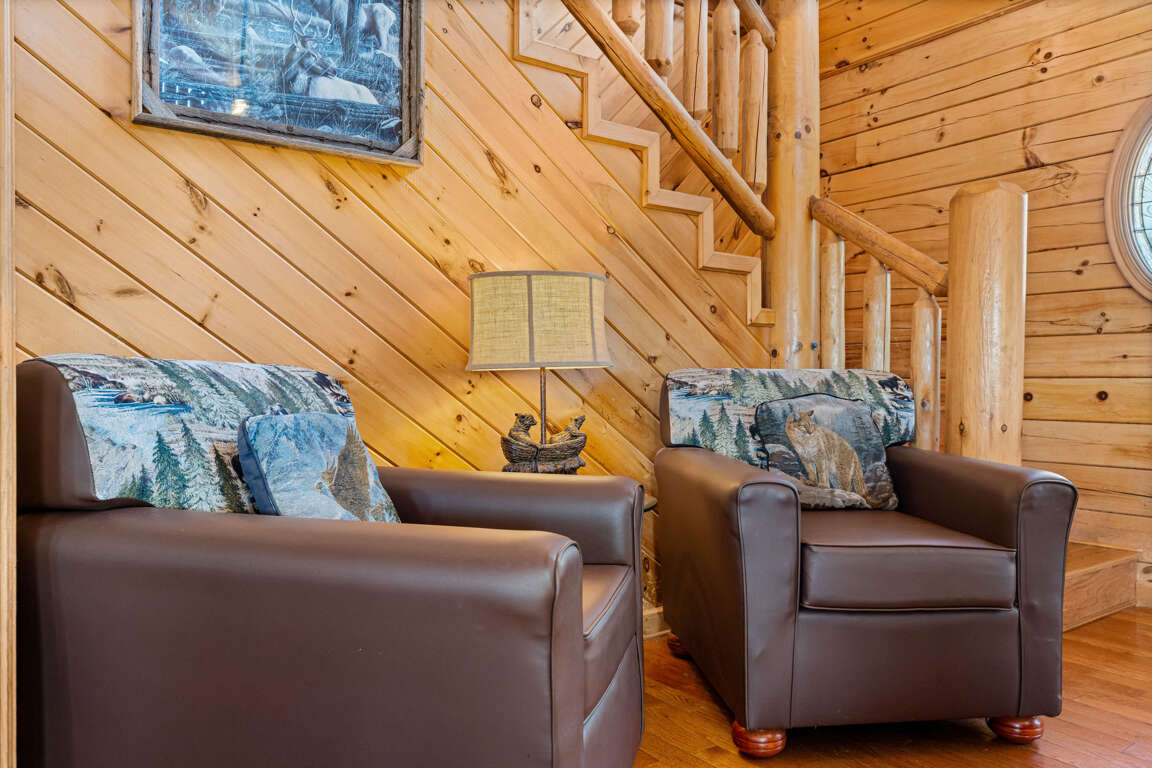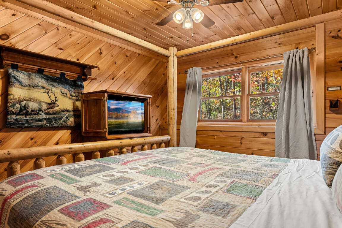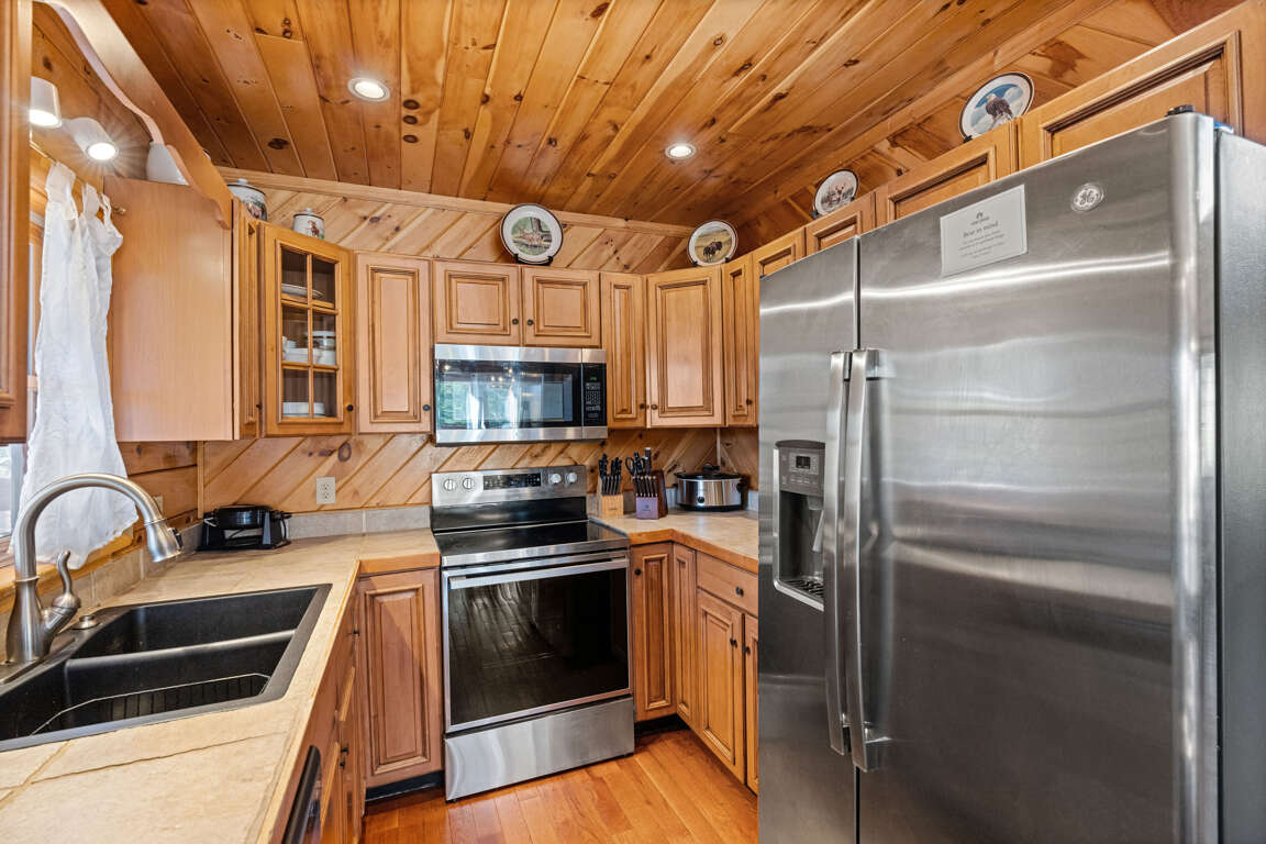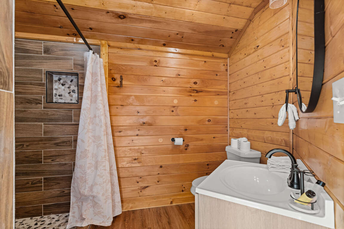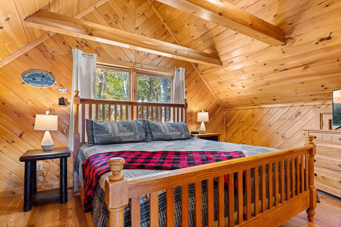 The five bedrooms are equally charming with soft quilts, rustic accents, and cozy wood finishes. The main-level king bedroom features an ensuite with a walk-in shower. Of the two upper-level king bedrooms, one offers an ensuite with a jetted jacuzzi tub and walk-in shower, and the other offers an ensuite with a standing shower. The lower level features a king bedroom with a shared full bath, as well as a queen-over-queen bunk room.