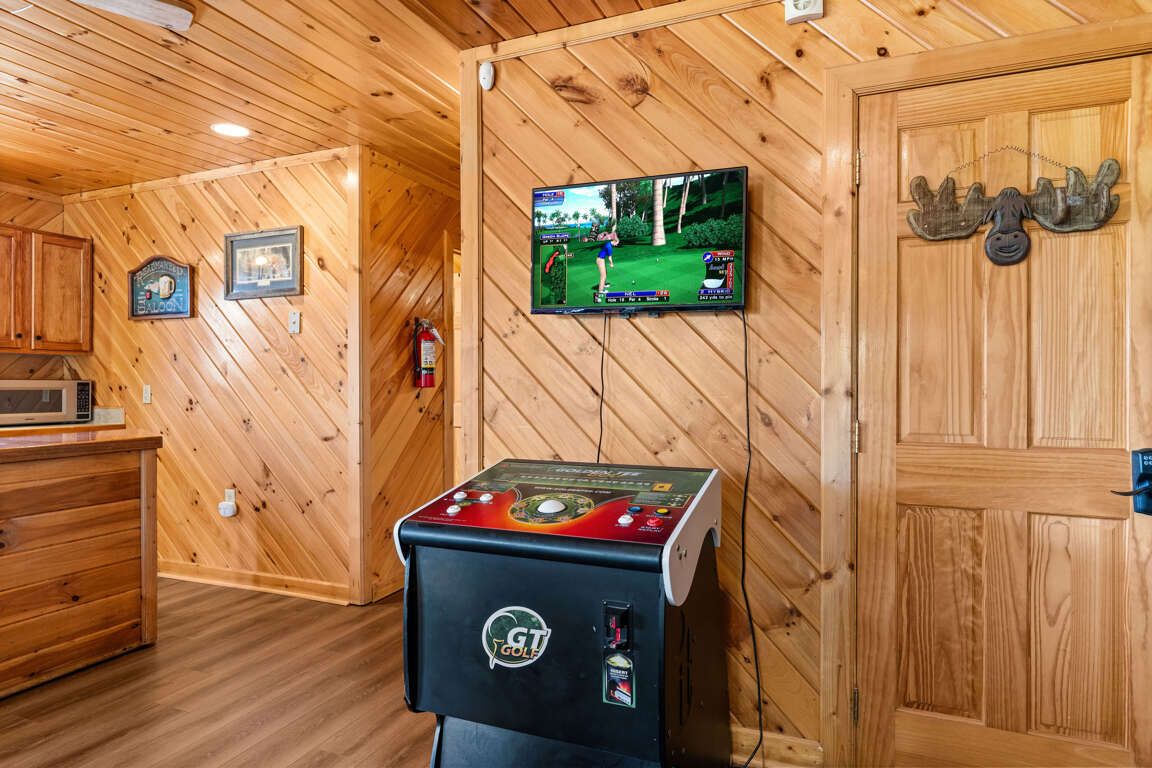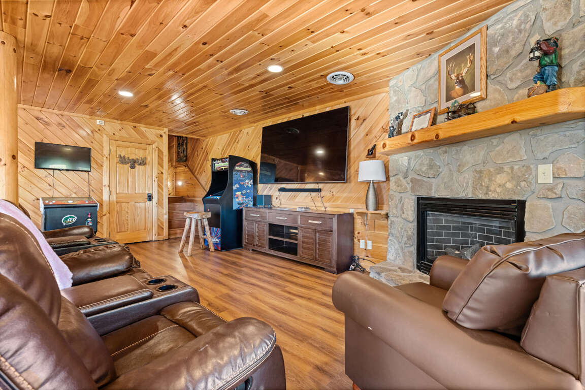Downstairs, the game room is designed for hours of entertainment with a pool table, Golden Tee, Pac-Man, a boat-racing arcade, bar, kitchenette, fireplace, and a private movie-theater–style area complete with recliners and a large-screen TV for the perfect movie night.
