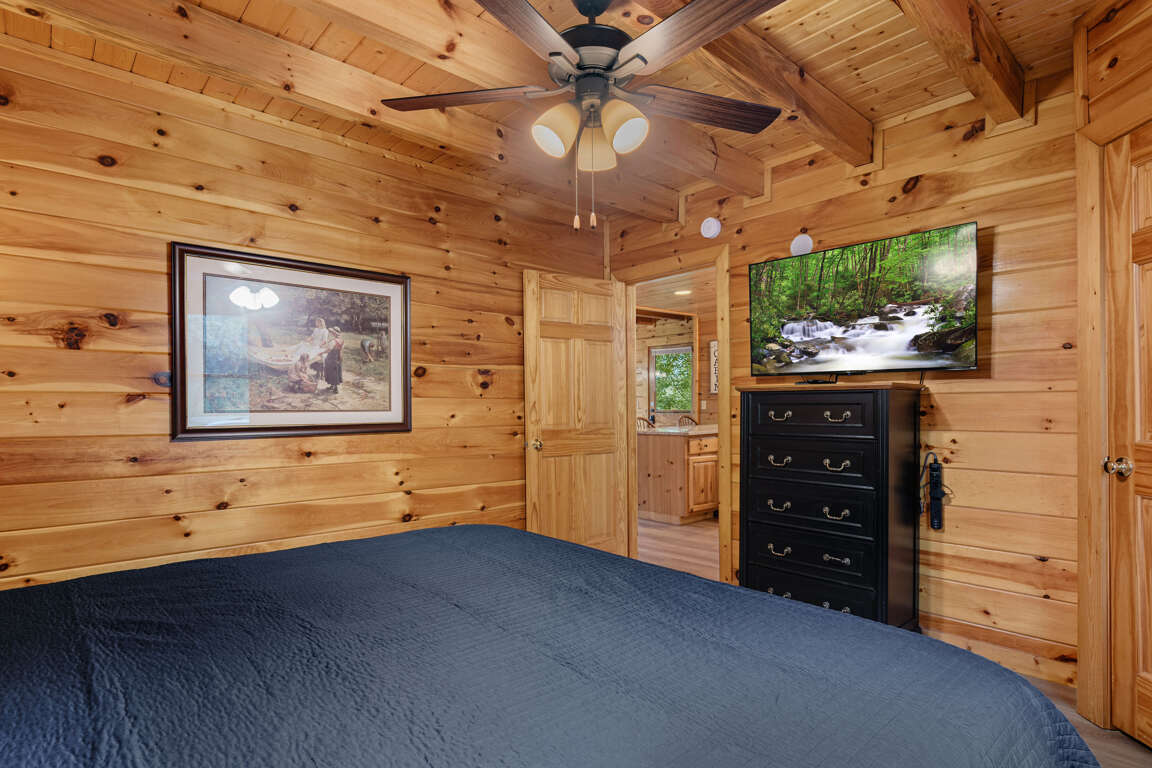 Bedroom 1, main floor, King bed, ensuite bathroom with indoor jacuzzi tub, Smart TV
