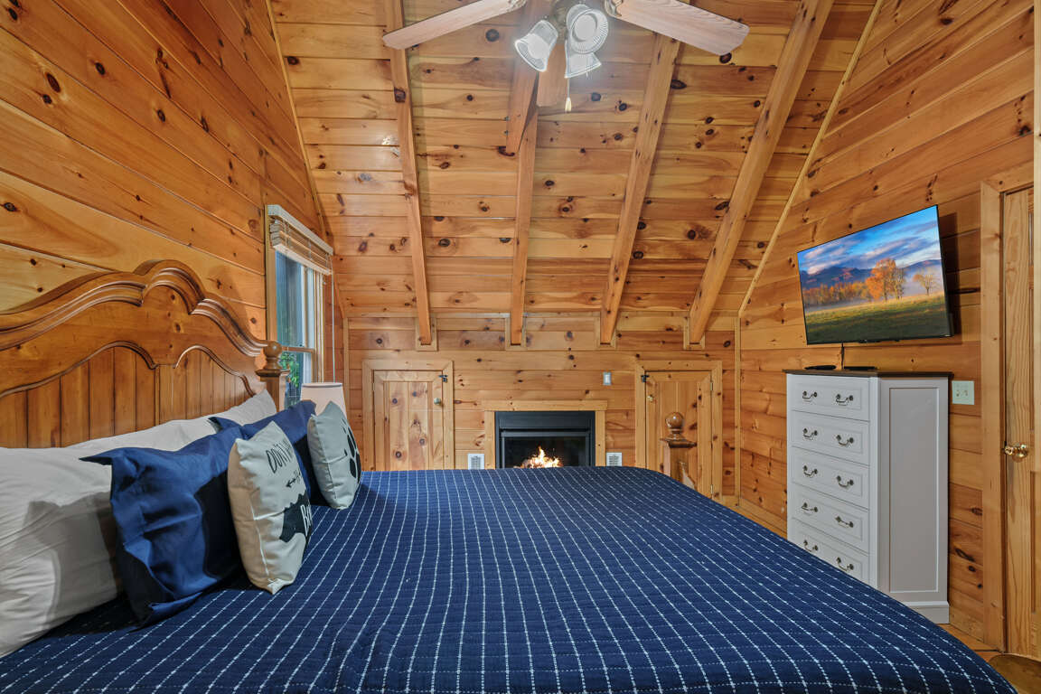 Bedroom 2, upper floor, King bed, electric fireplace, Smart TV