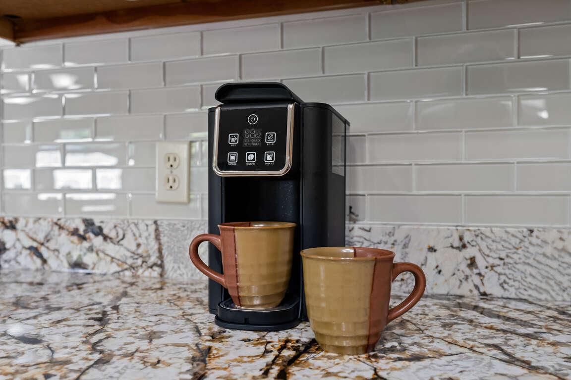 The kitchen is stocked and ready for you to cook and gather. It includes an electric stove, microwave, dishwasher, Keurig coffee maker, cookware, bakeware, dinnerware, and silverware. Whether you’re planning quick breakfasts before heading into town or full family meals, everything you need is here.