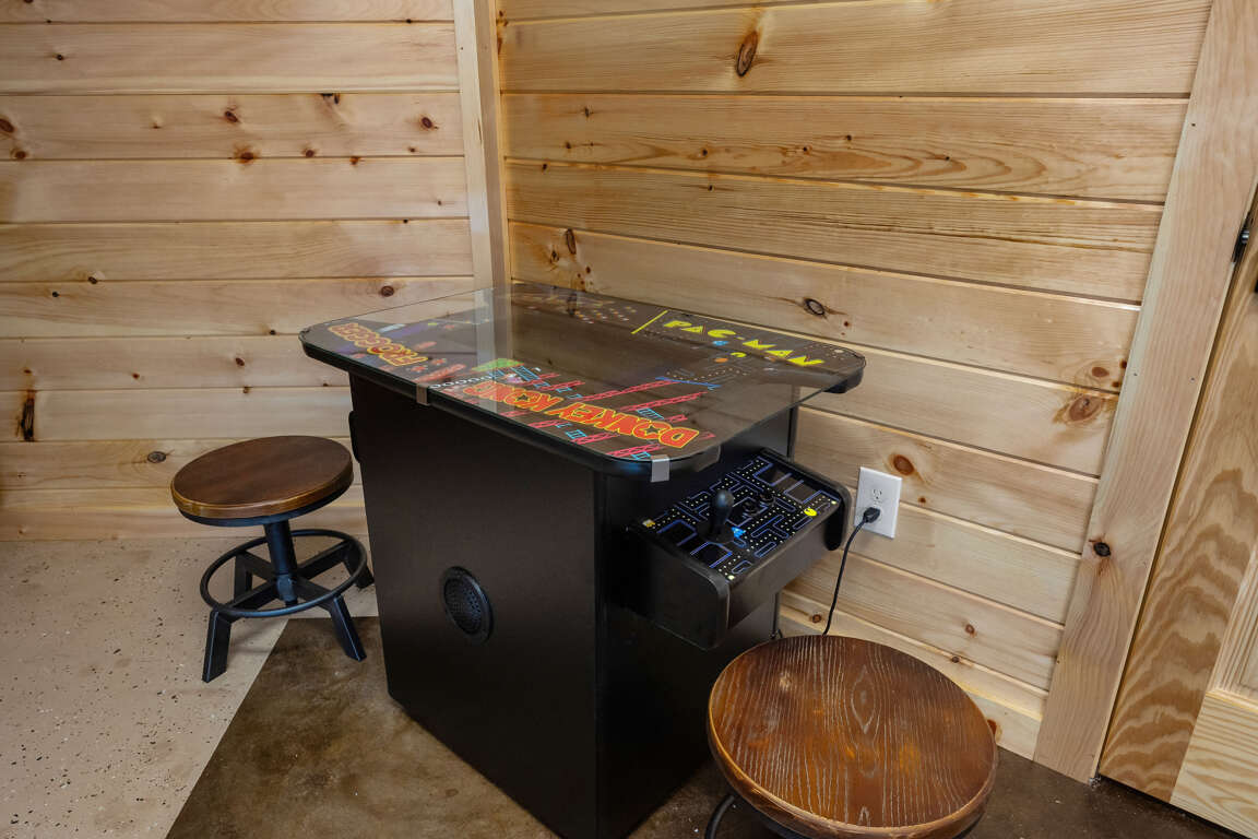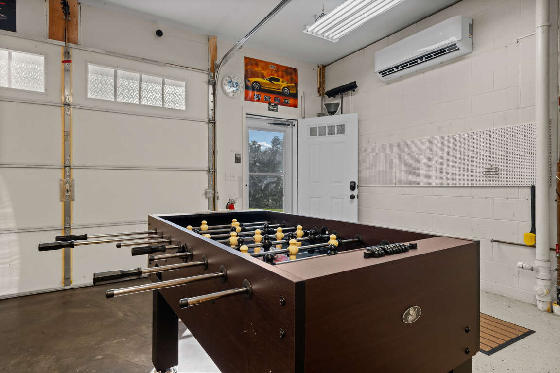 The detached garage has been transformed into a private game room, offering a great hangout spot for all ages. You'll find a foosball table, a multicade arcade machine, and shuffleboard for hours of indoor fun—rain or shine.