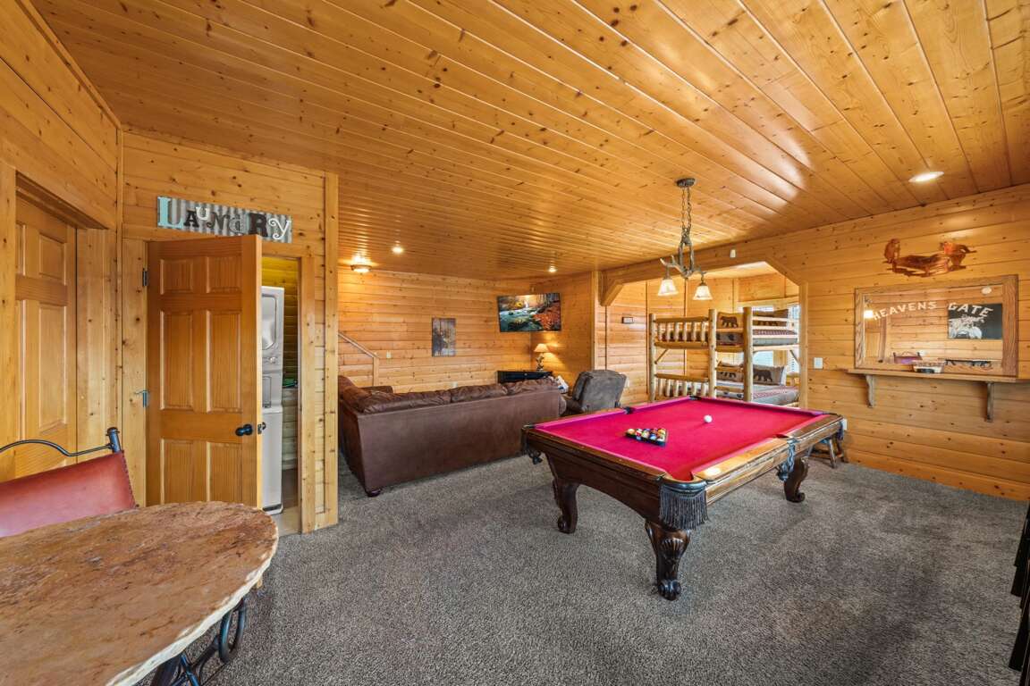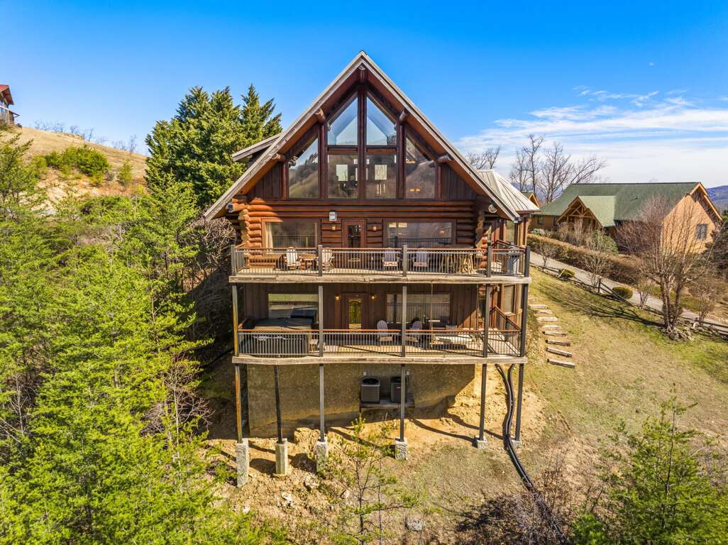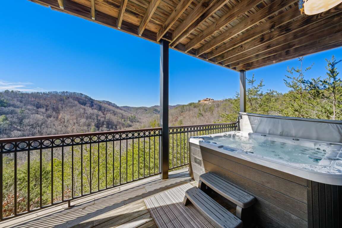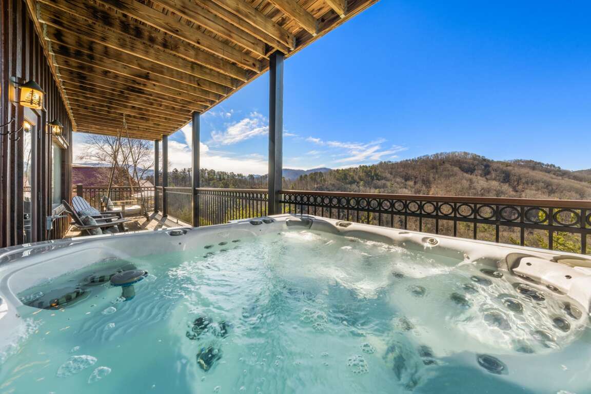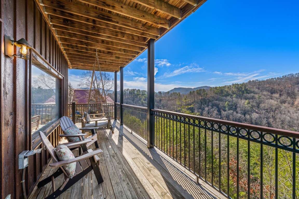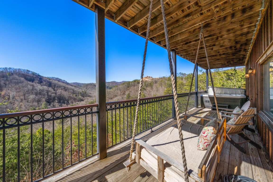 The lower-level living space includes a large sectional, pool table, and smart TV, opening onto a balcony with a hot tub, swing, and additional seating. All three levels of the cabin offer balcony views showcasing different perspectives of the surrounding mountains.