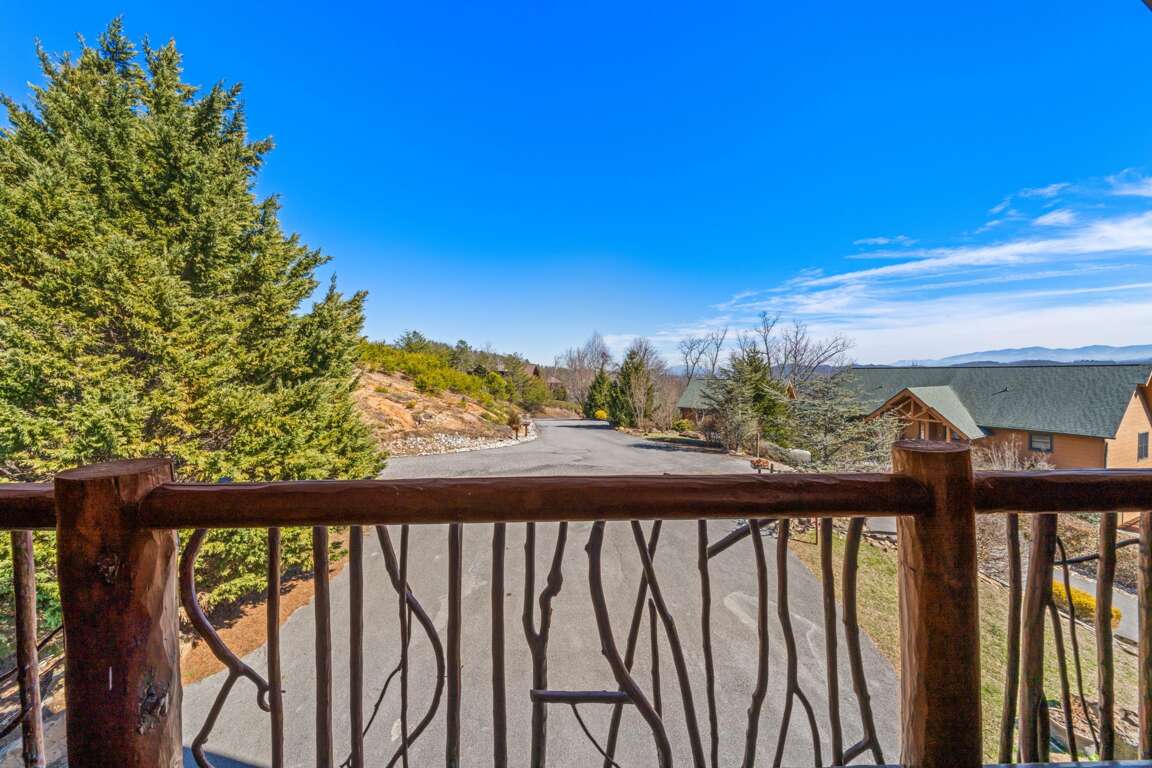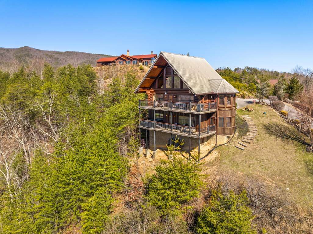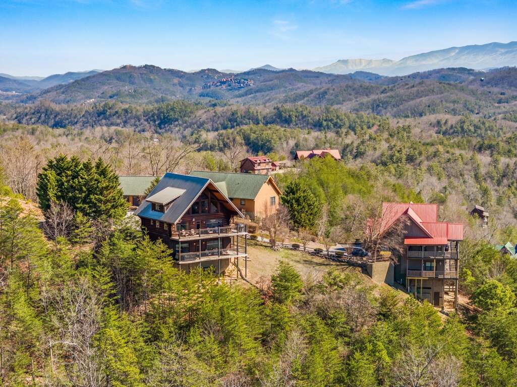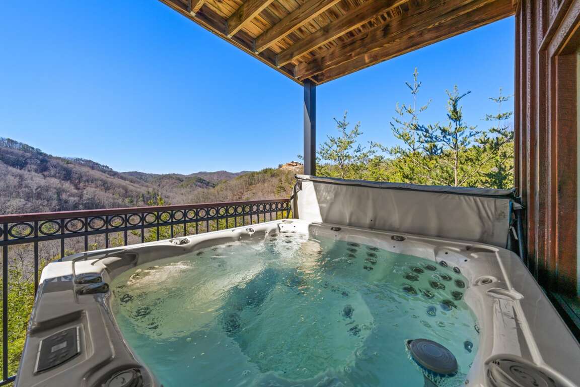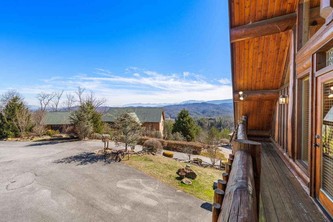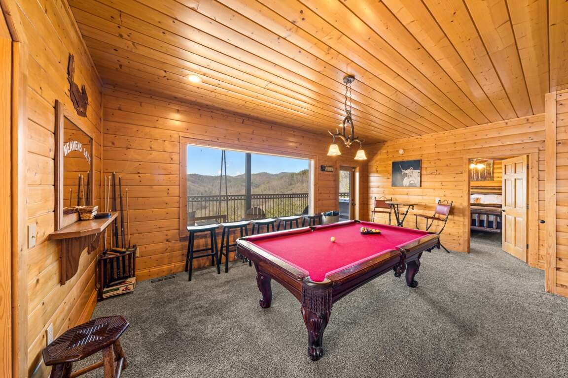 The lower-level living space includes a large sectional, pool table, and smart TV, opening onto a balcony with a hot tub, swing, and additional seating. All three levels of the cabin offer balcony views showcasing different perspectives of the surrounding mountains.