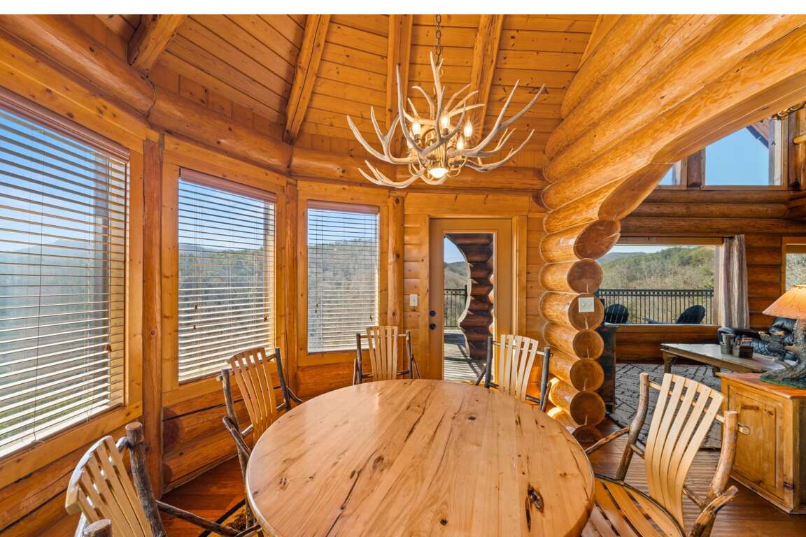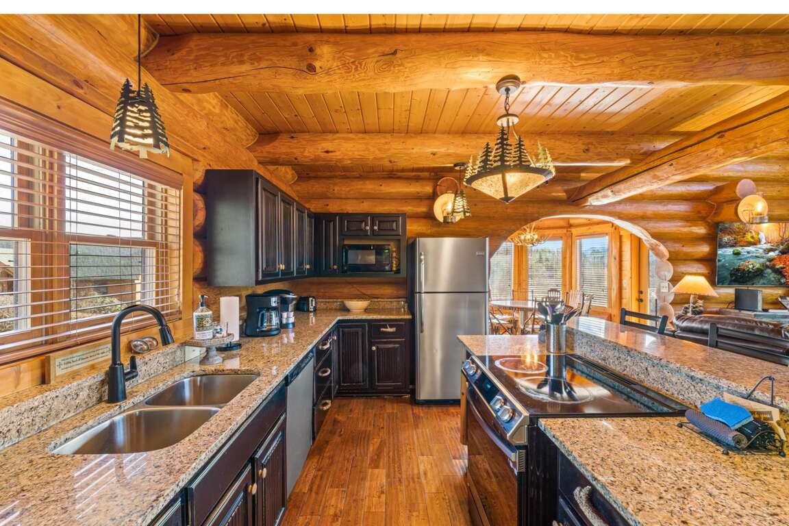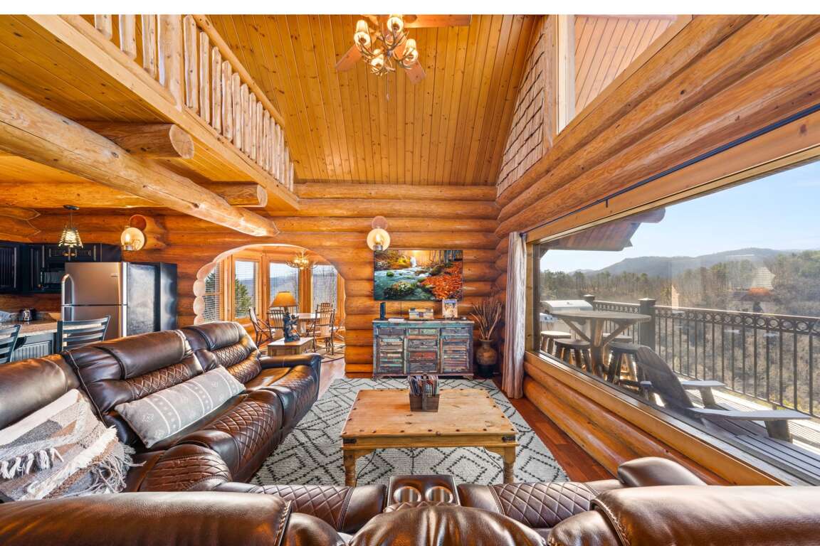 The main-level living area is warm and inviting, featuring a leather sectional sofa, gas fireplace, and smart TV, all framed by stunning mountain vistas. Relax after a day of adventure or enjoy movie nights with loved ones.