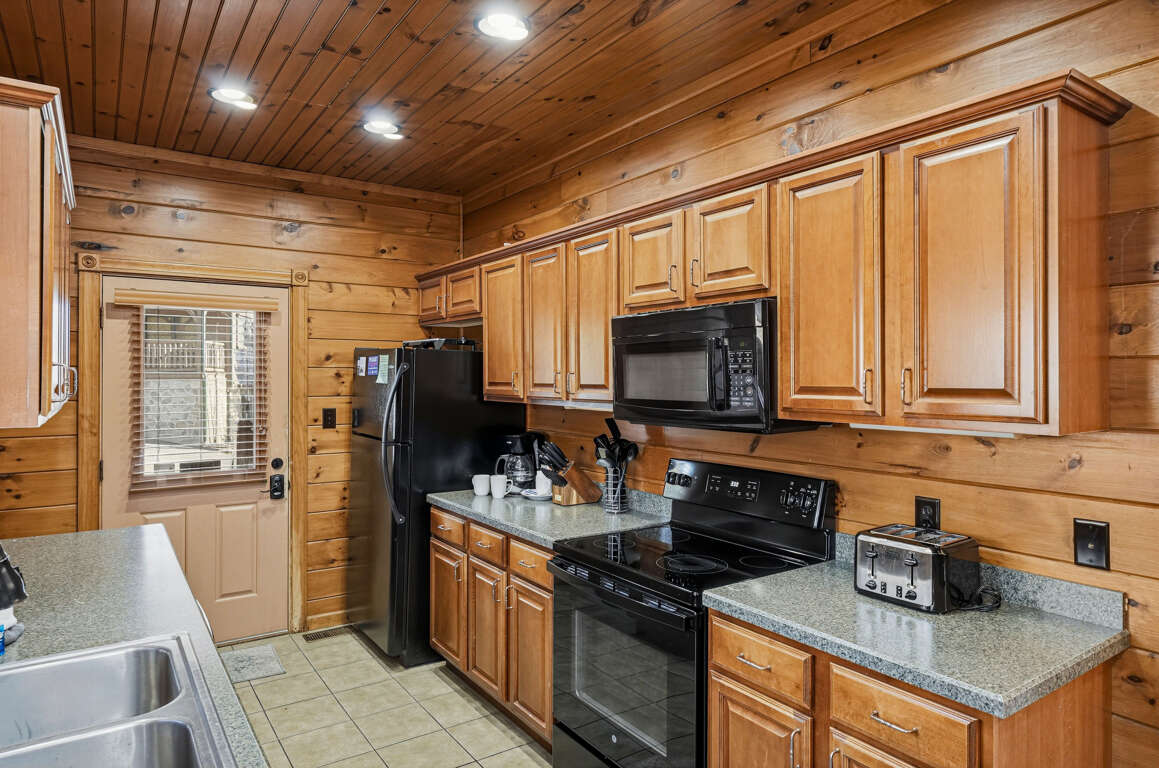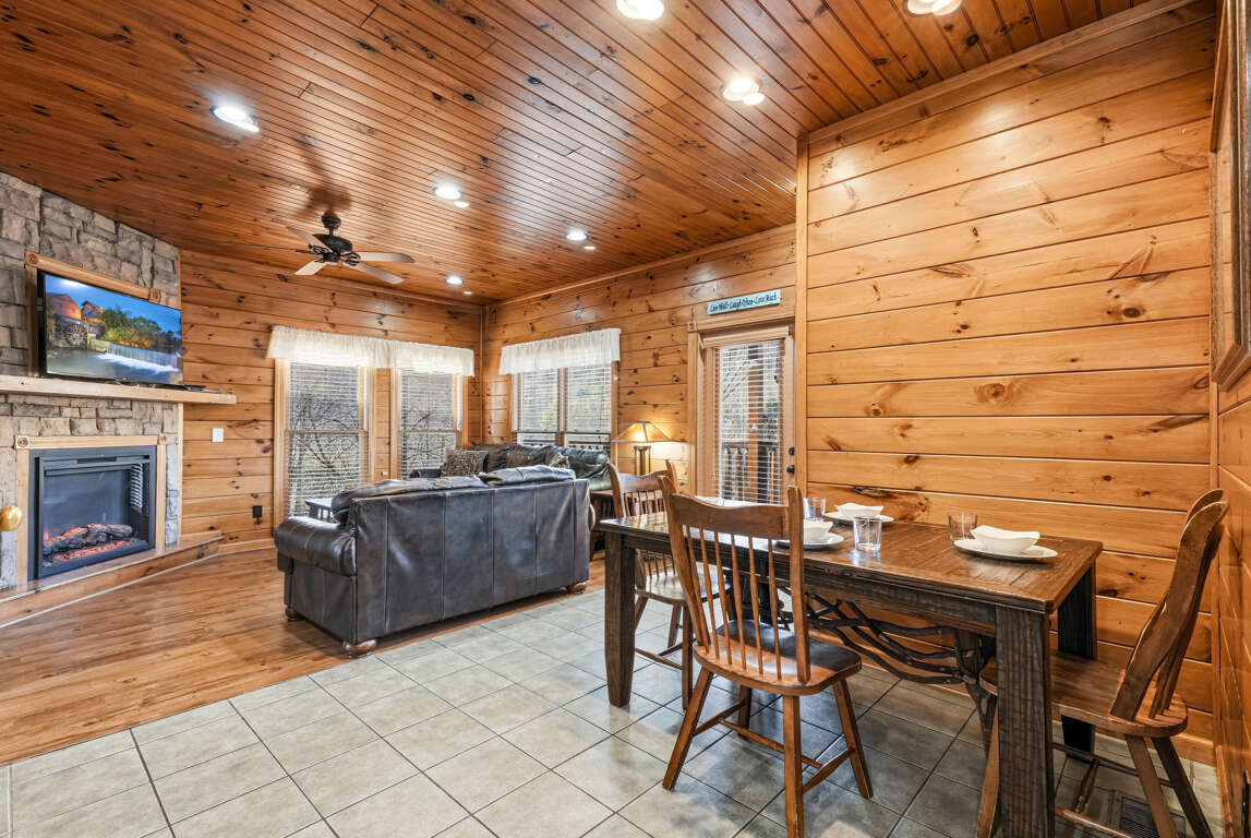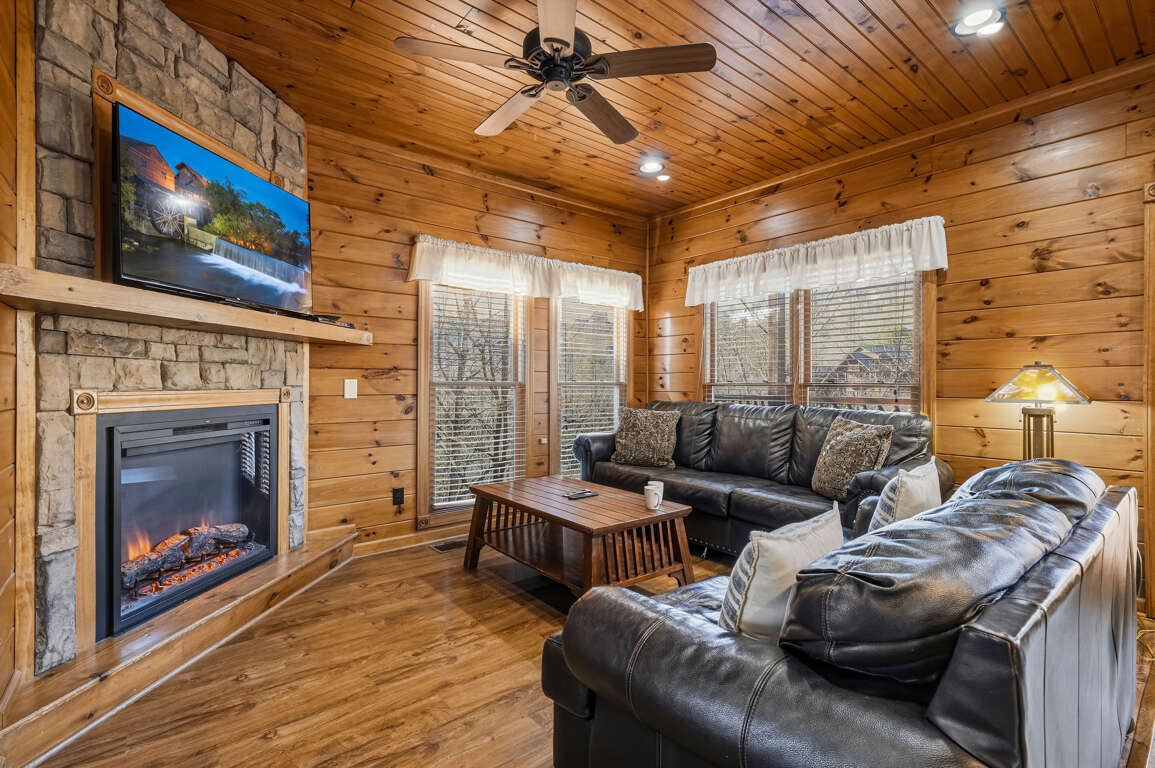 After a day exploring the Smokies, unwind in the cozy living room featuring plush seating, a large TV, and an electric fireplace—perfect for cool mountain evenings. Large windows bring in natural light and peaceful wooded views, creating a warm and welcoming gathering space.