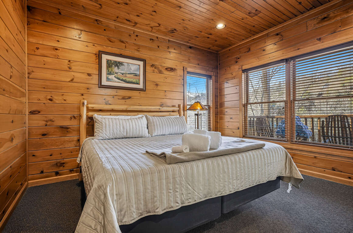 • Bedroom 2 (Upper Level): King bed, TV, private en-suite (tub/shower combo)
