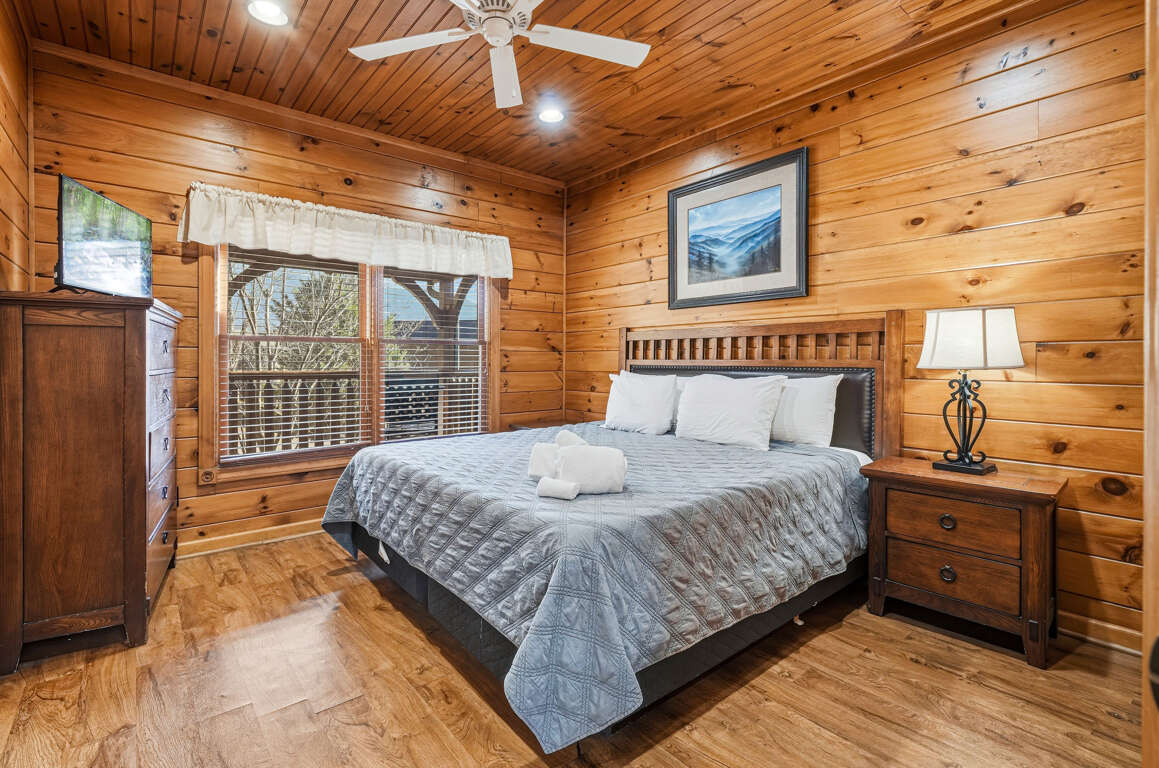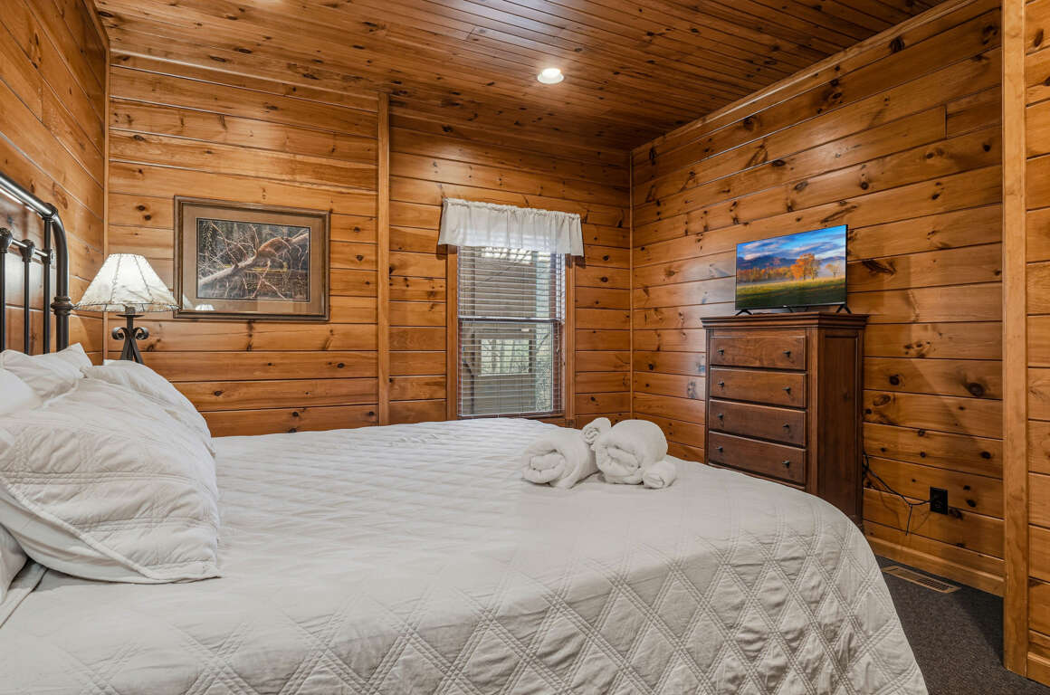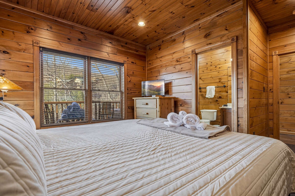 • Bedroom 1 (Main Level): King bed, TV, private en-suite (tub/shower combo)