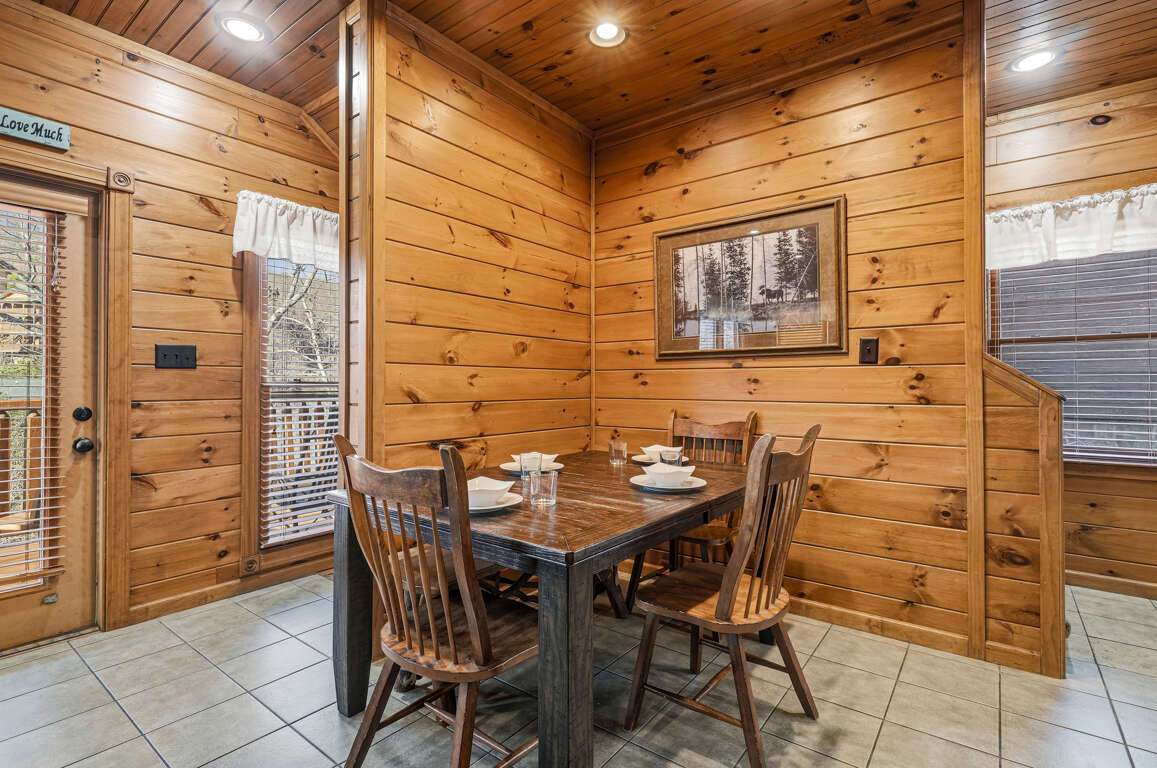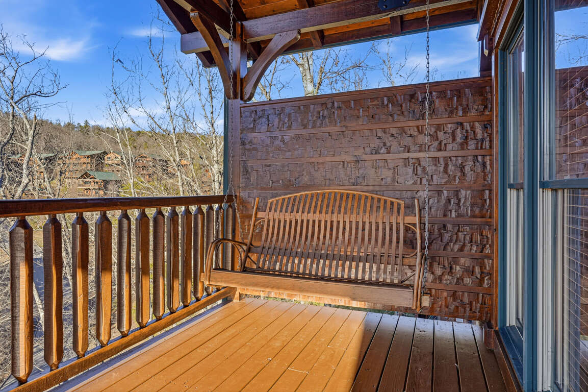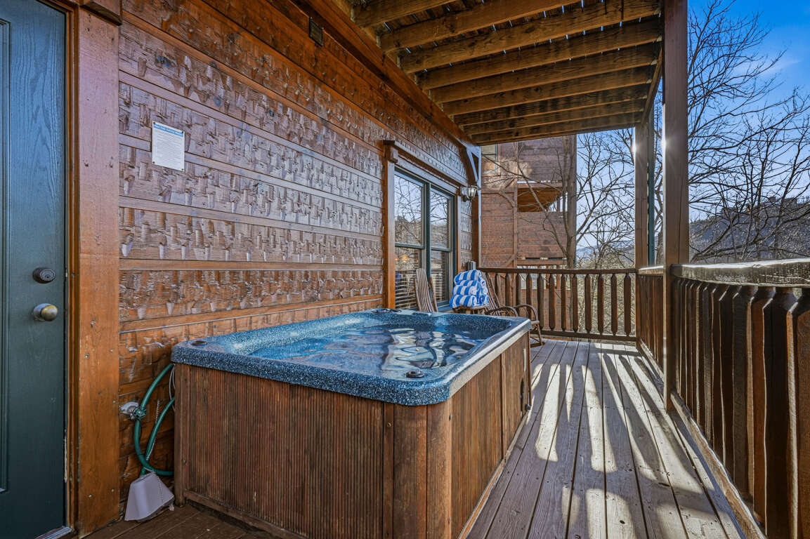 Step outside onto one of three covered decks to enjoy rocking chairs, a porch swing, or the bubbling outdoor hot tub with TV. Fire up the charcoal grill and enjoy dining surrounded by Smoky Mountain scenery.