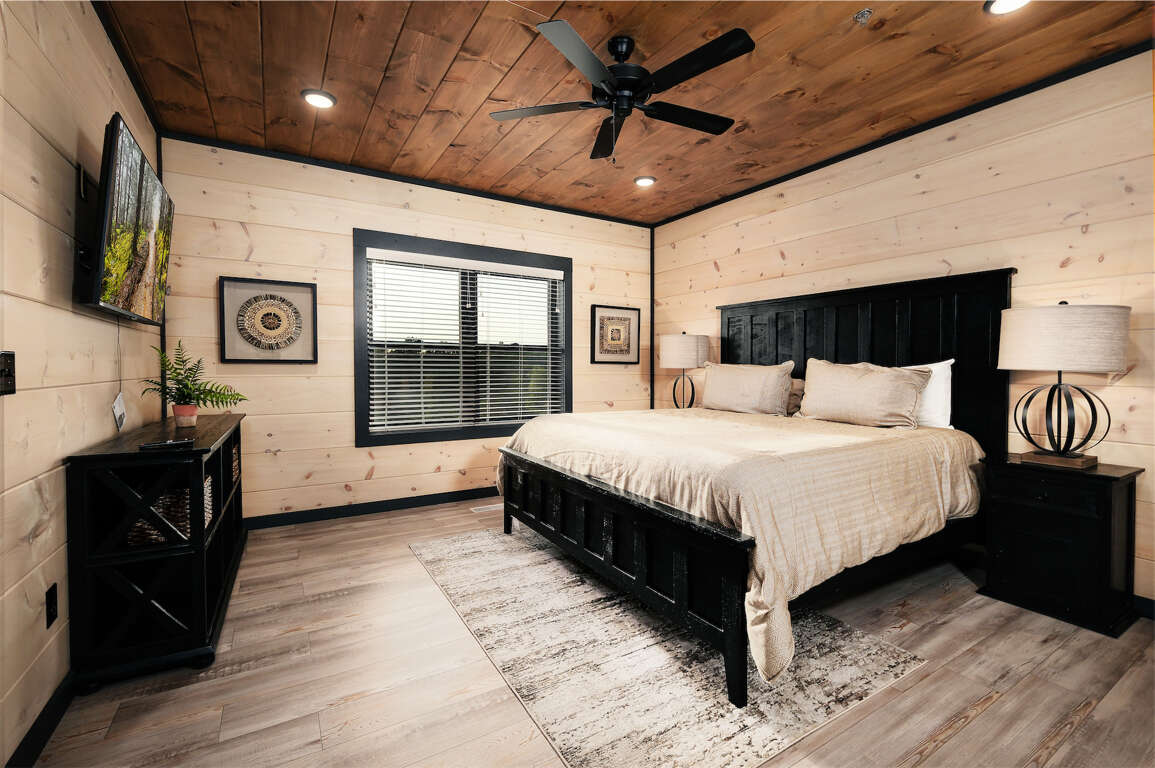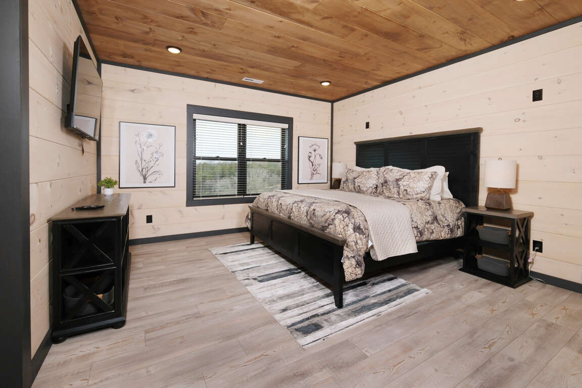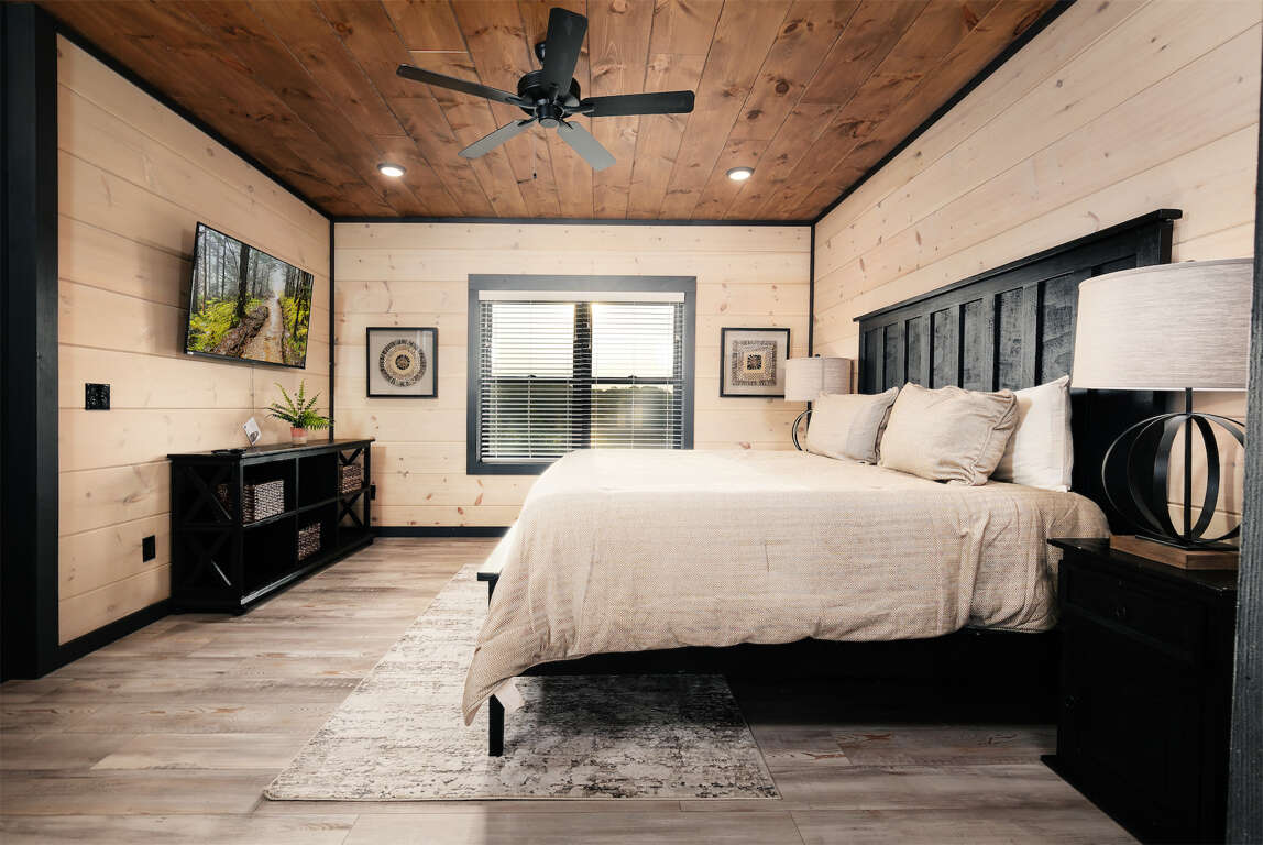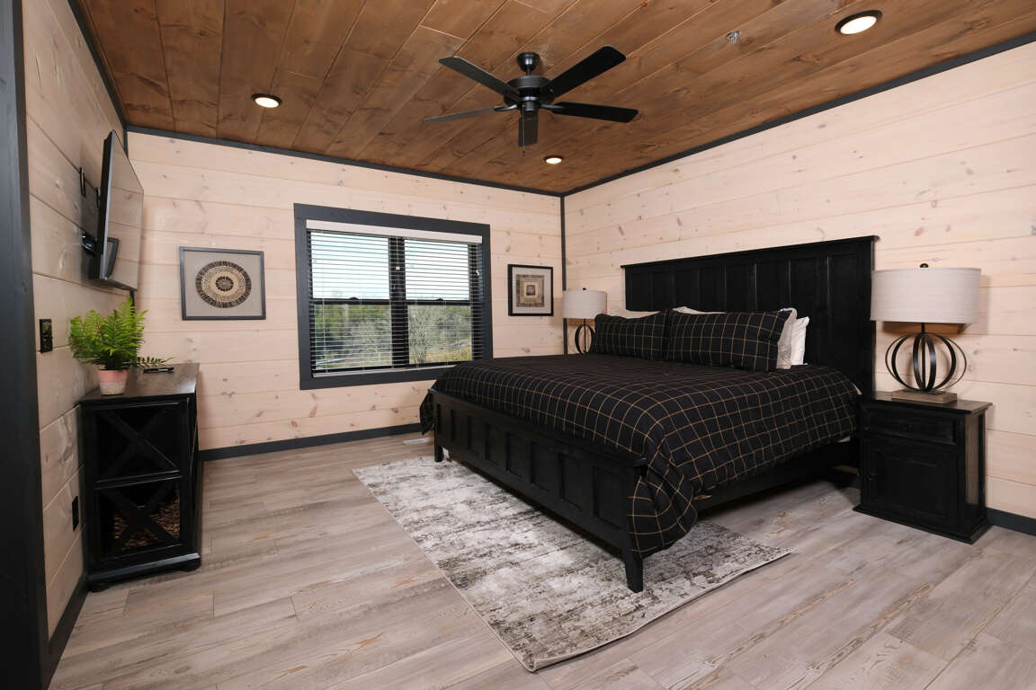 * Bedroom 1, main level, King bed, ensuite bathroom, Roku TV