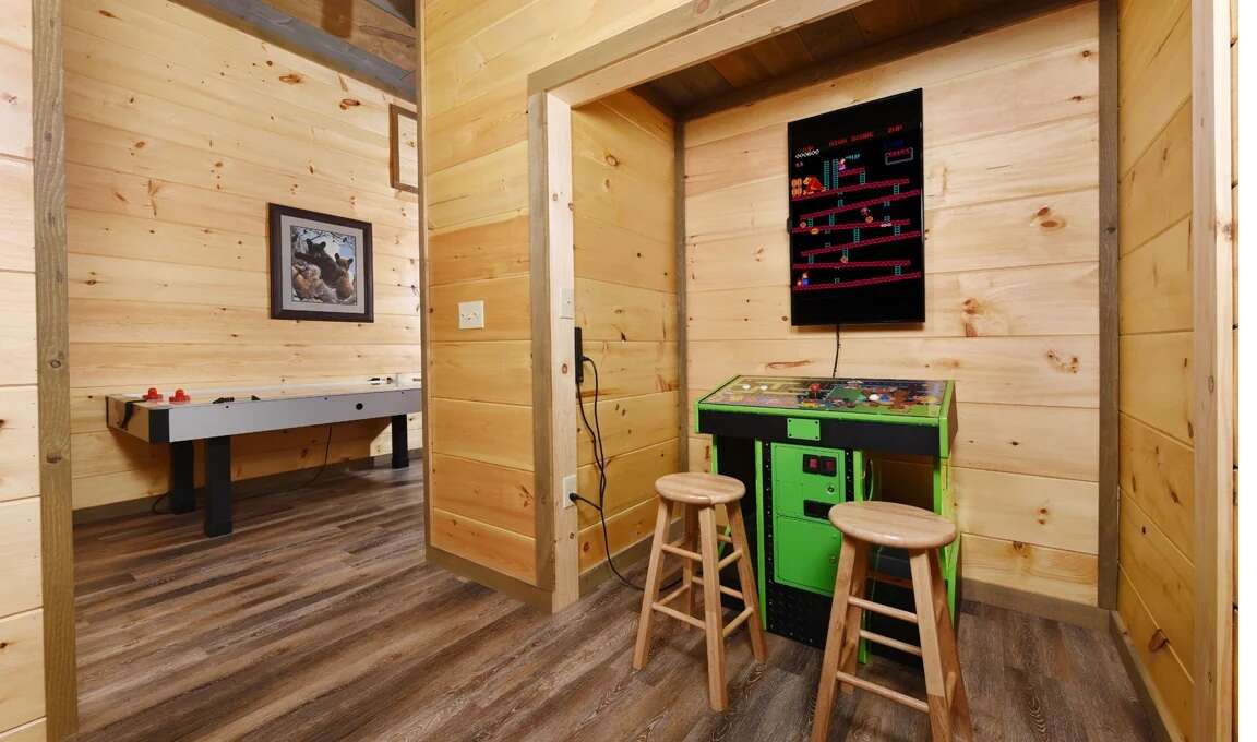 Cabin rental in Gatlinburg with 4 bedrooms, sleeps 12, and a private indoor pool, plus hot tub, arcade games, and Smoky Mountain views.