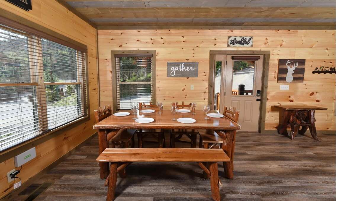 The adjacent dining space features a beautiful mountain-style table with bench seating, plus bar stools and additional seating nearby so everyone can dine comfortably