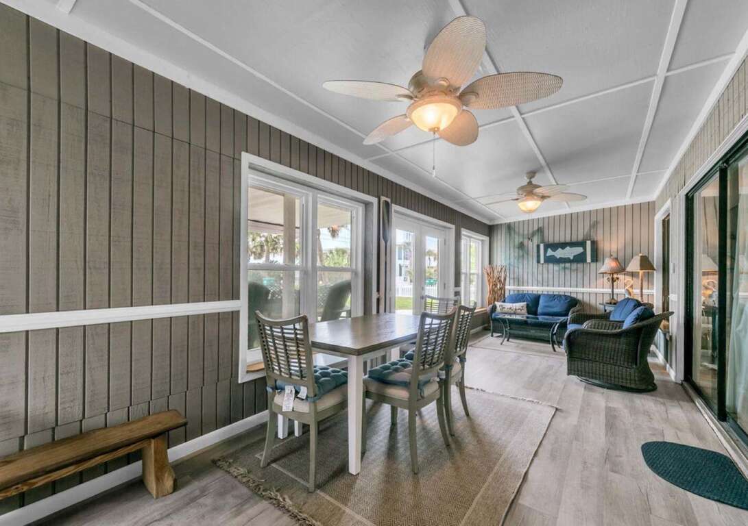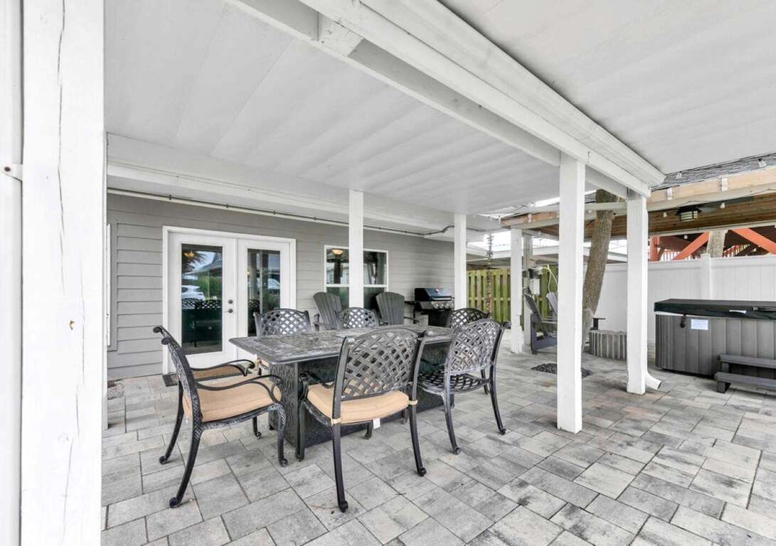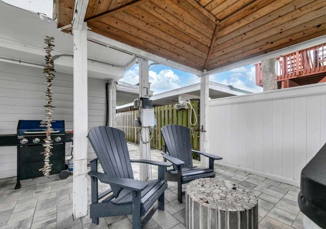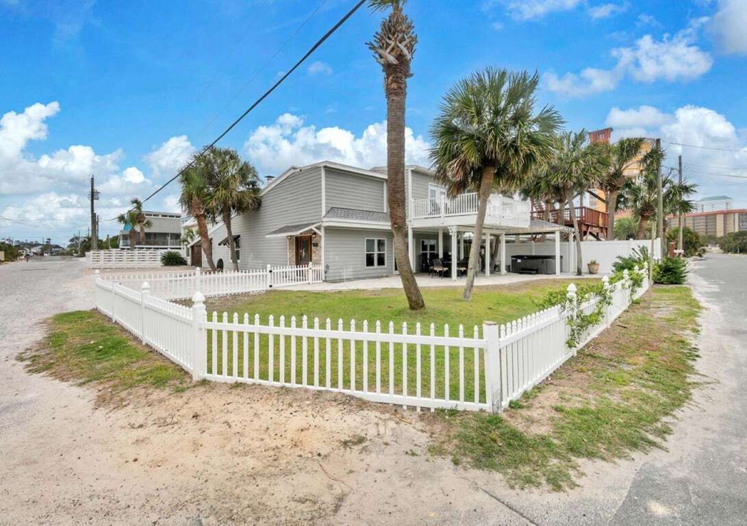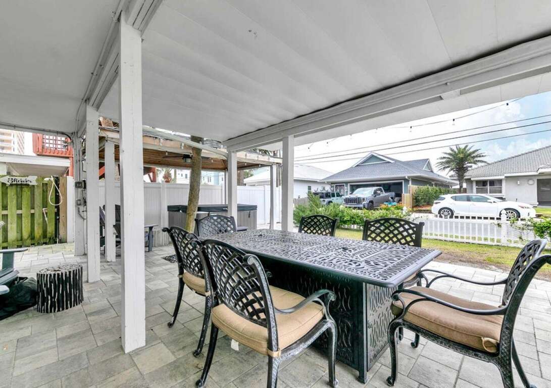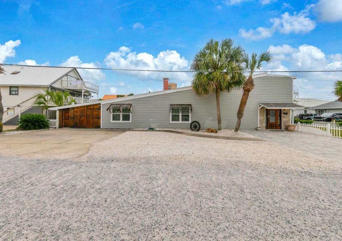 Welcome to Holiday House. This stunning 6 bedroom, 4 bath house provides over 2700 sq feet of living space. Professionally decorated with an open concept living, dining, kitchen, and 18ft beamed ceilings with a wood burning fireplace. Go thru the French doors of the Florida room to the beautifully landscaped front yard with a cedar-covered pergola above a large dining table, covered HOT TUB, and an additional sitting area to enjoy the breeze from the gulf while you are grilling on the gas grill and relaxing with family and friends. Whip up delicious meals within the kitchen that features new granite countertops, gorgeous steel blue cabinets and stainless-steel appliances. Venture up the spiral staircase to the 2nd floor PRIVATE master suite which offers a romantic jetted garden tub, large walk-in shower, and private balcony to enjoy the sunrise, sunsets and gulf views. On the main level, the 1st guest bedroom features a king bed with guest bedroom #2 featuring queen over queen bunks which are joined by a jack and jill bathroom. The 3rd guest bedroom features a queen bed and 4th bedroom with a queen bed share a jack and jill full bathroom. The 6th bedroom private 1st floor master suite features a canopy queen bed and sleeper sofa with a full bath. This home sleeps up to 18 guests comfortably. Additional features include plenty of parking, 2 outdoor showers, HOT TUB, outdoor seating and access to the beach 45 yards away. Come make lasting memories with your friends and family at Holiday House.