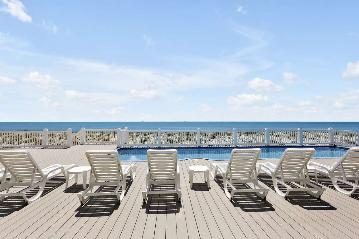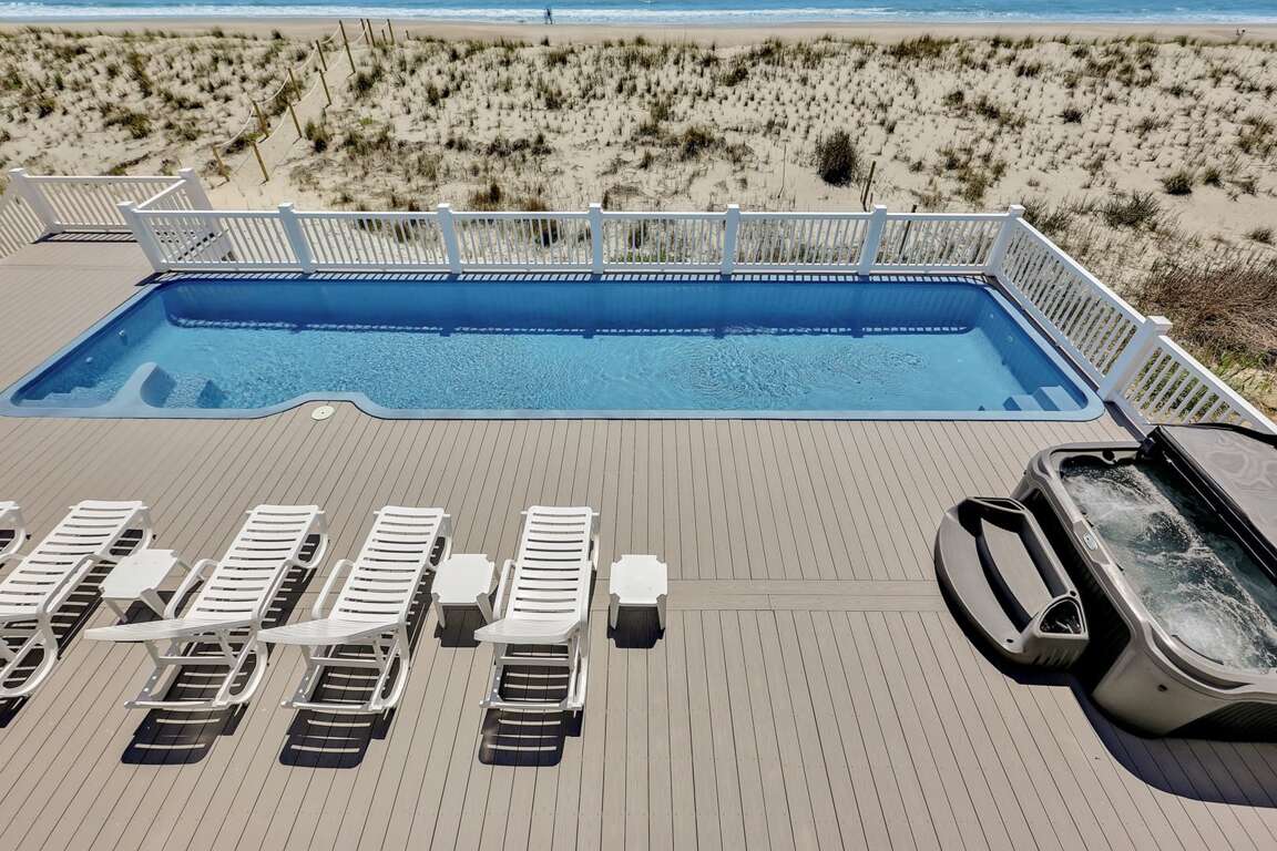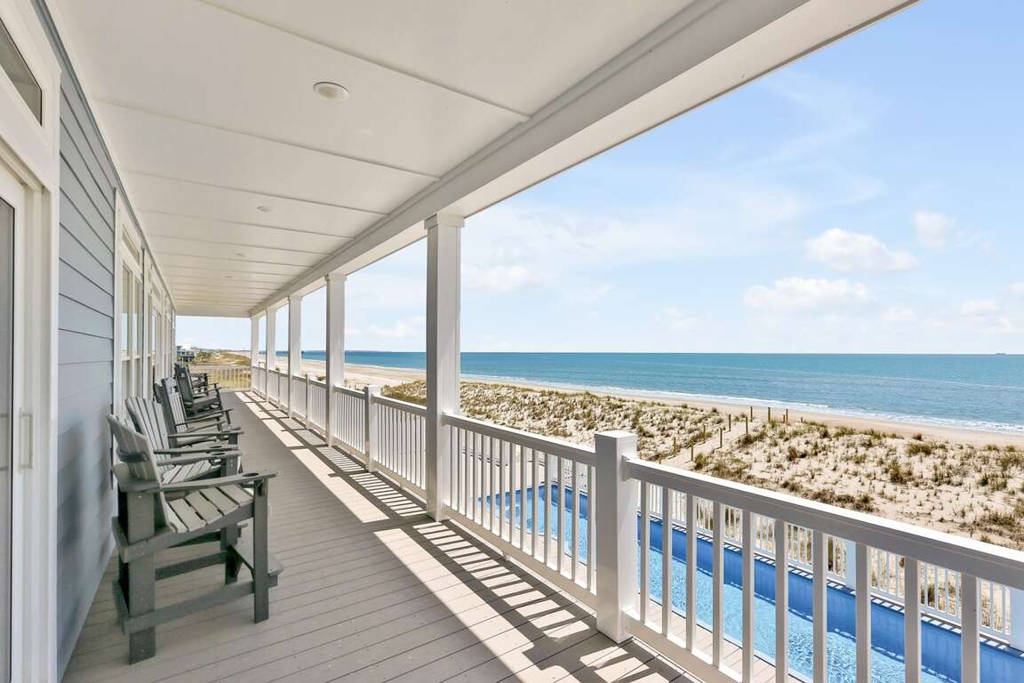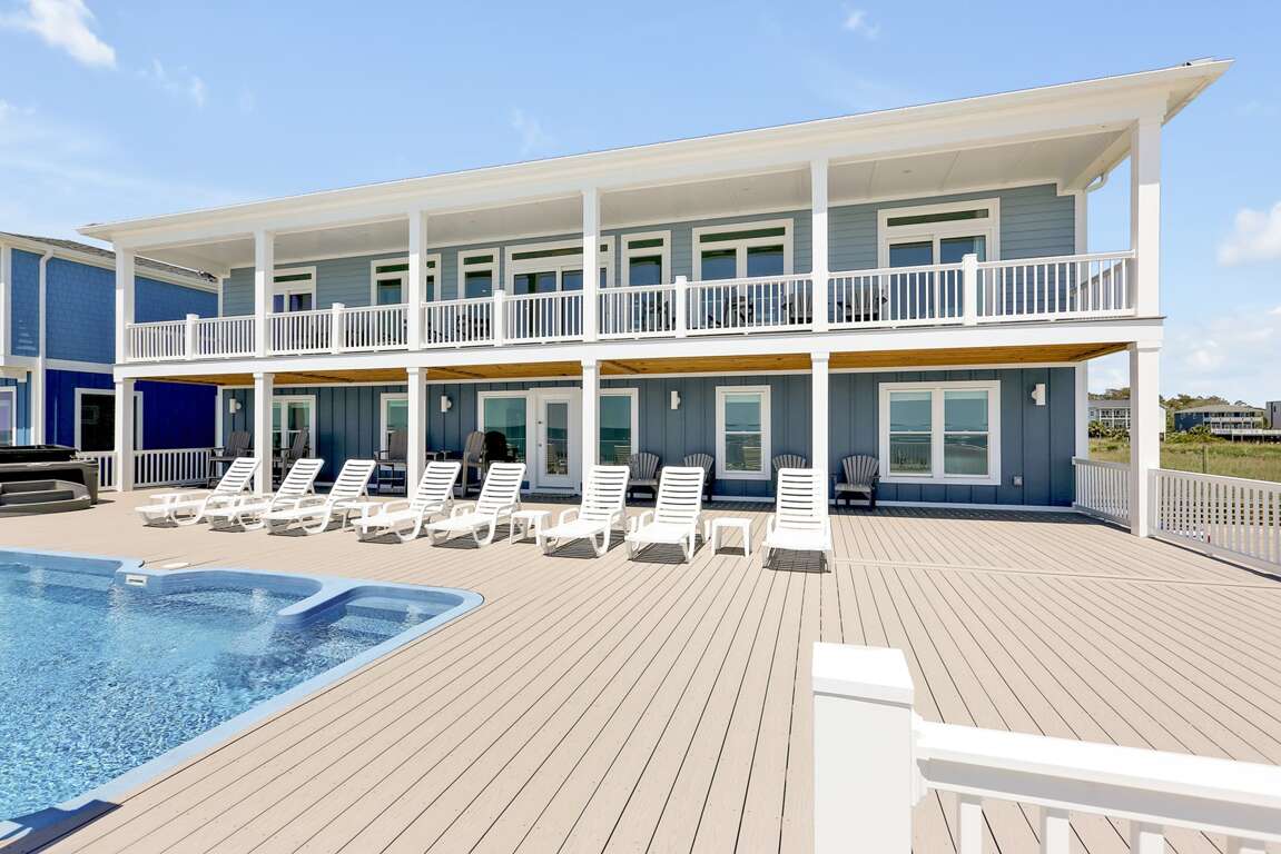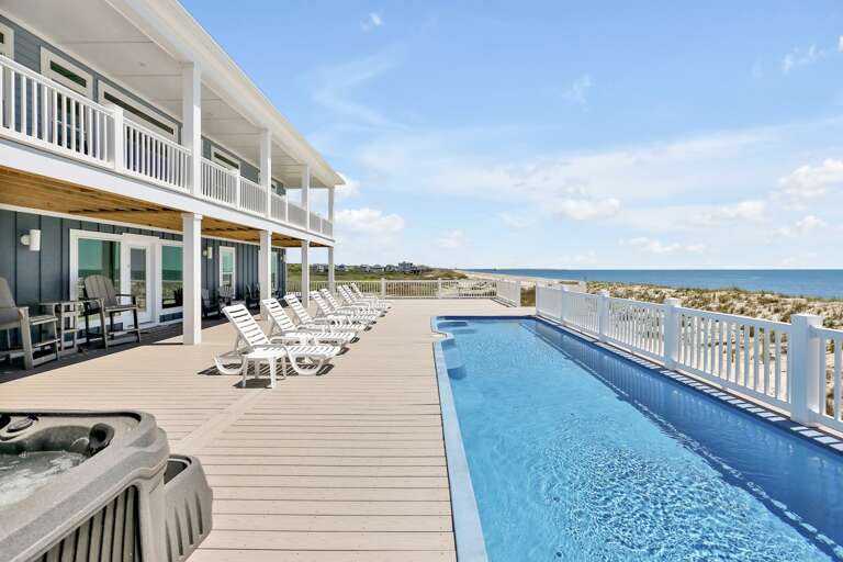 Oceanfront house in Oak Island with 10 suites, an elevated saltwater pool, hot tub, and elevator, plus walkable access to shops and dining.