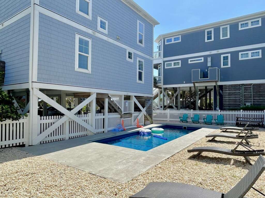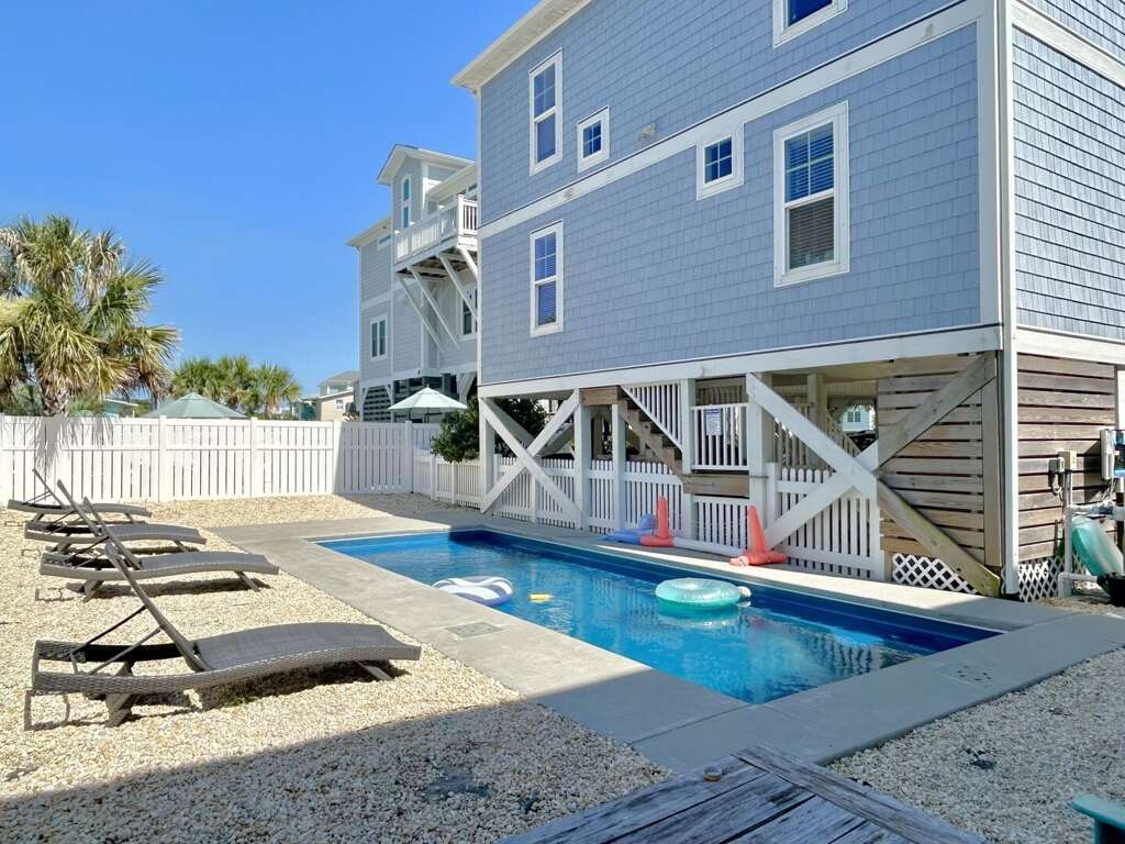 Second-row house in Oak Island with ocean views, a private saltwater pool, and an elevator; a 6-bedroom vacation rental set on a quiet street.