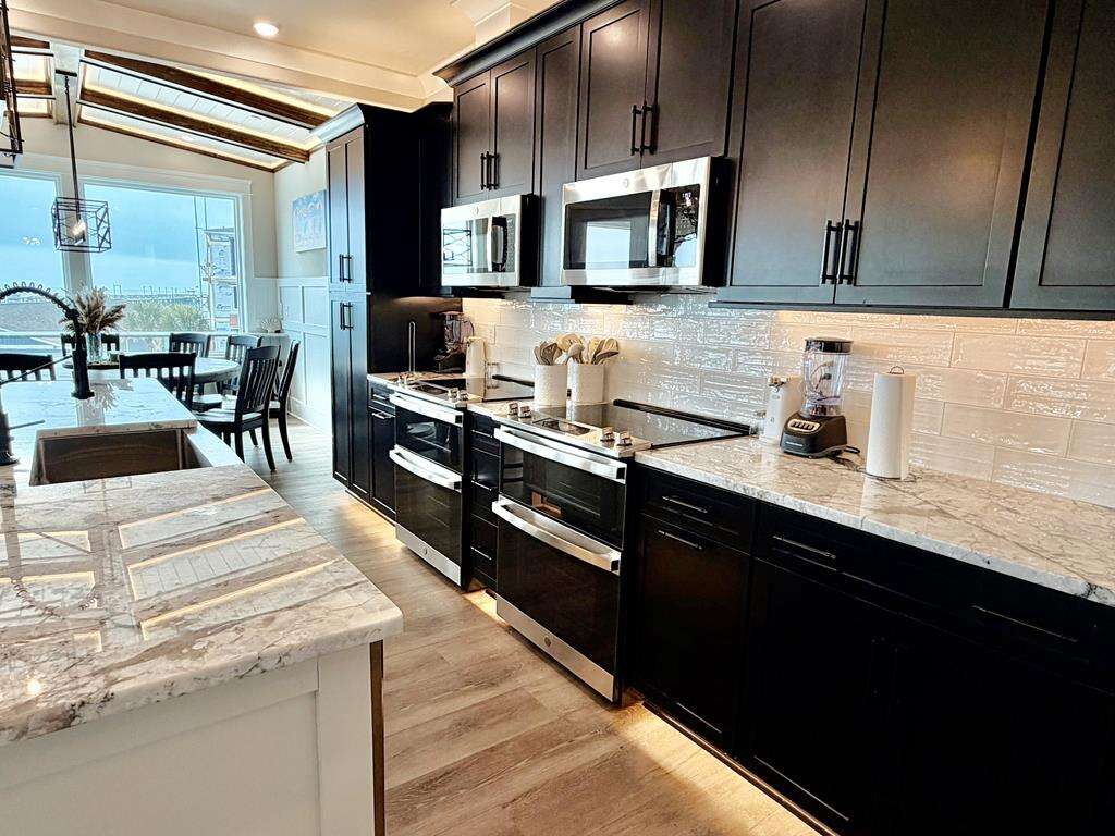 - Spacious gourmet kitchen with double appliances: 2 Dishwashers. 2 Electric ranges with cooktops. 2 Microwaves.