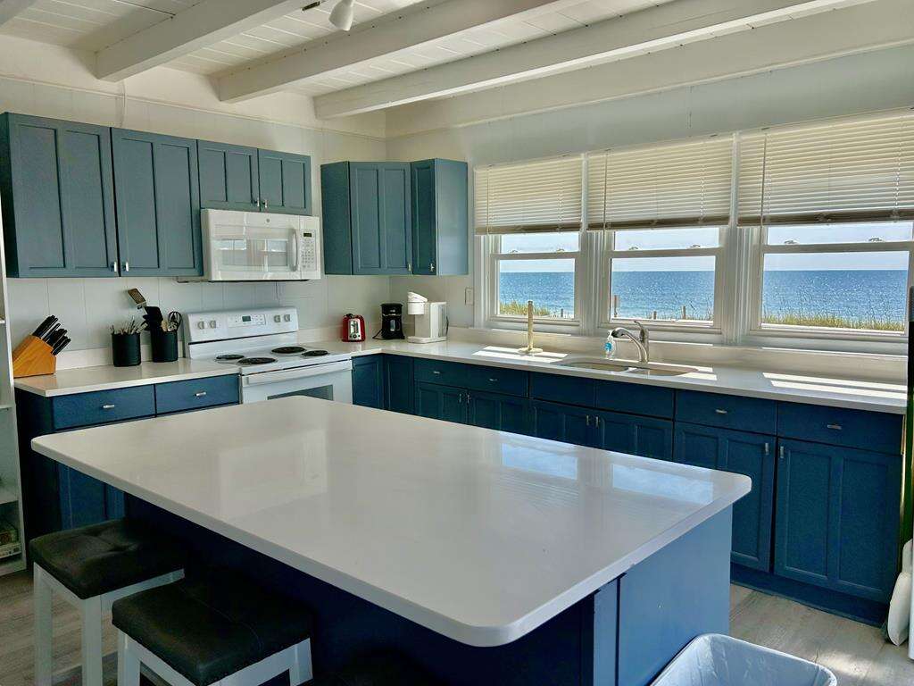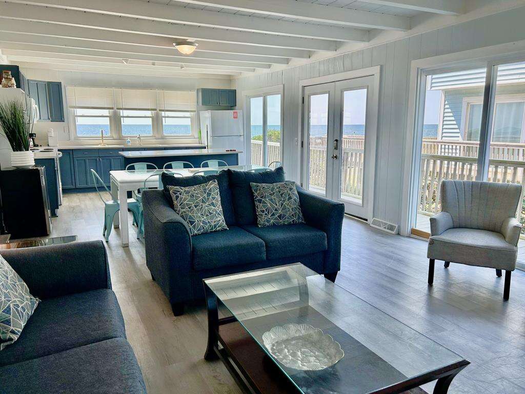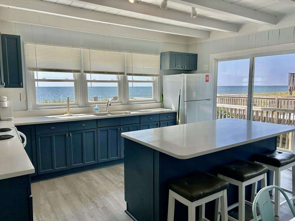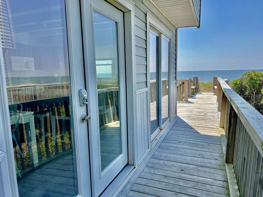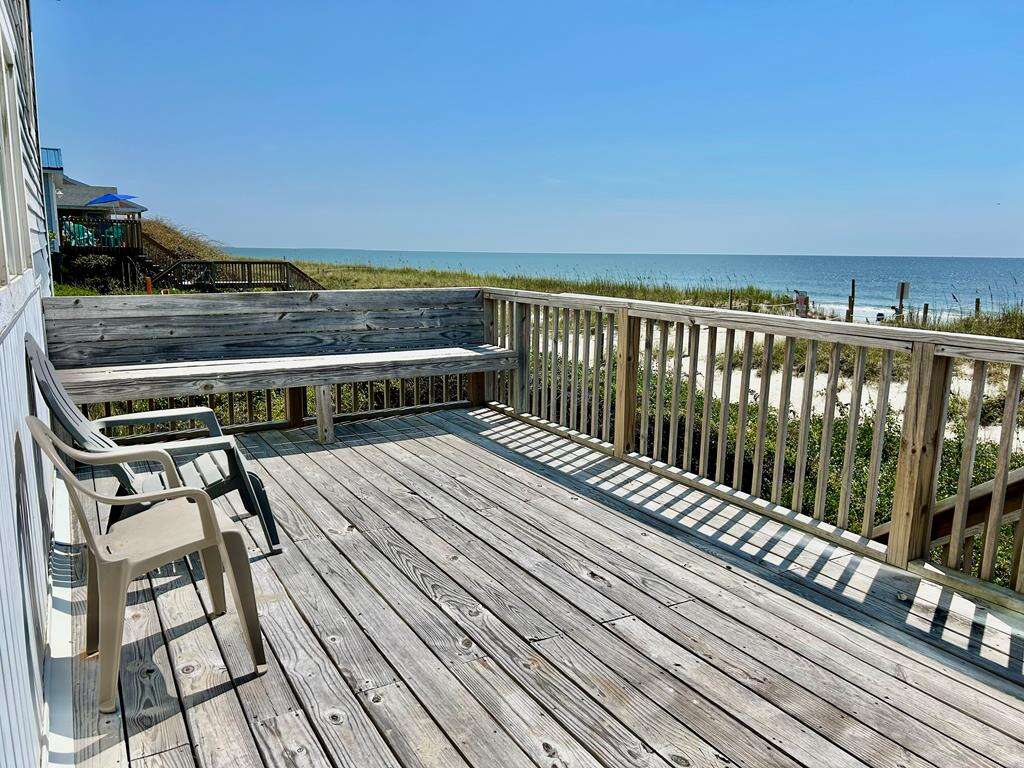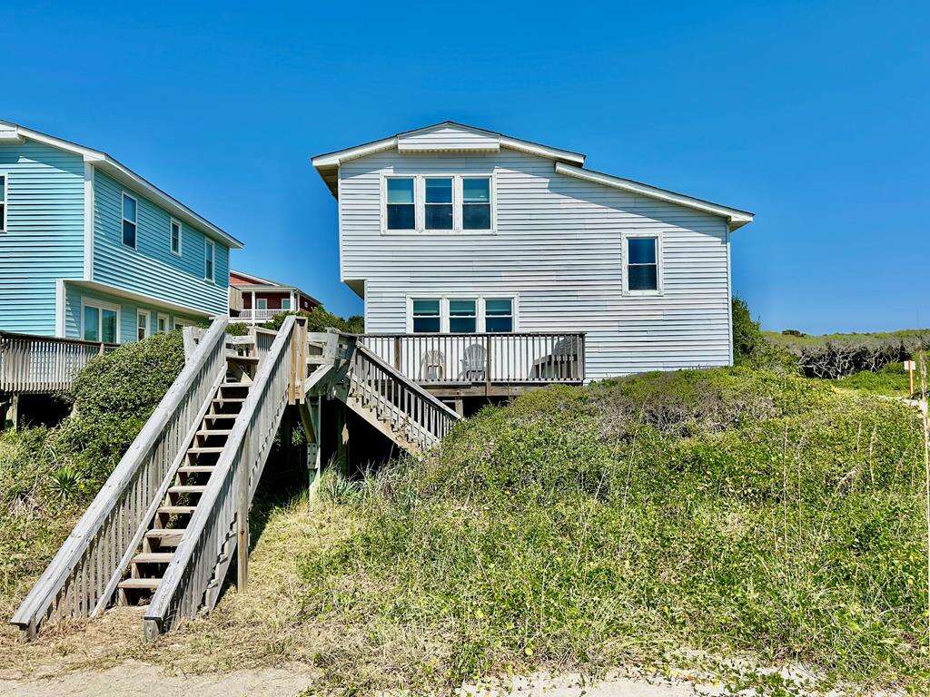 This charming, uniquely designed home offers you and your loved ones the perfect beach oasis. Enjoy a lovey, updated oceanfront home with the modern amenities and touches you desire, but still keeping the feel of classic beach cottage character with an angled beam ceiling on the lower level. Luxury plank flooring throughout, plus a beautiful open-concept living, dining and kitchen on the lower level, makes for comfort and ease on your beach retreat as you enjoy gorgeous ocean views. The kitchen is thoughtfully designed for making culinary creations a breeze, with a large island for extra cooking prep space, as well as breakfast bar seating. Everyone can be in on the fun! Travel up to the middle level where 2 bedrooms share a full guest bath in the hallway. Then, up on the top level the remaining 2 bedrooms share a Jack-n-Jill bath. This home is ideal for families, couples or a group of friends! Just outside, you can lounge on the oceanfront sun deck soaking in warm, salty ocean breezes and listen to the lullaby if the waves roll onto shore. Just steps away from the deck, spend the day on the shore building sandcastles and enjoying long walks on the beach at sunrise and sunset. Nearby, experience the sights and sounds of the Intracoastal Waterway, as well as Blue Water Point Marina, and enjoy casual seafood dining on the water at Lonerider Restaurant. Travel down to The Point for spectacular sunset views over the inlet. You might even catch a glimpse of a pod of dolphins as they swim by or pelicans flying in formation overhead.