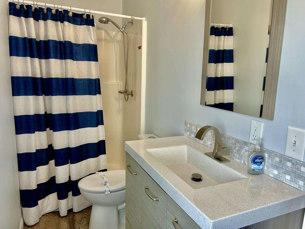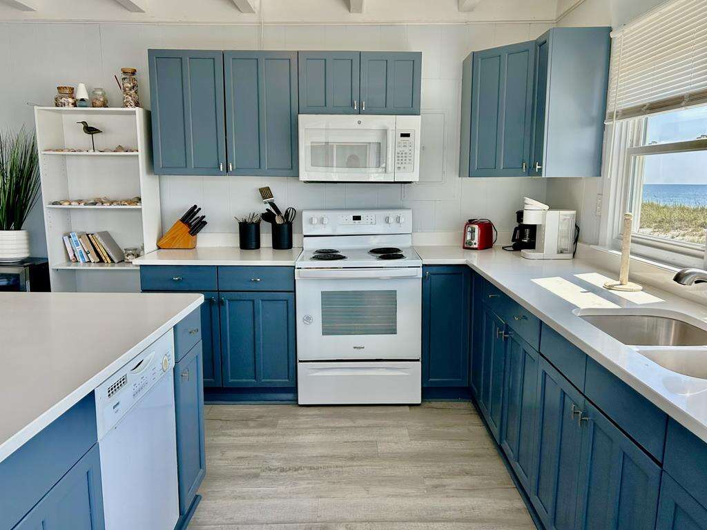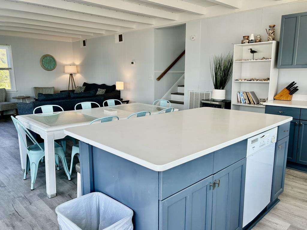 - Fully Equipped Kitchen: Quartz countertops. Island breakfast bar with seating. Refrigerator. Electric range with cooktop. Dishwasher. Mini-fridge. Built-in microwave. Keurig coffee maker. Dishes, utensils, cookware.
