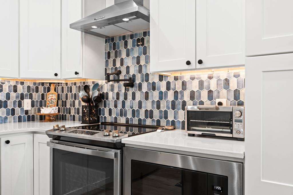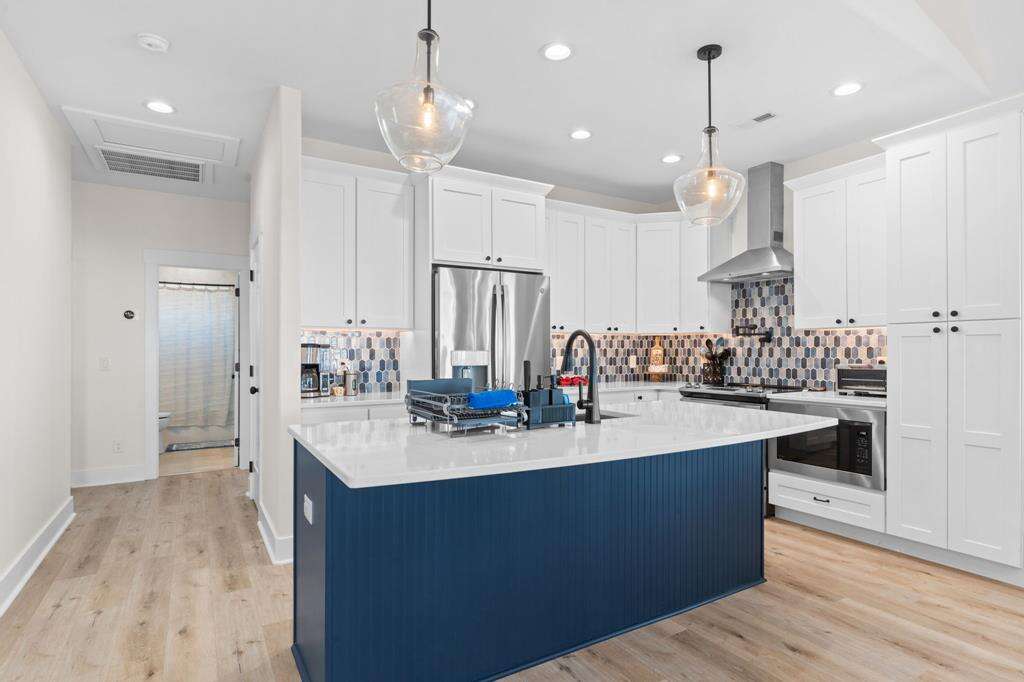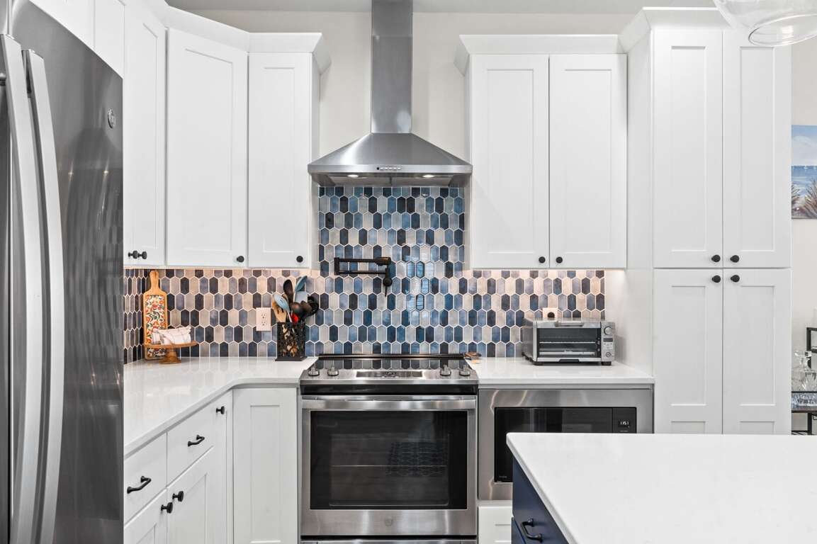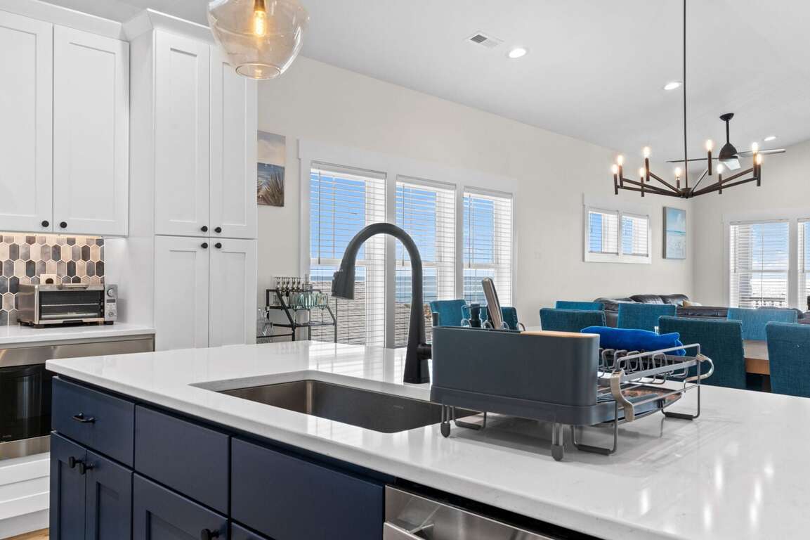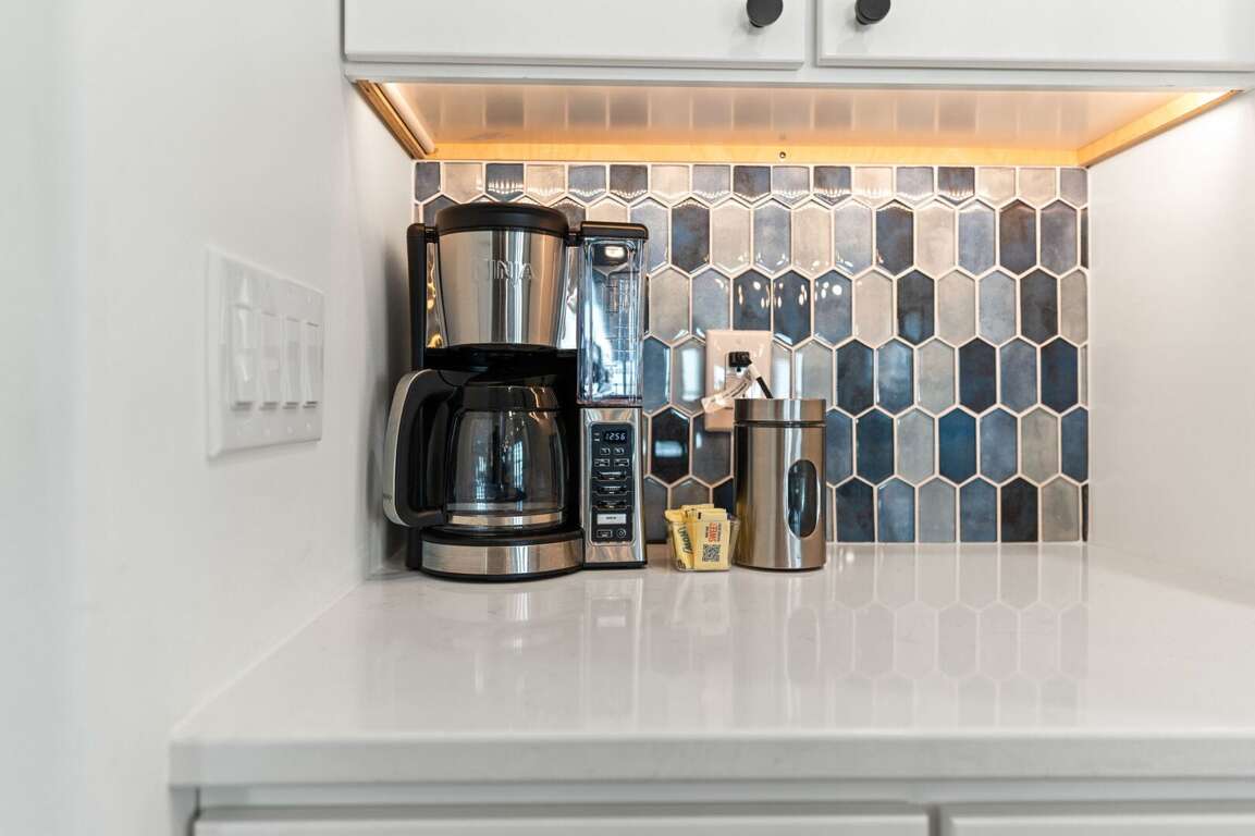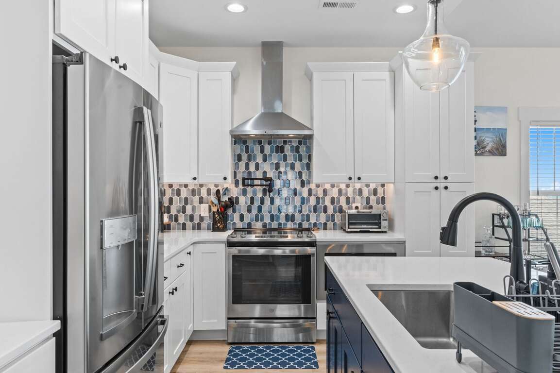 - Kitchen: Quartz countertops. Large island breakfast bar. Stainless-steel appliances. Refrigerator with ice maker. Electric ranger with flat-surface cooktop. Dishwasher. Microwave. Crockpot. Griddle. Air fryer. Toaster. Keurig and drip coffee makers. Blender. Stock pot.