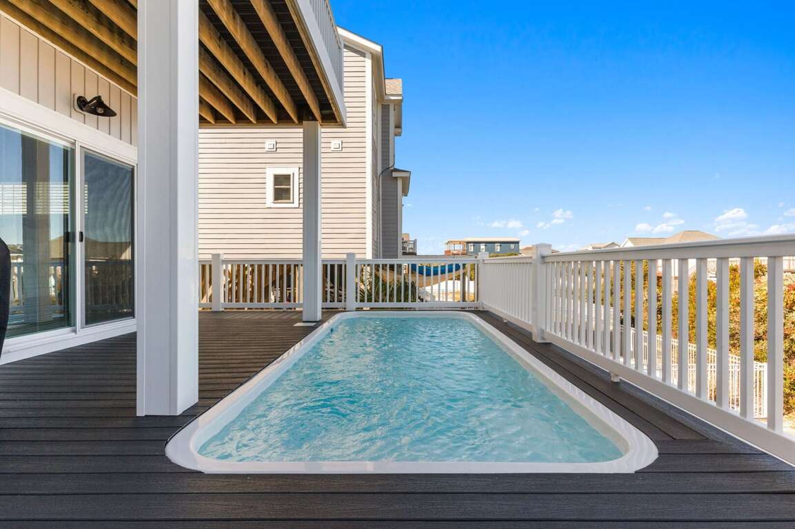 2nd-row house vacation rental in Oak Island with ocean views, an in-deck saltwater pool, elevator, EV charger, and room for up to 18 guests.