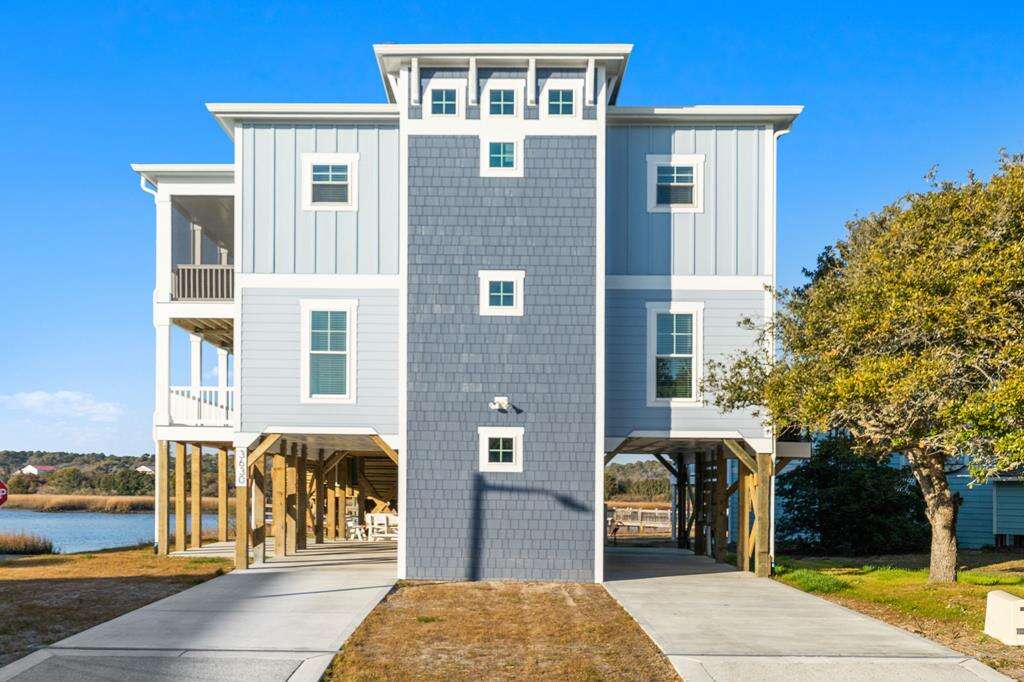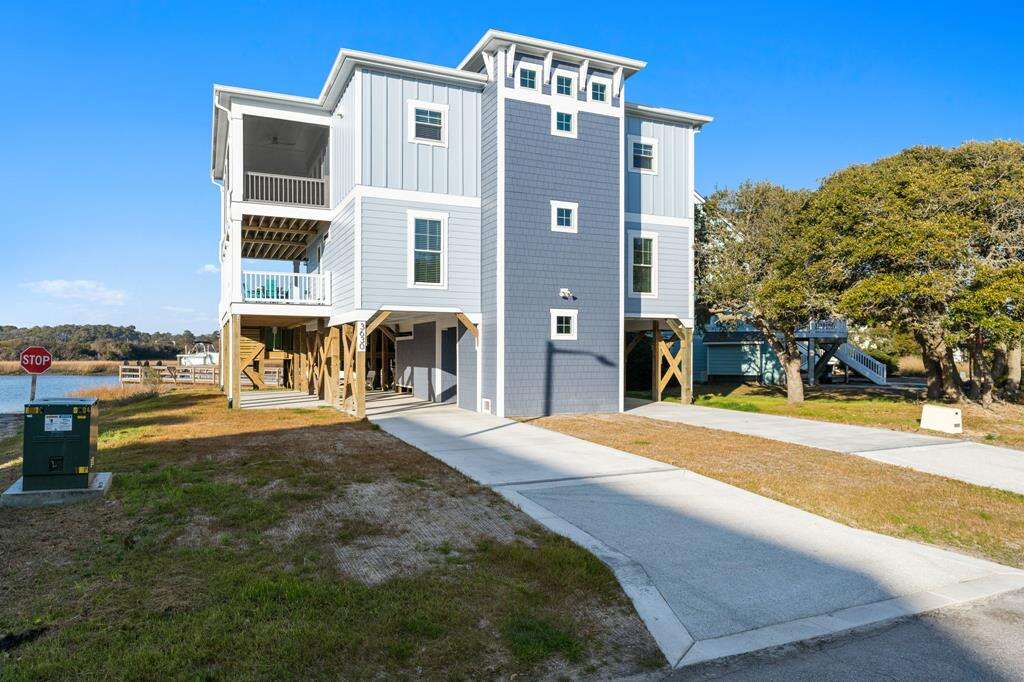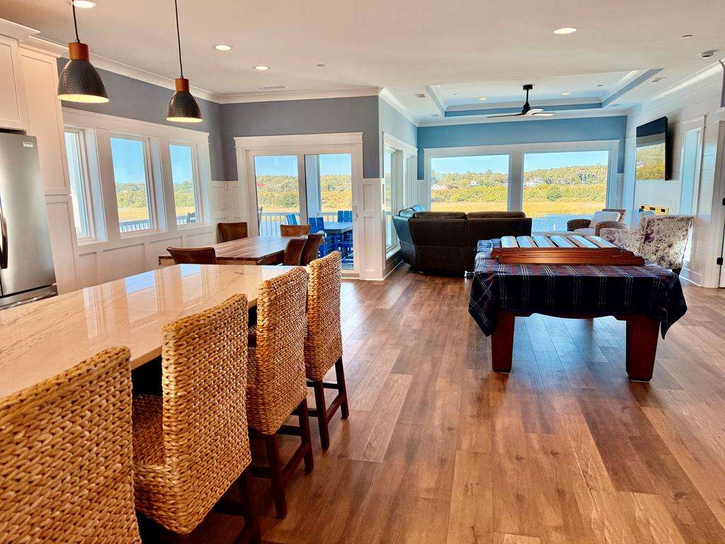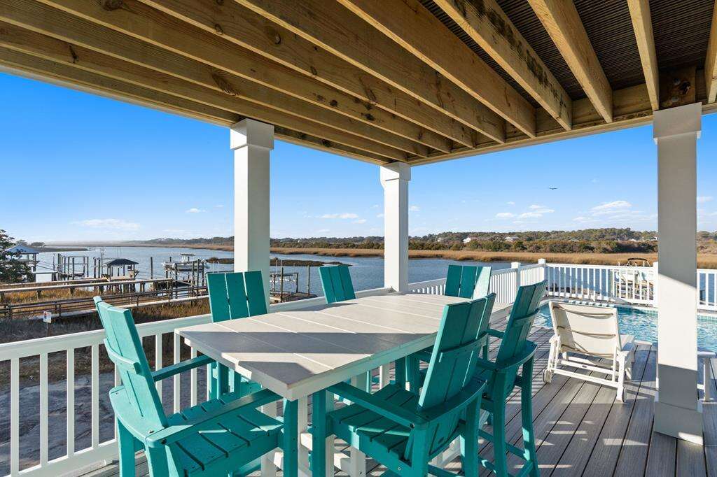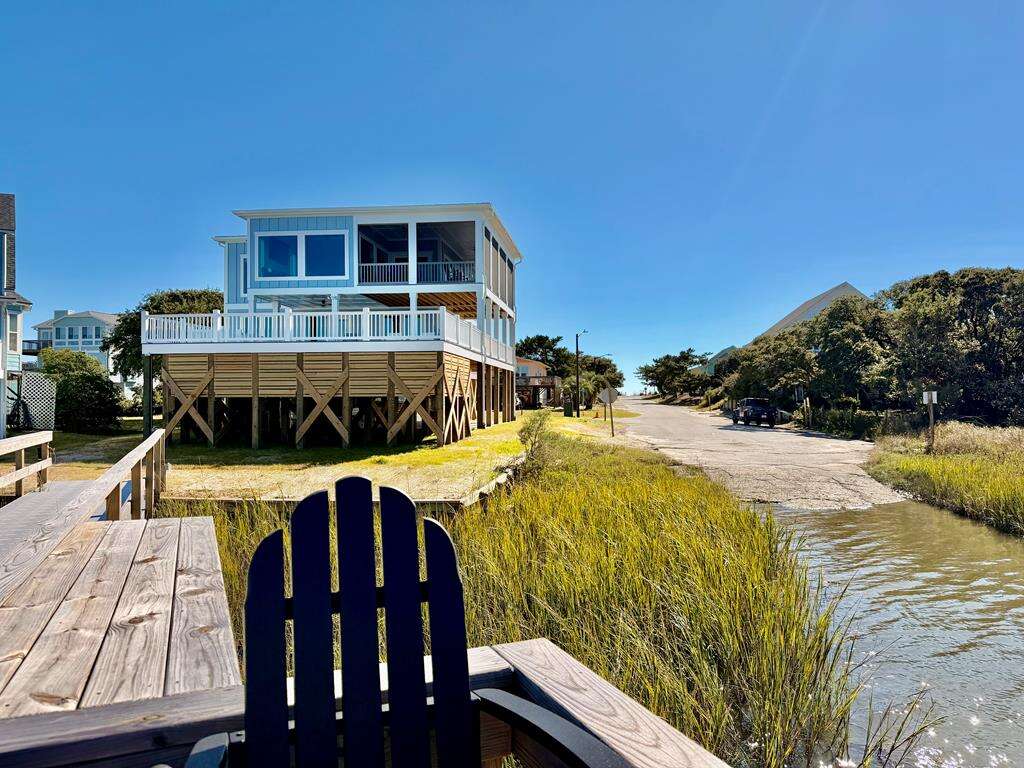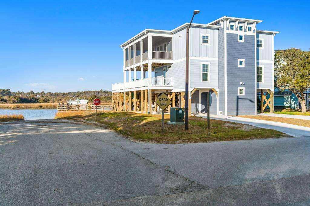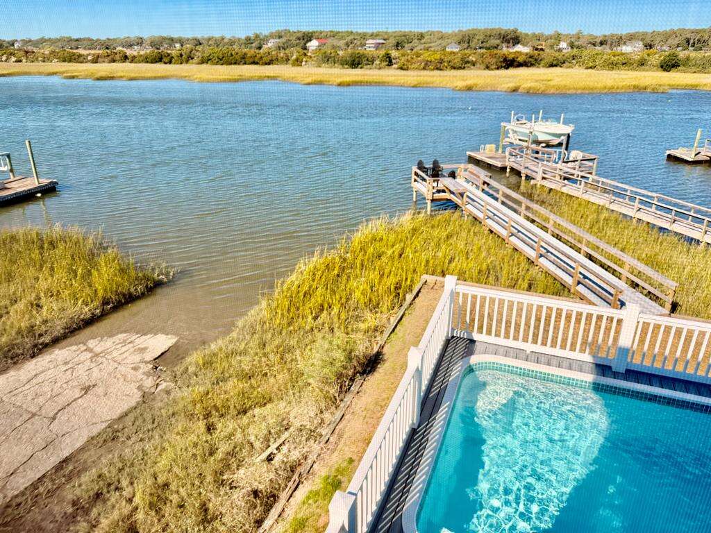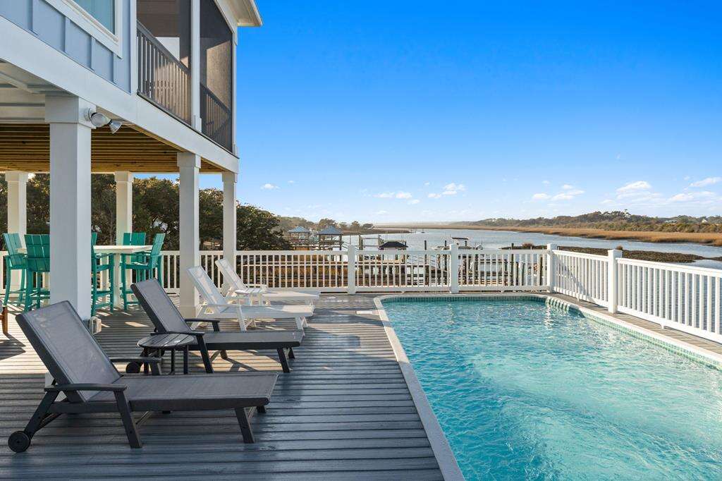 This newly constructed home is ideally located on a corner lot on Oak Island's west end, giving you access to various bodies of water to explore! Such a fantastic and rare find to be right next to a Public Water Access with the beach access just a short walk down the same street! Plus, a public boat ramp a few blocks away! Water lover's will never want to leave! Inside, this home is perfectly suited for unforgettable comfort and relaxation to be able to unwind when you are not out at the water. With a reverse, open-concept floor plan you will find the top level offers a very spacious main great room, dining and kitchen, as well as a primary king bedroom with private bath. The bottom floor offers the remaining 4 bedrooms - 2 bedrooms are kings, each with their own private bath, and the other 2 bedrooms offer a king in one and 2 bunk beds twin over twin in the other. These 2 bedrooms share a hallway bath. There is also a 2nd living area with wet bar just off the pool deck. This 2nd living area also offers extra sleeping space with a double sleeper sofa. Get ready to make Docks and Dunes your new sweet spot at the beach! This rare find won't last long, so make your reservation today before this island treasure gets taken!!!!