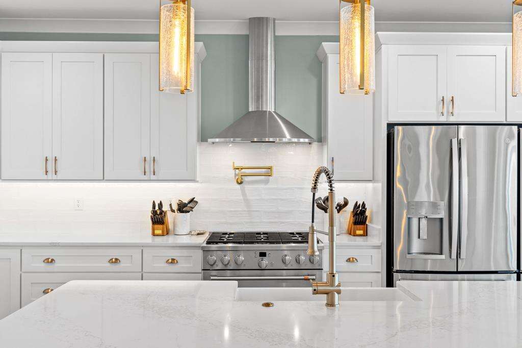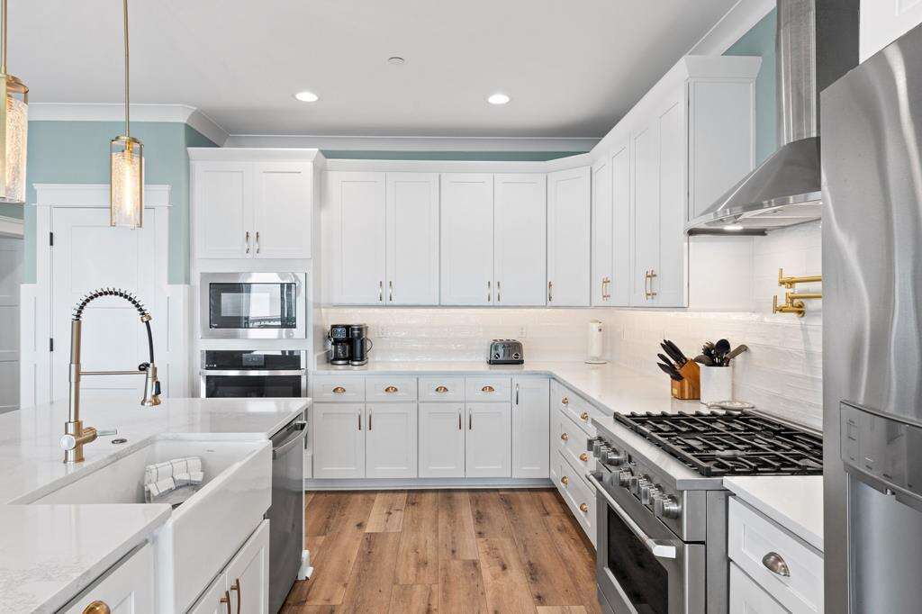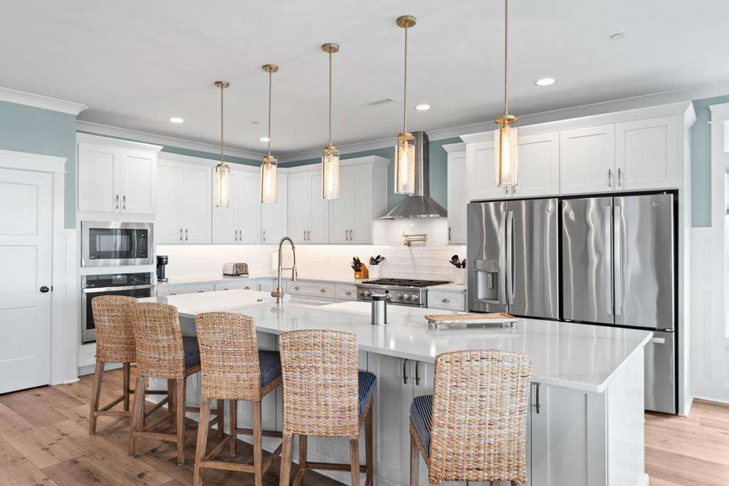 - Spacious gourmet kitchen with granite countertops, large island breakfast bar, stainless-steel appliances, 2 refrigerators, gas range and cooktop, wall oven, built-in microwave