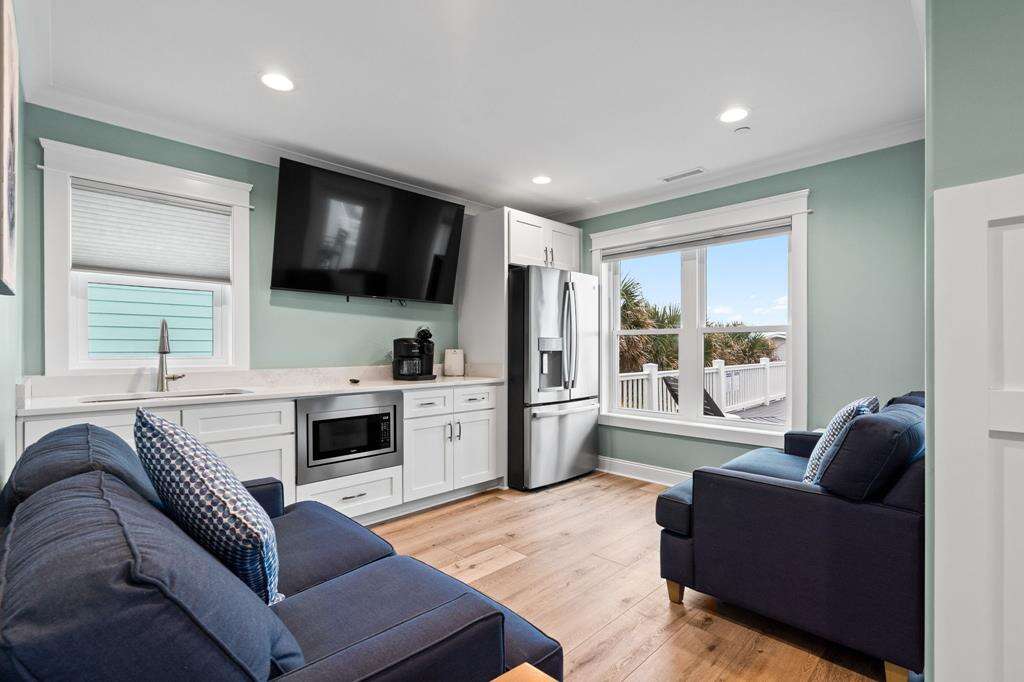 - 2nd living area with kitchenette (includes full-size fridge, microwave, and sink) off the pool deck