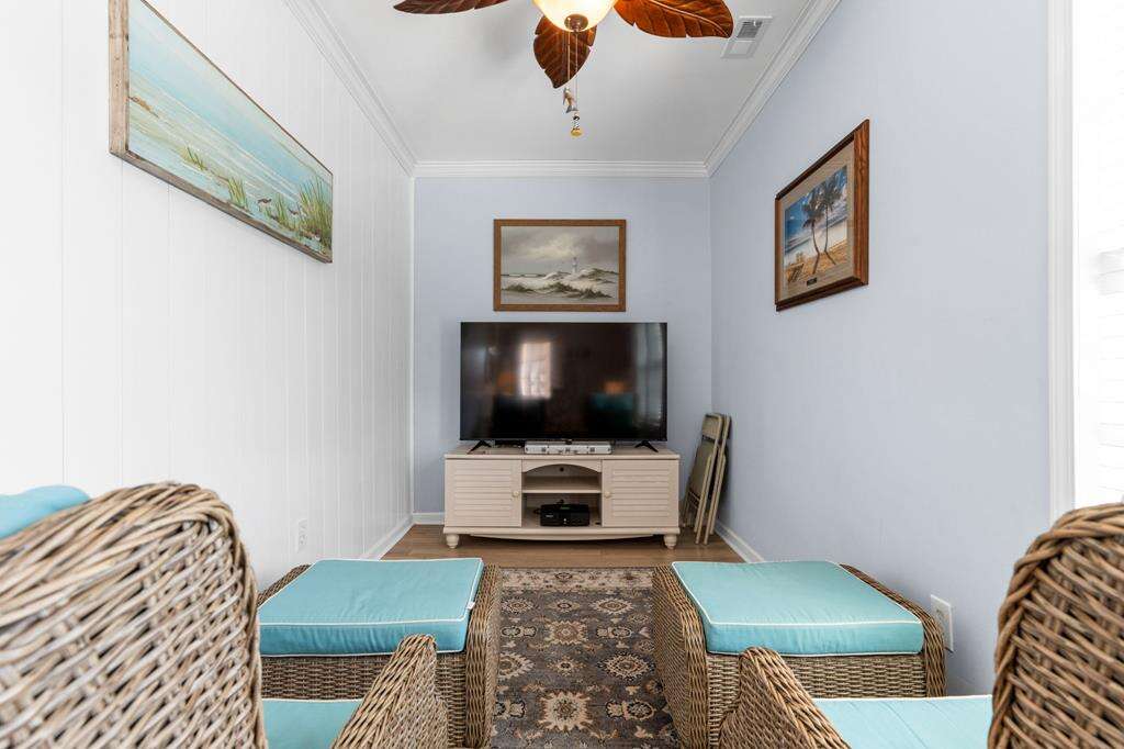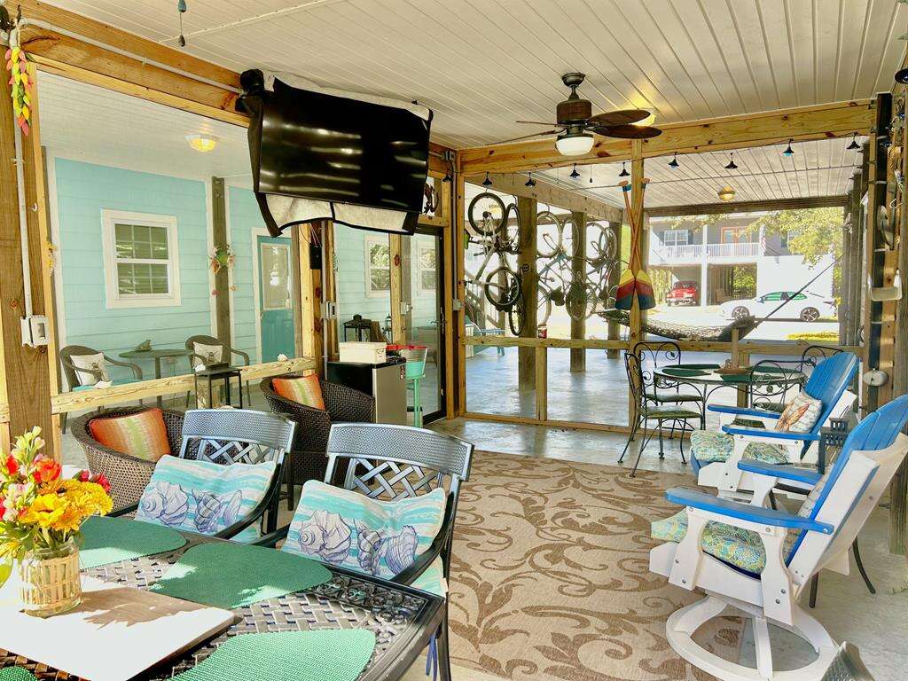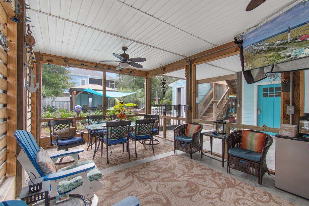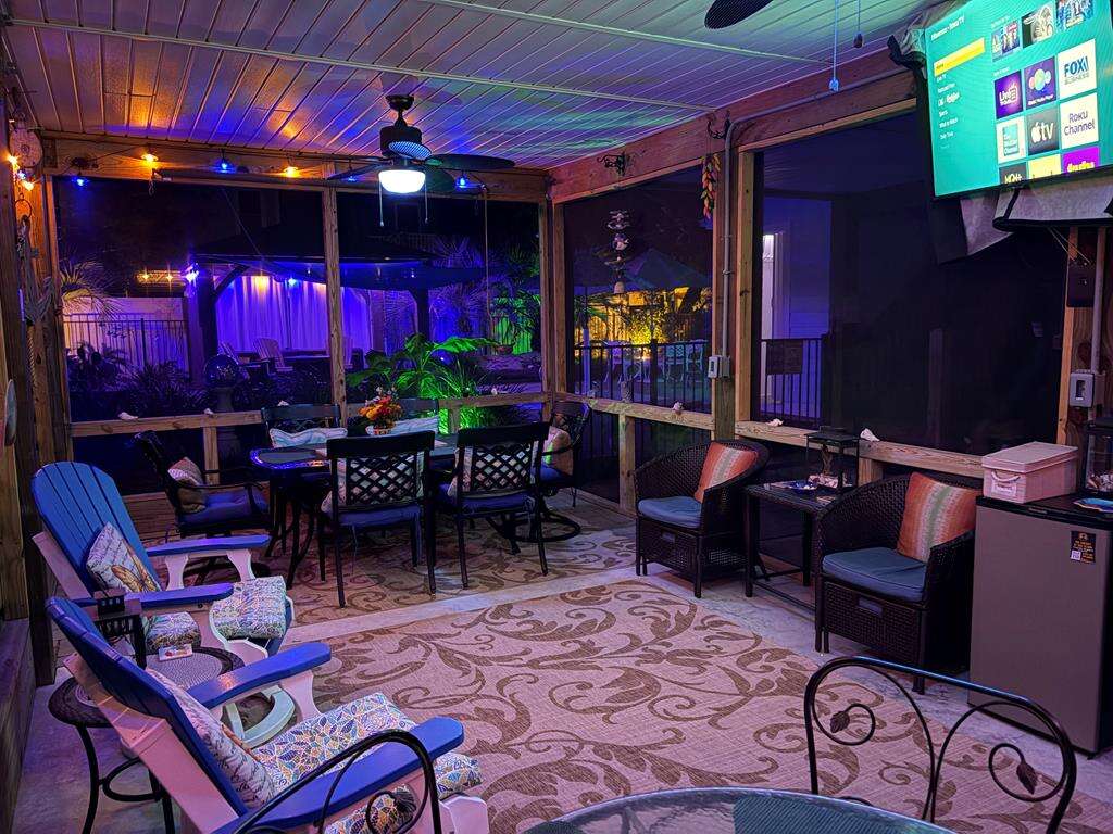 - Ground level screened patio entertainment area with TV, mini-fridge, dining table, lounge chairs, and 2 ceiling fans