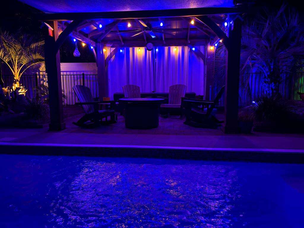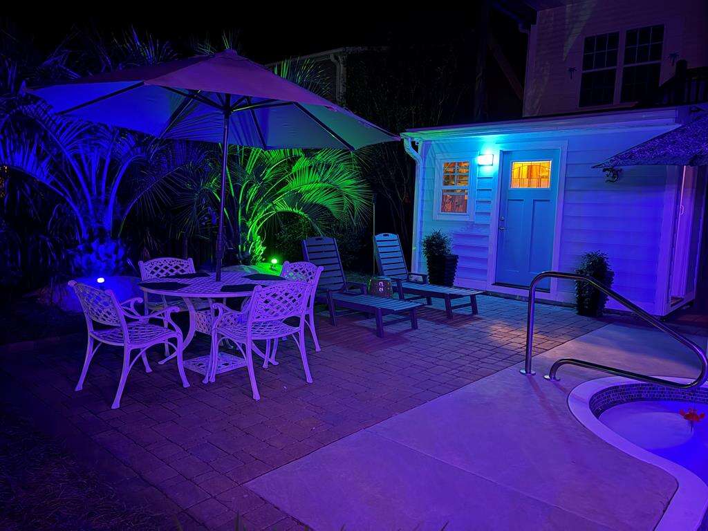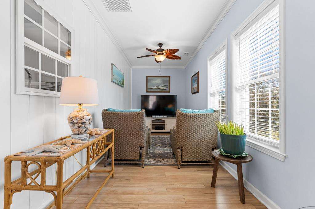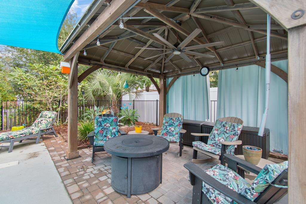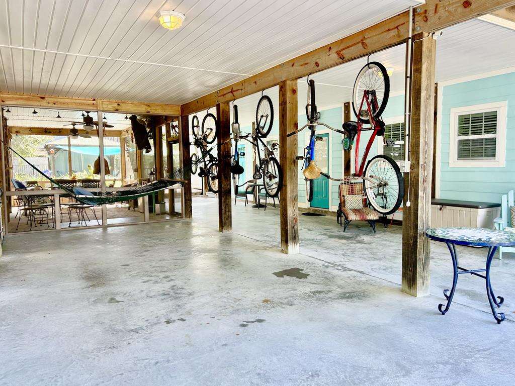 - Ground level screened patio entertainment area with TV, mini-fridge, dining table, lounge chairs, and 2 ceiling fans