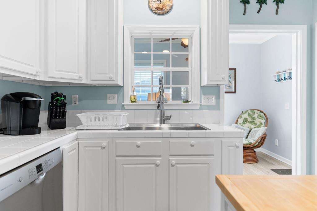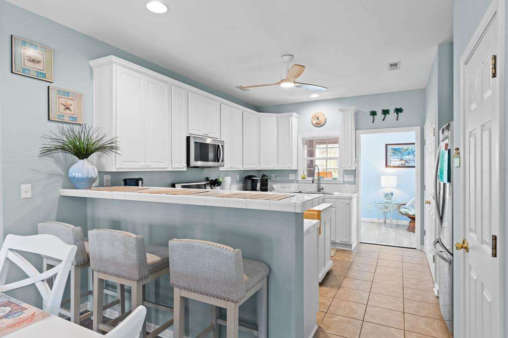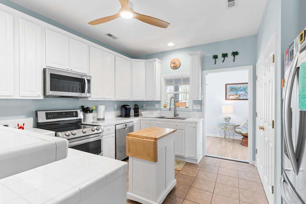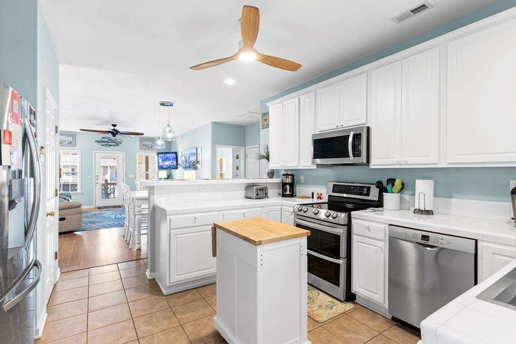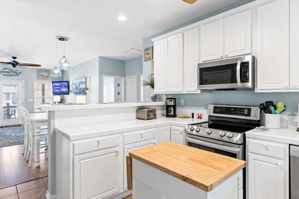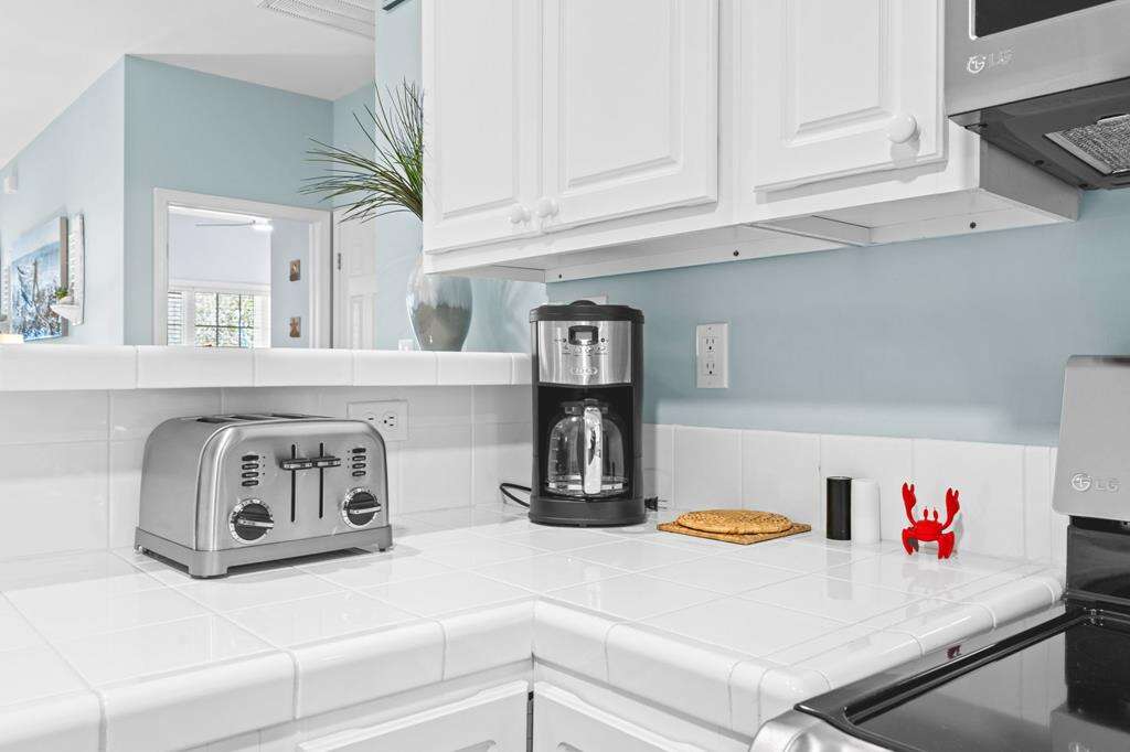 - Kitchen: Tile countertops. Small island for extra cooking prep space. Breakfast bar. Stainless-steel appliances. Refrigerator with ice maker. Electric range with flat-surface cooktop. Dishwasher. Built-in microwave. Crockpot. Griddle. Air fryer. Toaster. Keurig and drip coffee makers. Blender.