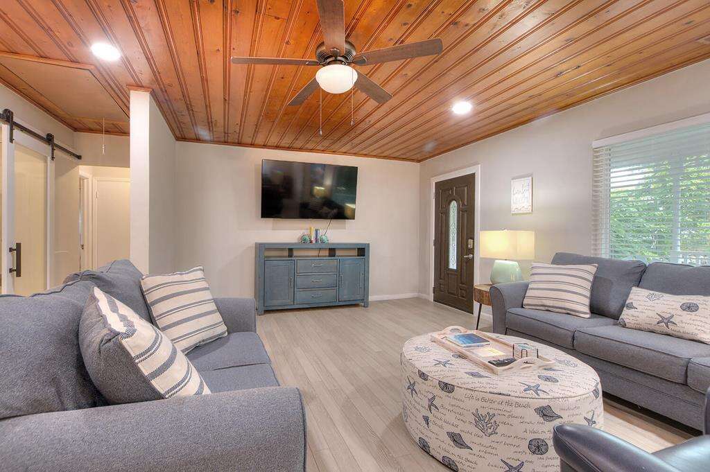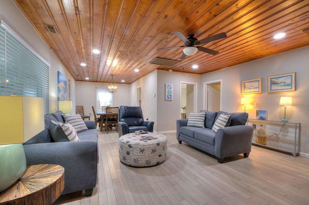 Ground-level 3-bedroom home in Oak Island with beach access at the end of the street, plus a hot tub, fire pit, and putting green—an easygoing place to stay near shops, dining, and the pier.