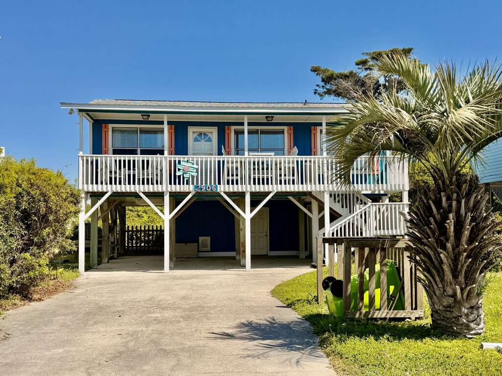 Beach Therapy is a 3-bedroom home in Oak Island with ocean views and a short walk to public beach access, a screened porch, fenced backyard, and outdoor shower—an easy place to stay near parks and shops.