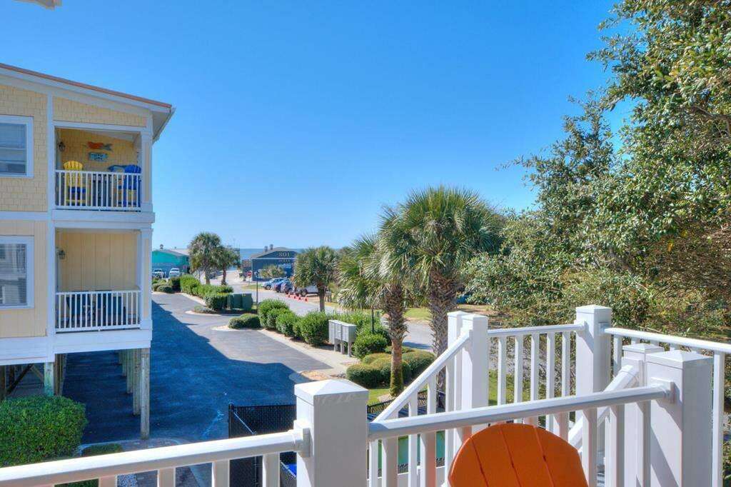 Duplex-style home in Oak Island with two separate exterior-entry levels, ideal for groups needing space; this vacation rental includes 7 queen bedrooms, two kitchens, and an ocean-view deck near the pier.