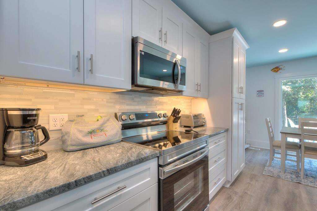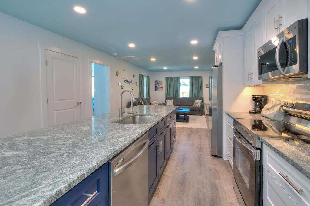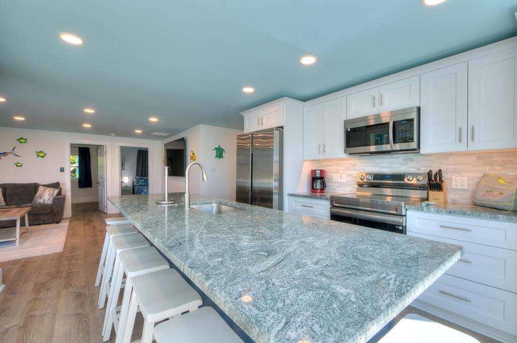 - 2 Kitchens (one on each level): Granite countertops. 2 Large island breakfast bars. Stainless-steel appliances. 2 Refrigerators. 2 Electric ranges with flat-surface cooktops. 2 Dishwashers. 2 Built-in microwaves. Crockpot. Griddle. Toaster oven. Toaster. Blender. Drip coffee makers. Stock pot.