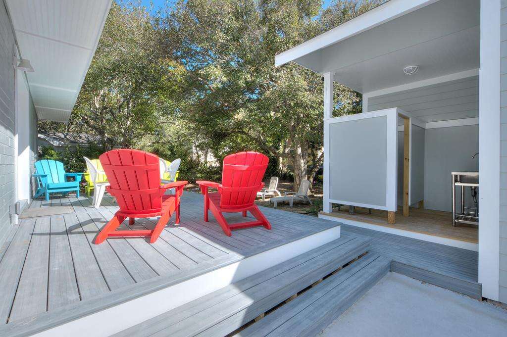 Lower-level duplex vacation rental in Oak Island with 4 queen bedrooms for groups, near the pier and beach access, plus a backyard fire pit and outdoor shower for easy post-beach cleanup.