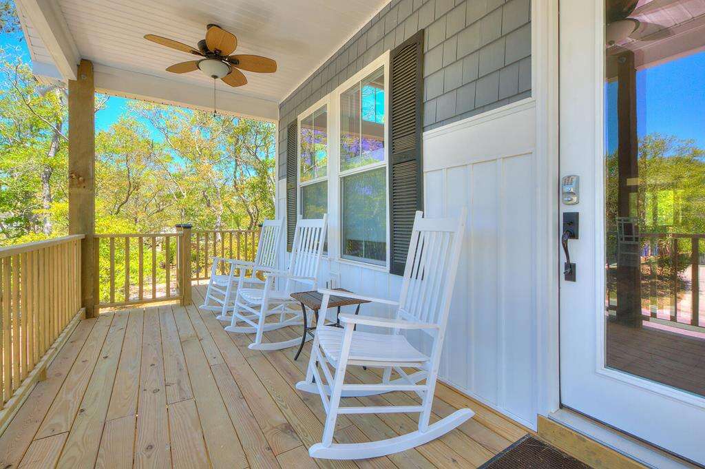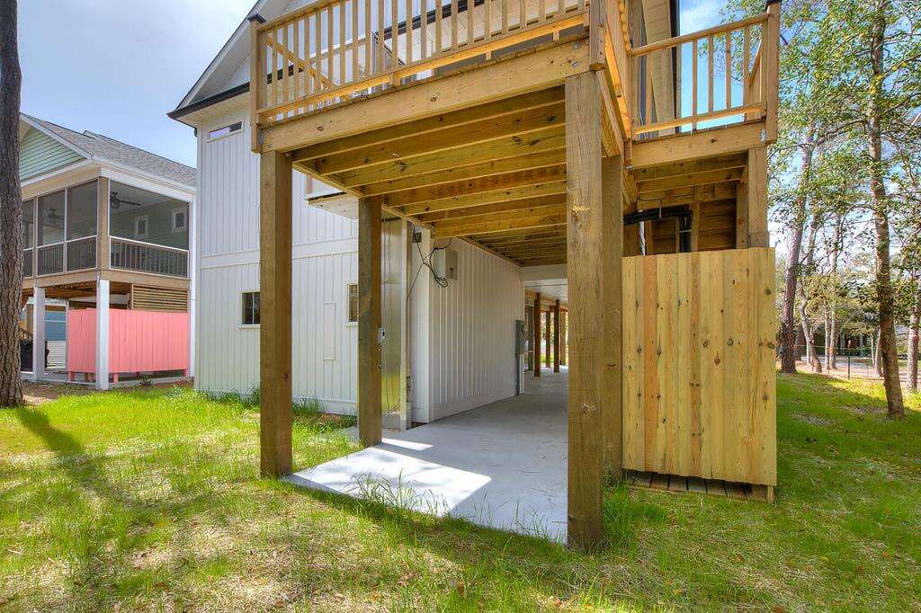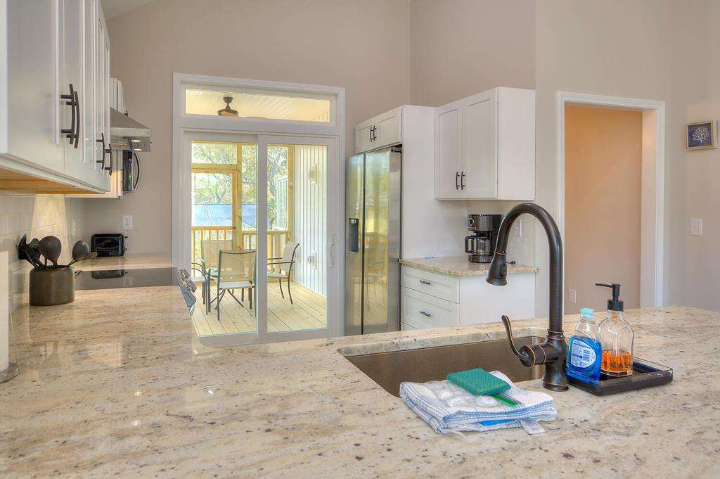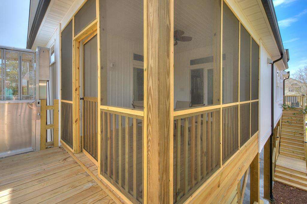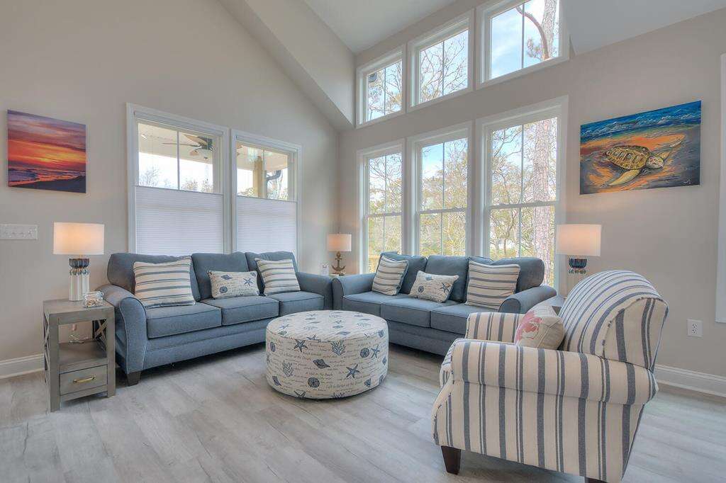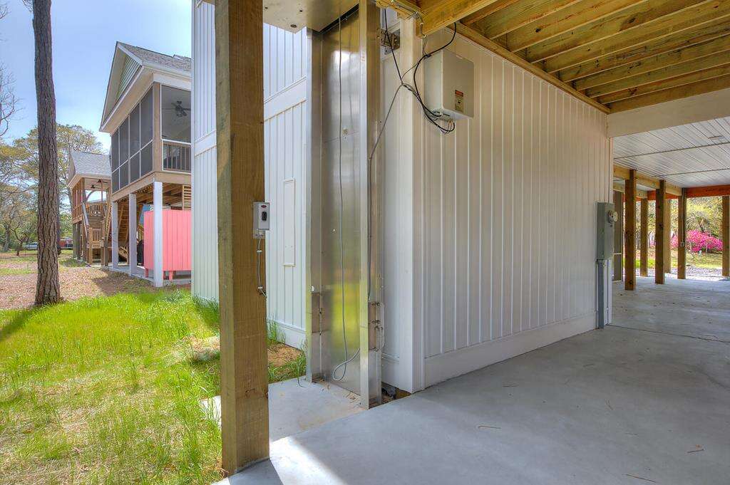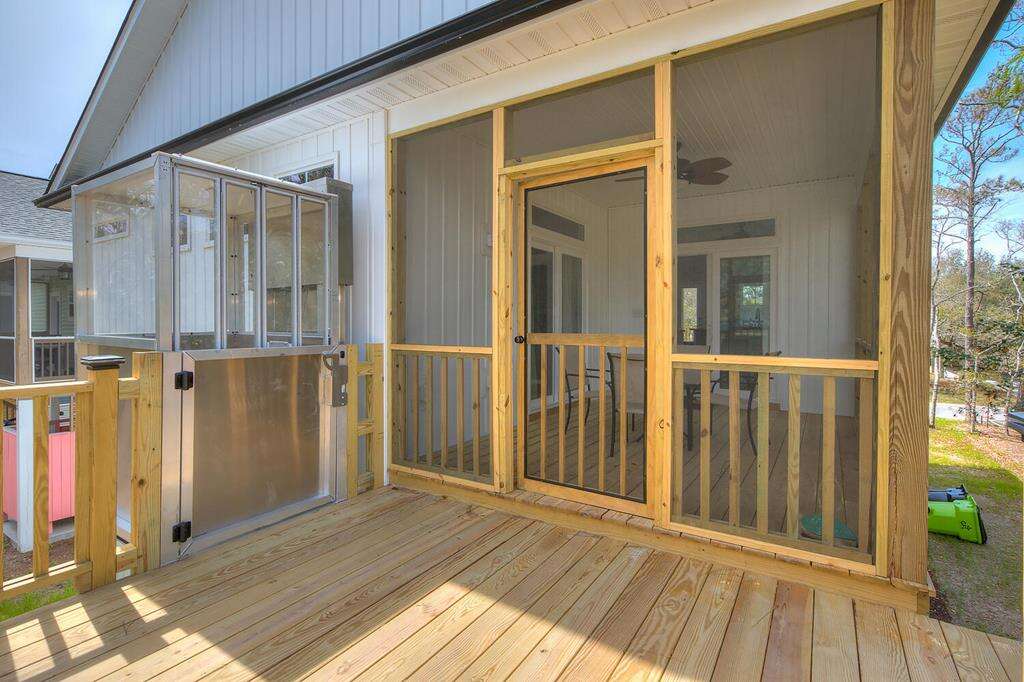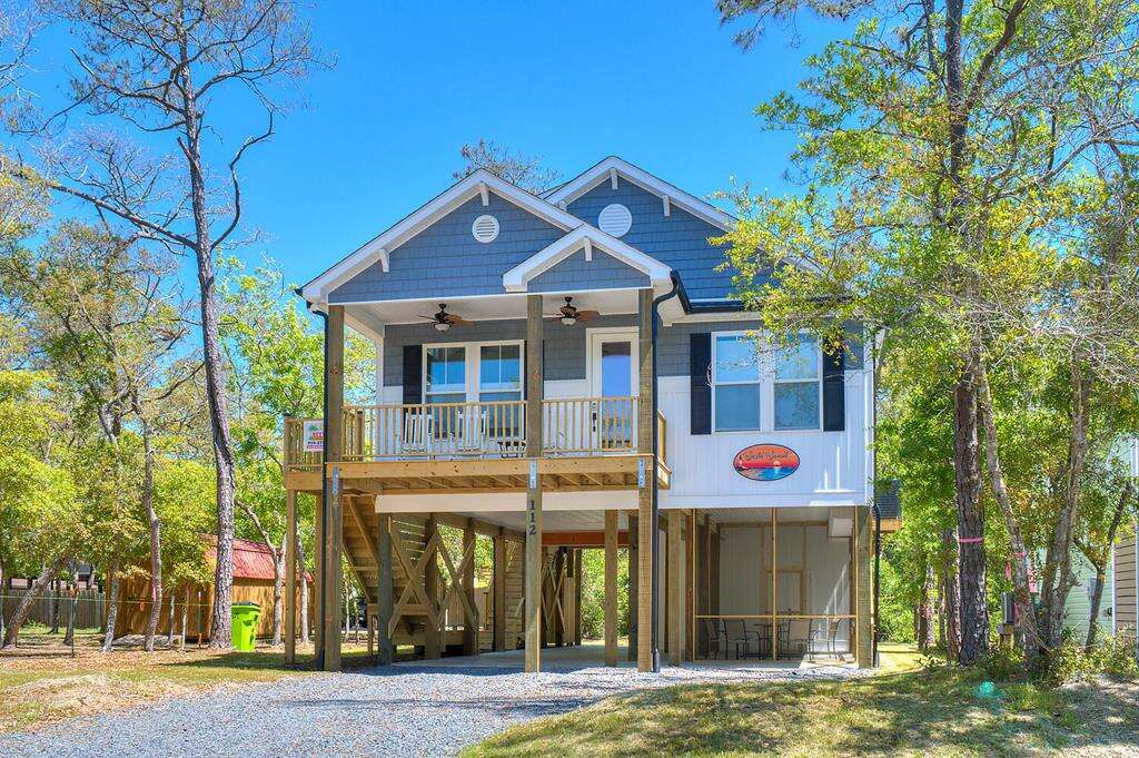 New-construction house in Oak Island with a gourmet kitchen, screened porch, and outdoor elevator; a practical vacation rental home near nature trails, piers, fishing, shopping, and Southport.