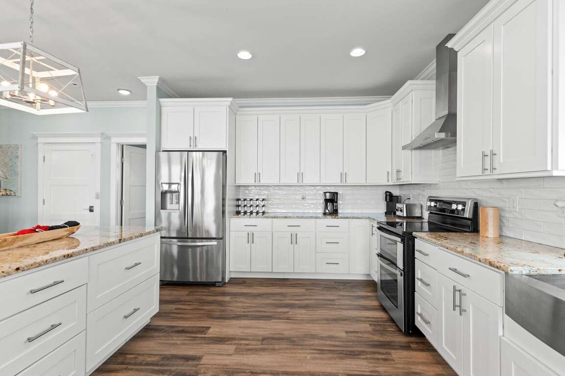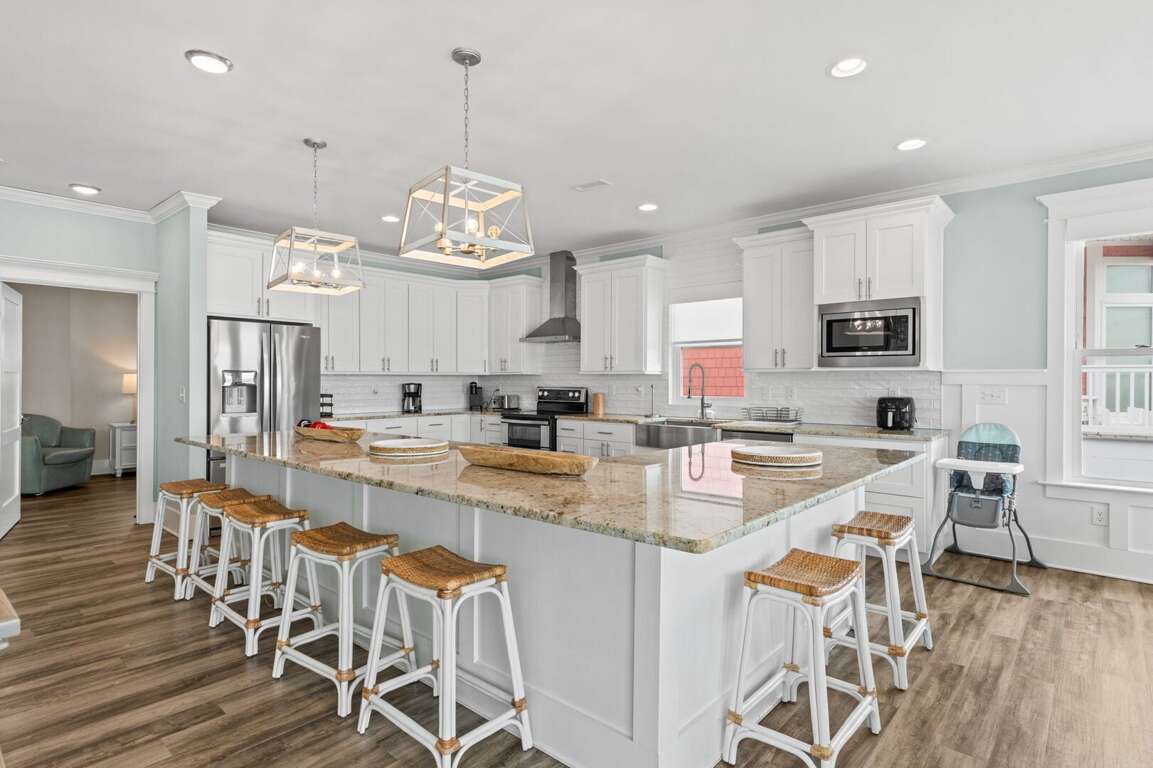 - Spacious Gourmet Kitchen (fully equipped): Granite countertops. Large island breakfast bar with extra cooking prep space. Generous cabinet space. Stainless-steel appliances. Refrigerator with ice maker. Electric range with smooth surface cooktop. Dishwasher. Built-in microwave. Crockpot. Griddle. Air fryer. Toaster. Keurig and drip coffee makers. Blender.