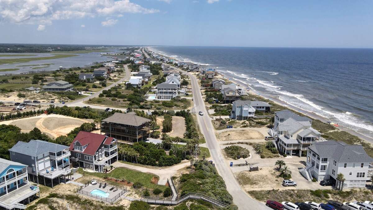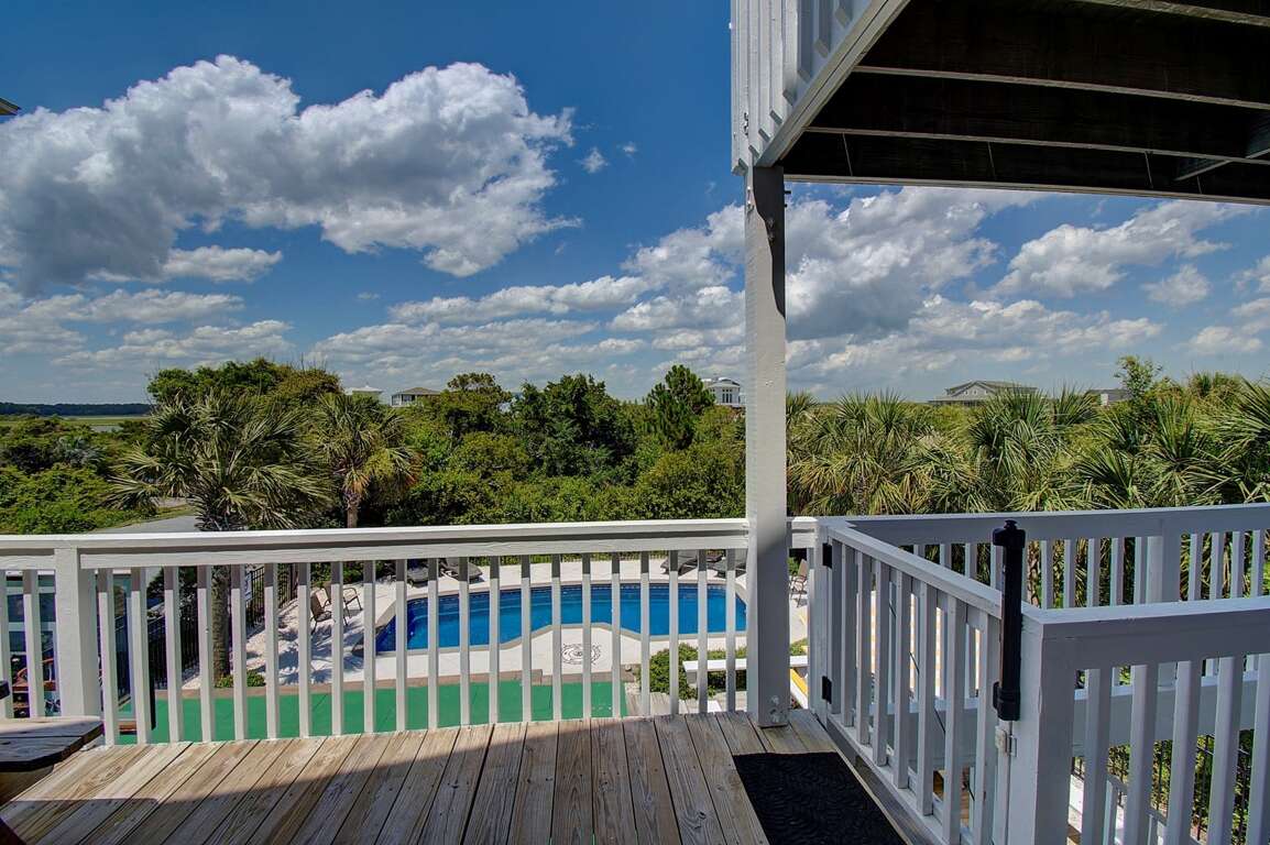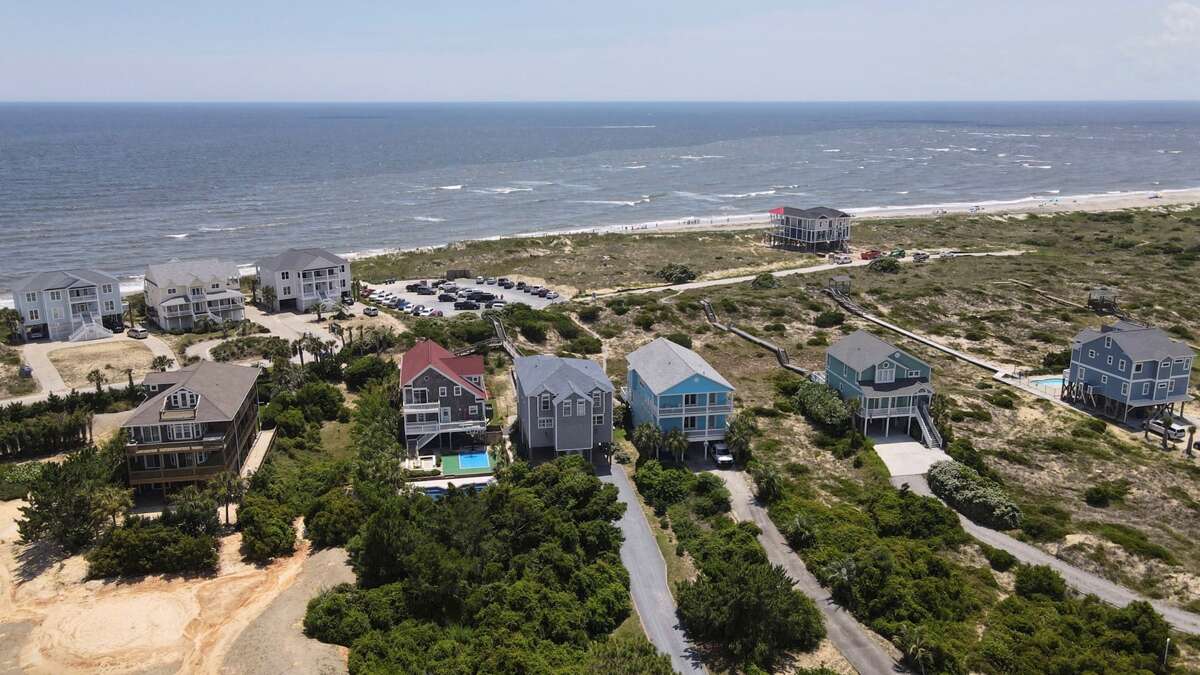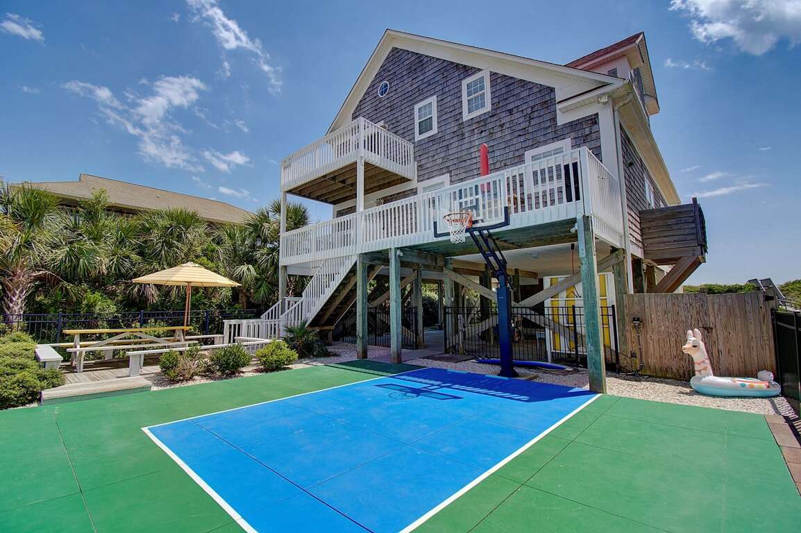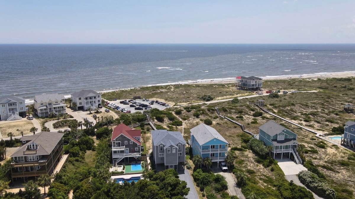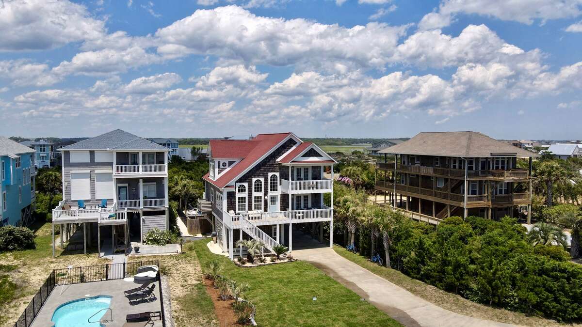 House with 5 bedrooms on Oak Island’s west end, a practical place to stay with a private pool, wet bar, two living areas, and decks for outdoor meals.