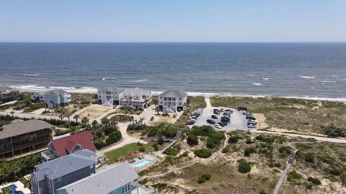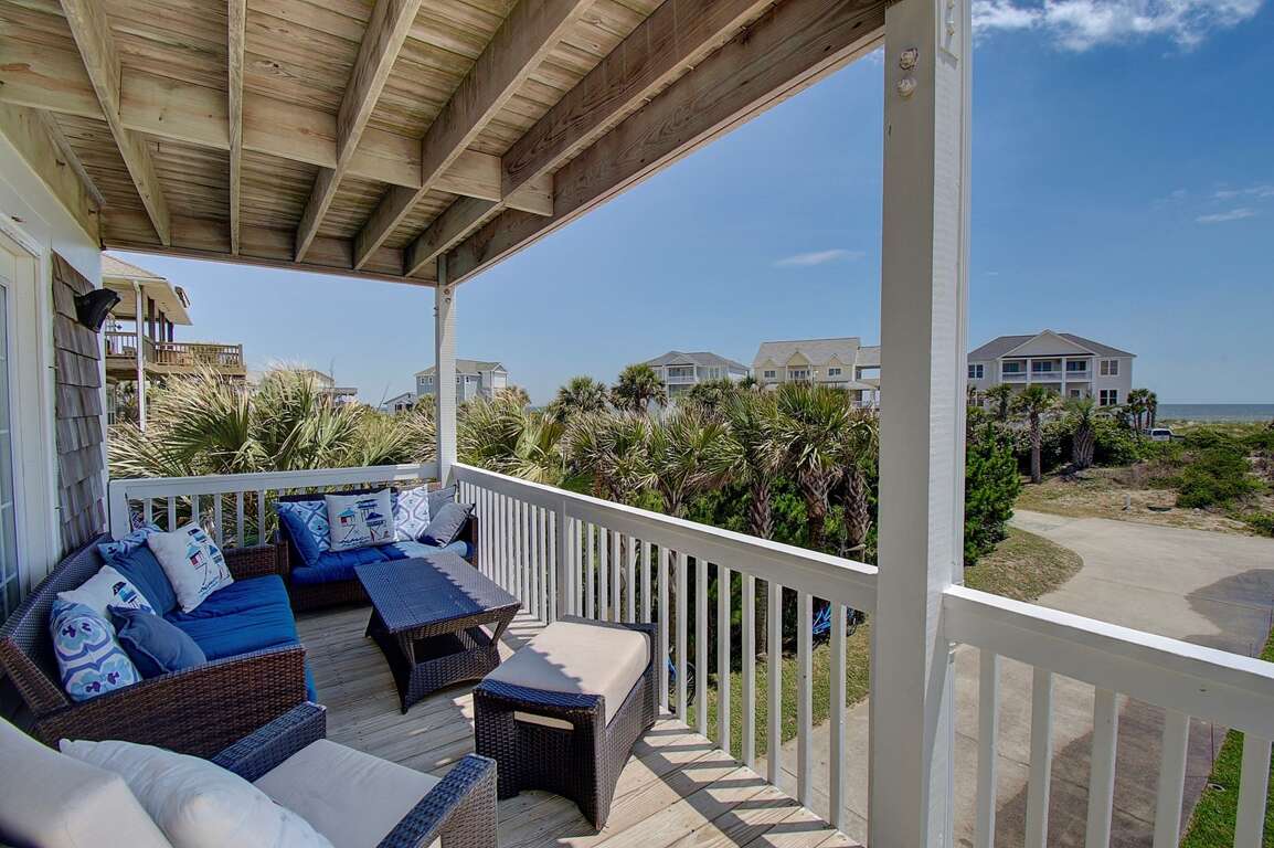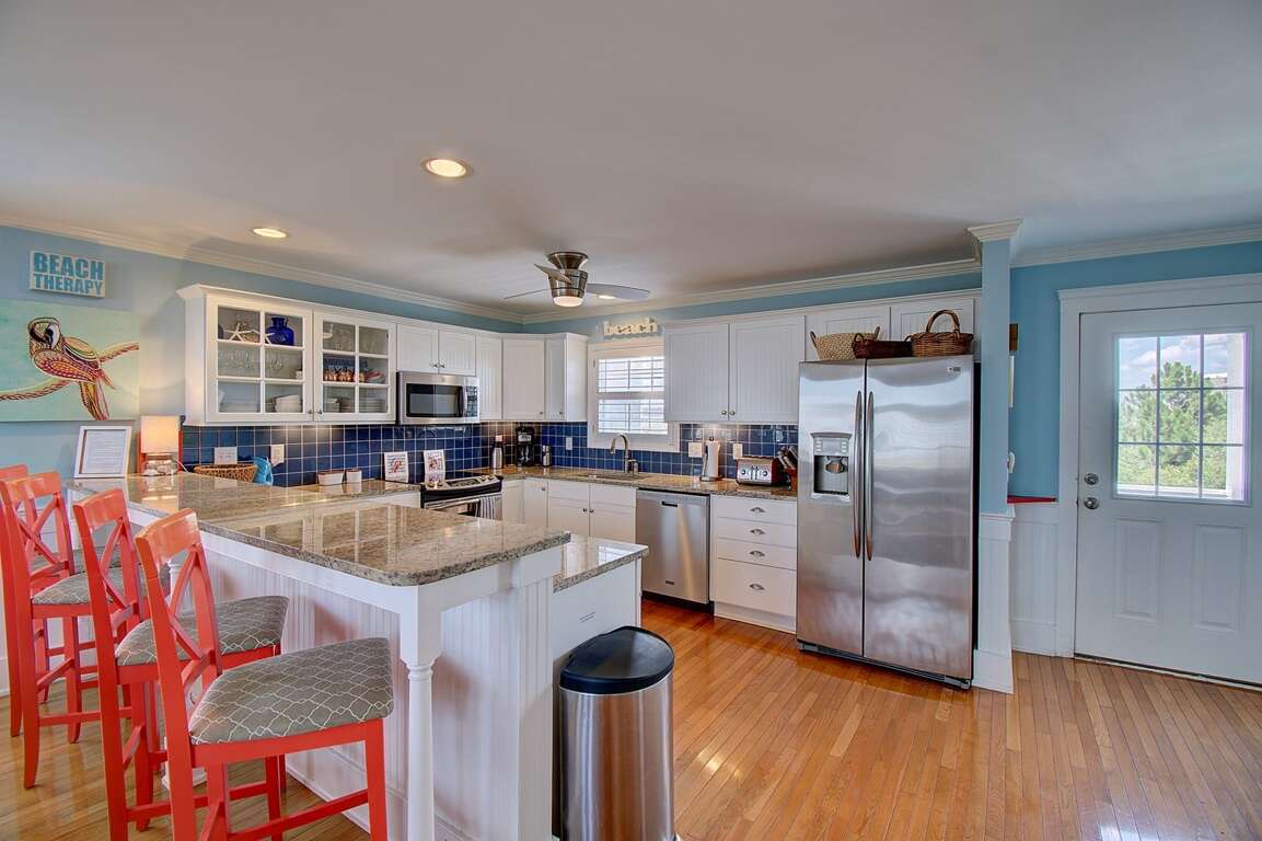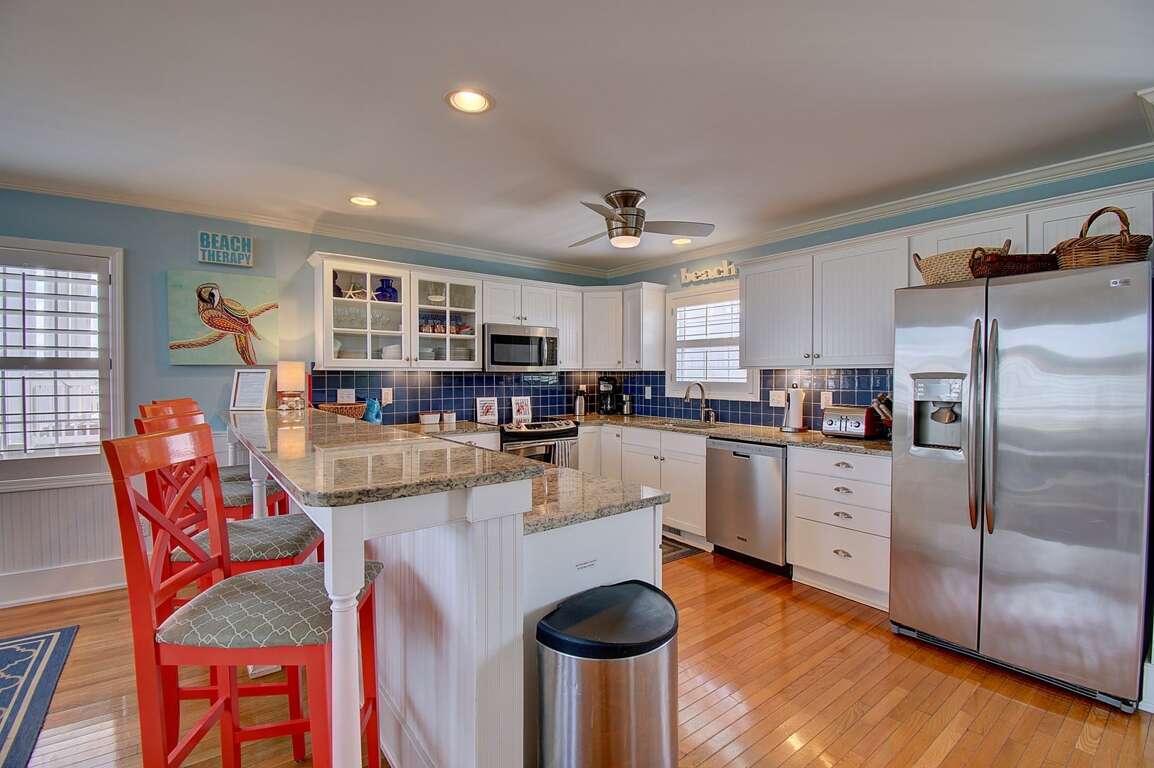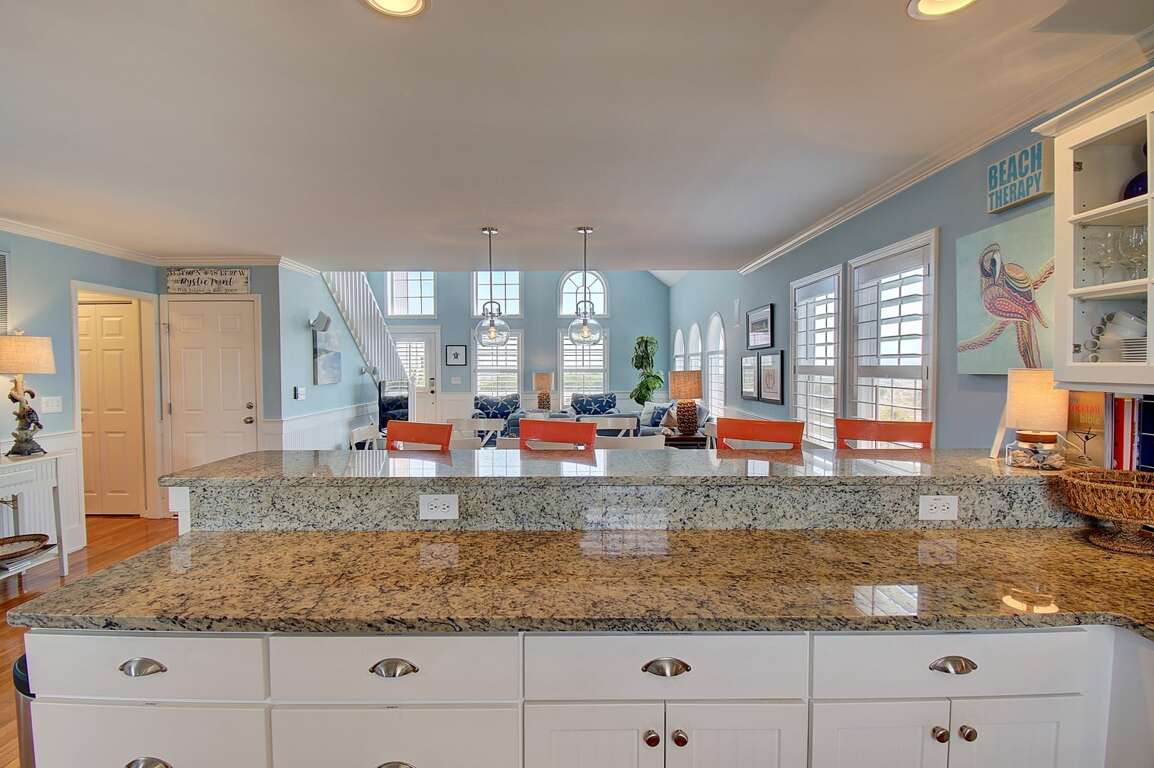 House with 5 bedrooms on Oak Island’s west end, a practical place to stay with a private pool, wet bar, two living areas, and decks for outdoor meals.