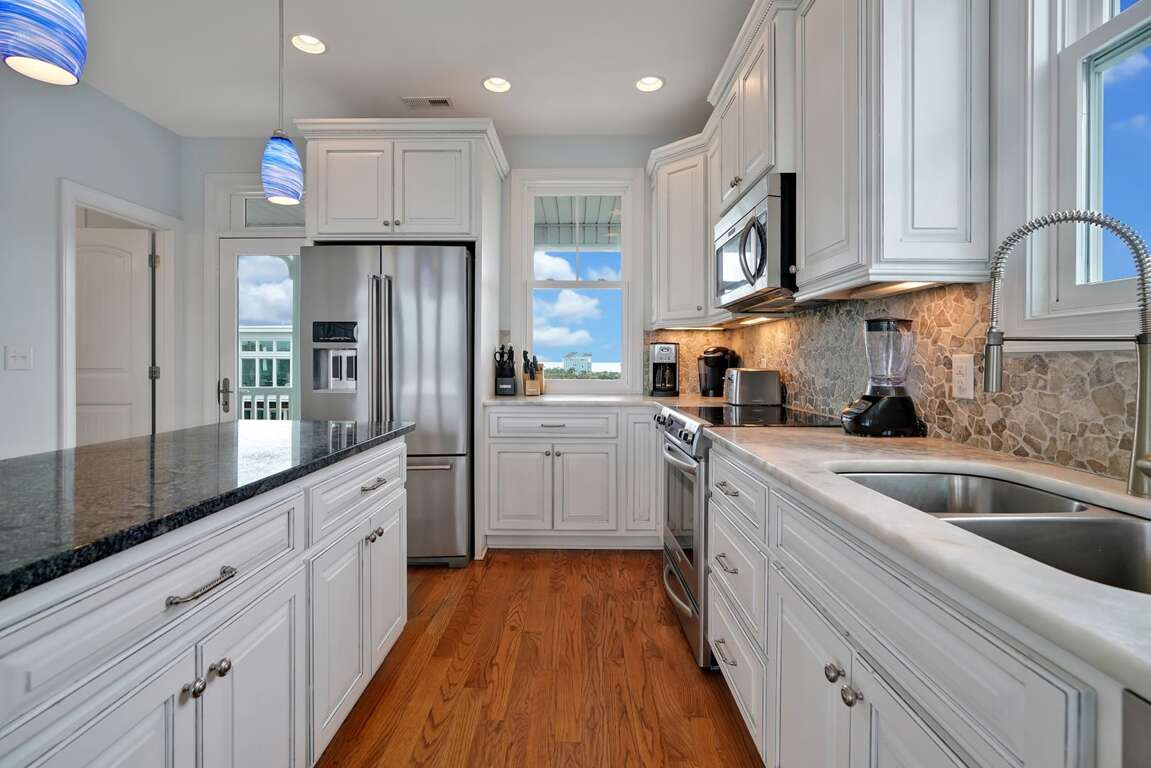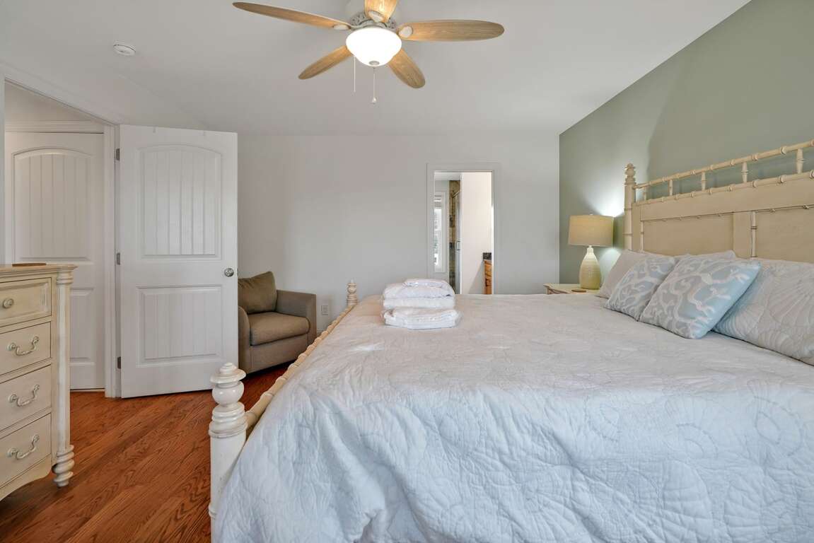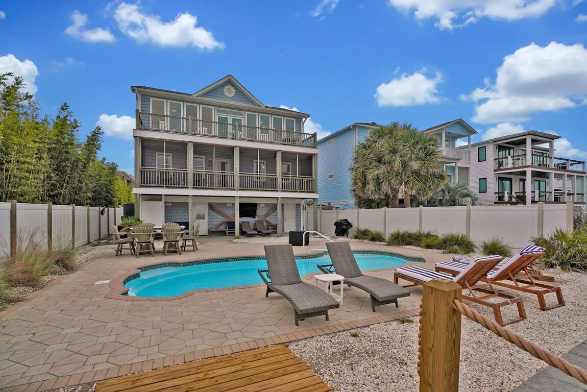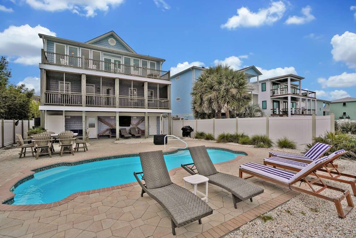 Amenities include central air conditioning and heat, ceiling fans, hardwood floors, a covered porch, a fully stocked kitchen, stainless-steel kitchen appliances, dishwasher, wireless internet access, flat screen TVs, extended cable, a grill, and a washer and dryer. Relax by the swimming pool (pool heating available for an additional fee) or walk down to the beach for endless hours of vacationing bliss!