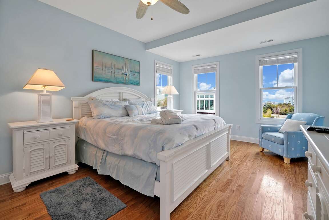 Bed sizes include 2 kings, 2 queens, and a double over double Bunk Bed. One king master on the 3rd floor with bathroom, middle level there is 1 king master with bathroom, 2 queen bedrooms with bathroom in between, double bunk beds are on the lowest level with a bath.